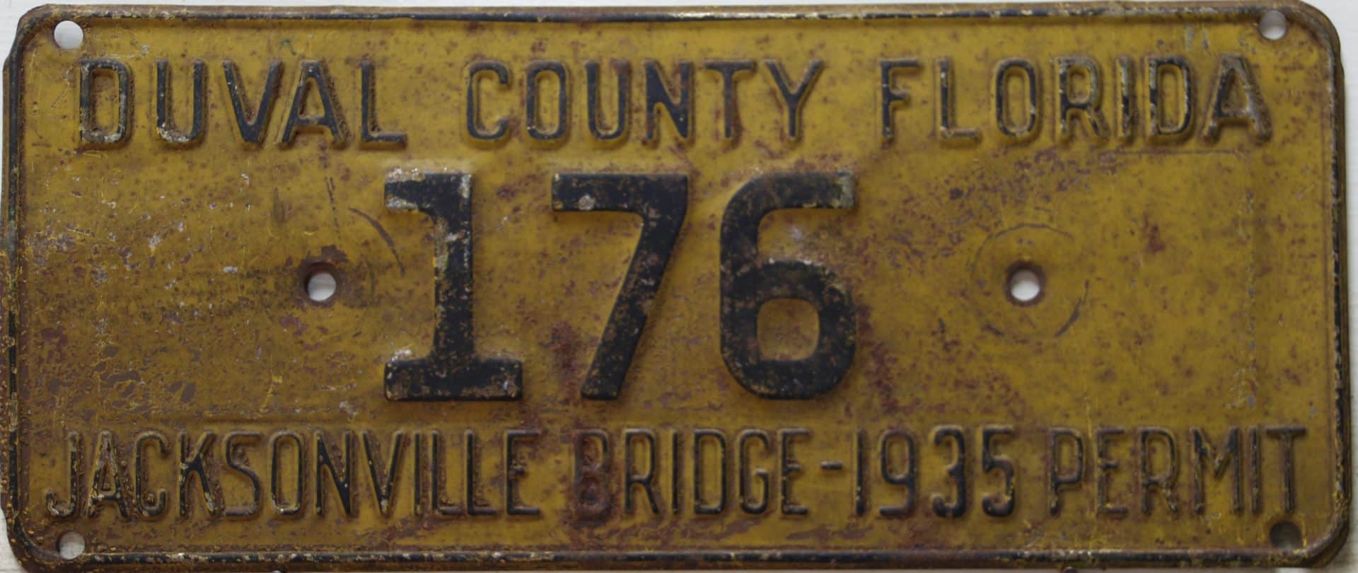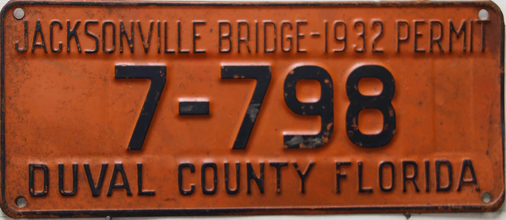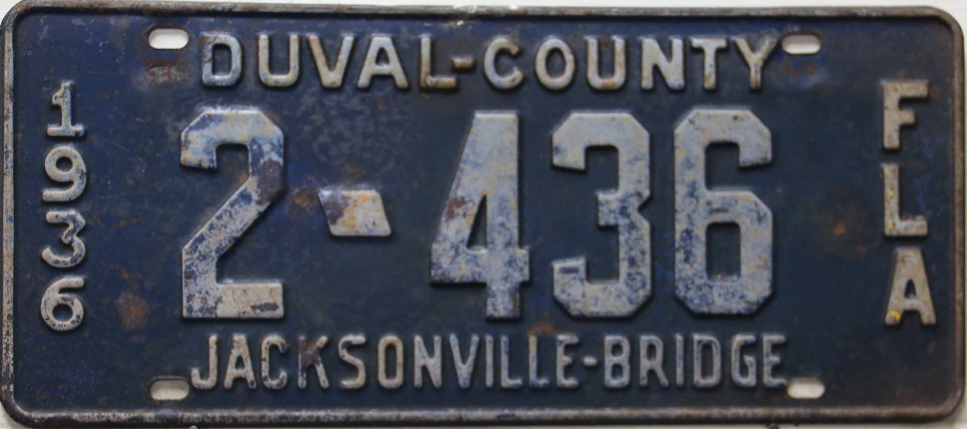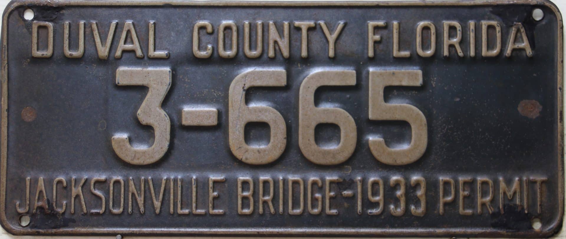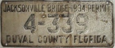 These license plates were issued to those who pre-paid the toll to pass over the Acosta draw bridge in Jacksonville, Florida. The Acosta bridge, opened in 1921 and is seen in this 1930’s picture as the upper bridge. Jacksonville is centrally located in Duval County. The lower adjacent bridge was for the railroad and was the first permanent river crossing built in 1890. Automobile plates were sold from 1928 through 1939, and you can see we’re still several plates away from a full set!