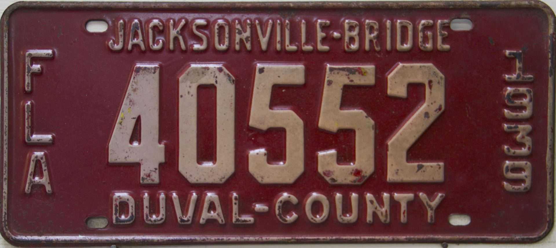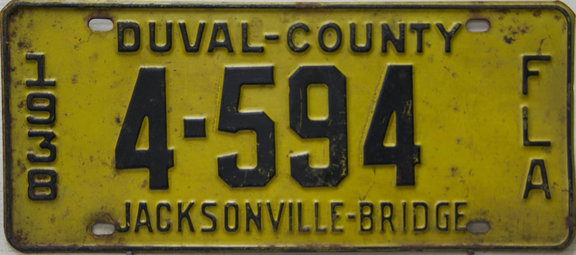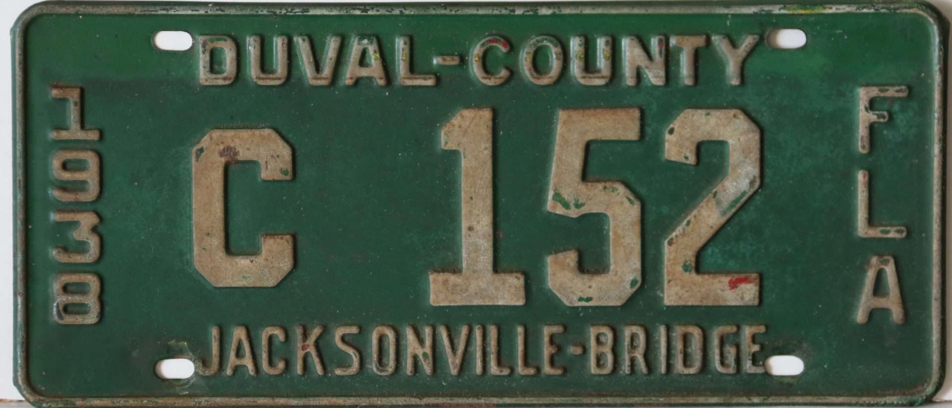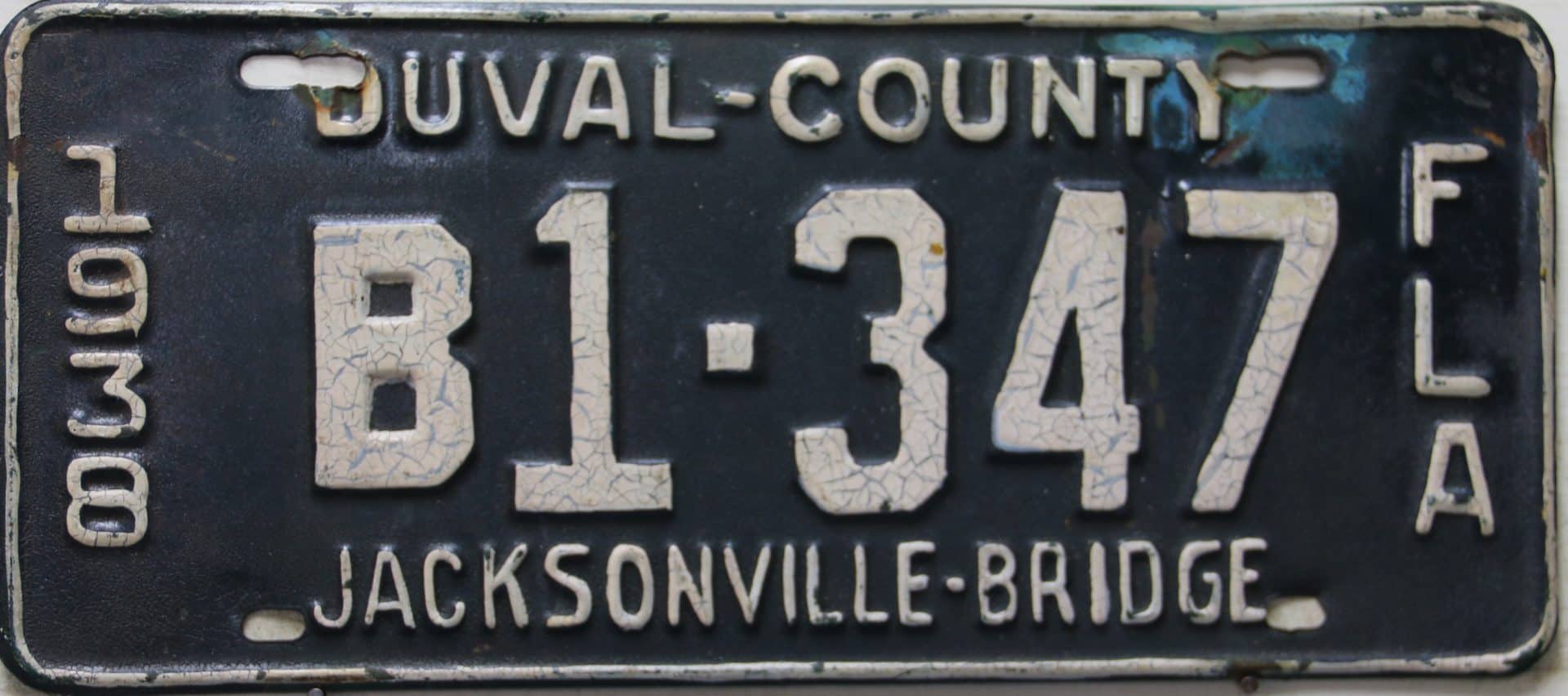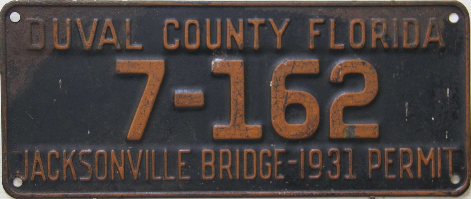 These license plates were issued to those who pre-paid the toll to pass over the Acosta draw bridge in Jacksonville, Florida. The Acosta bridge, opened in 1921 and is seen in this 1930’s picture as the upper bridge. Jacksonville is centrally located in Duval County. The lower adjacent bridge was for the railroad and was the first permanent river crossing built in 1890. Automobile plates were sold from 1928 through 1939, and you can see we’re still several plates away from a full set!
