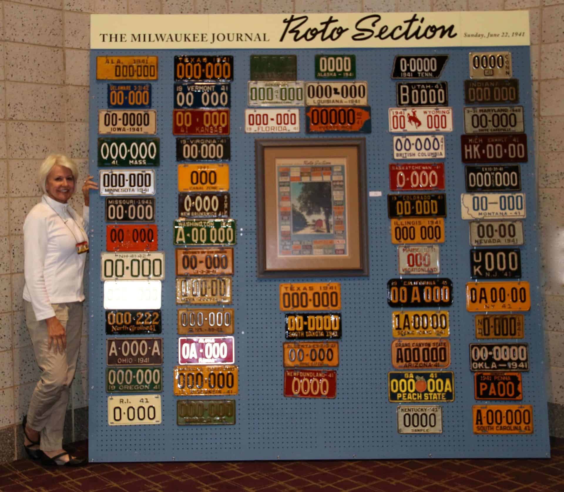 Several years ago as I was just getting addicted to license plate collecting, trading, buying, and selling, my wife and I were in one of the many, many antique malls we have ‘visited’ over the years…this one was in Milwaukee and as I was looking at old newspapers stacked for sale, I spotted a centerfold of a 1941 edition displaying sample license plates for each of United States for 1941…as my wife remarked, “Please don’t tell me this is another one of your ‘signs from God’ to start another collection!”…it was, and I did…we now have all of the sample plates from all of the US states and Canadian Provinces and territories for 1941 (marking the US’s entry into WW II), EXCEPT New Mexico and the Yukon Territory!…we’ve even added a few foreign samples…I put money in the ‘collection’ plate every Sunday