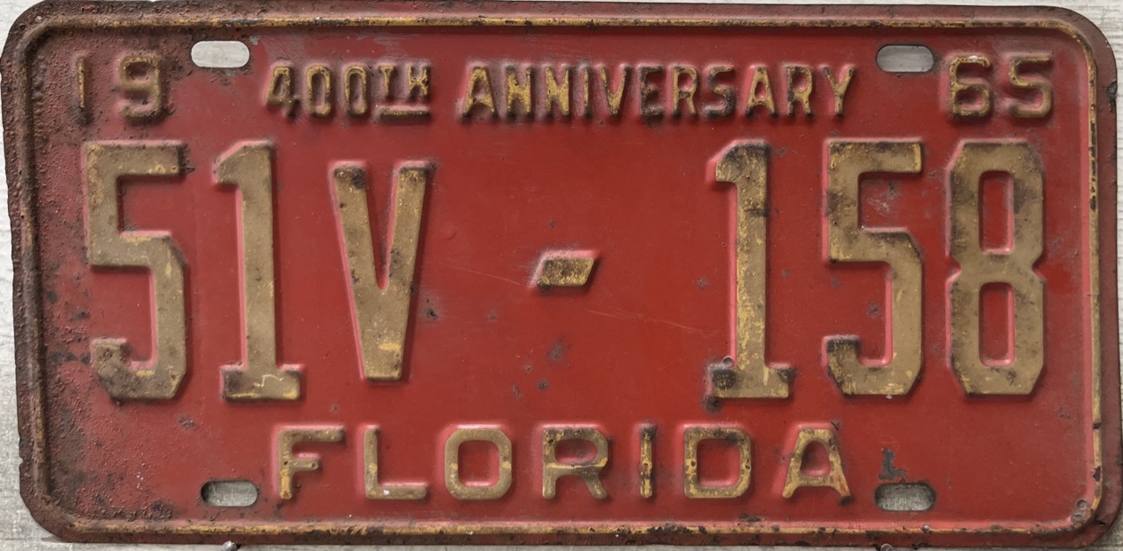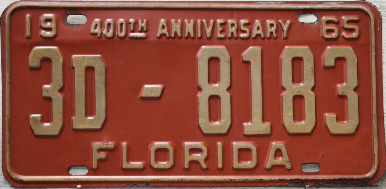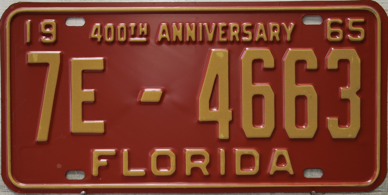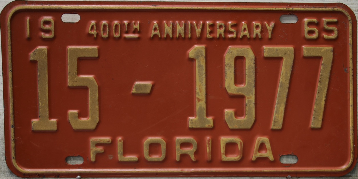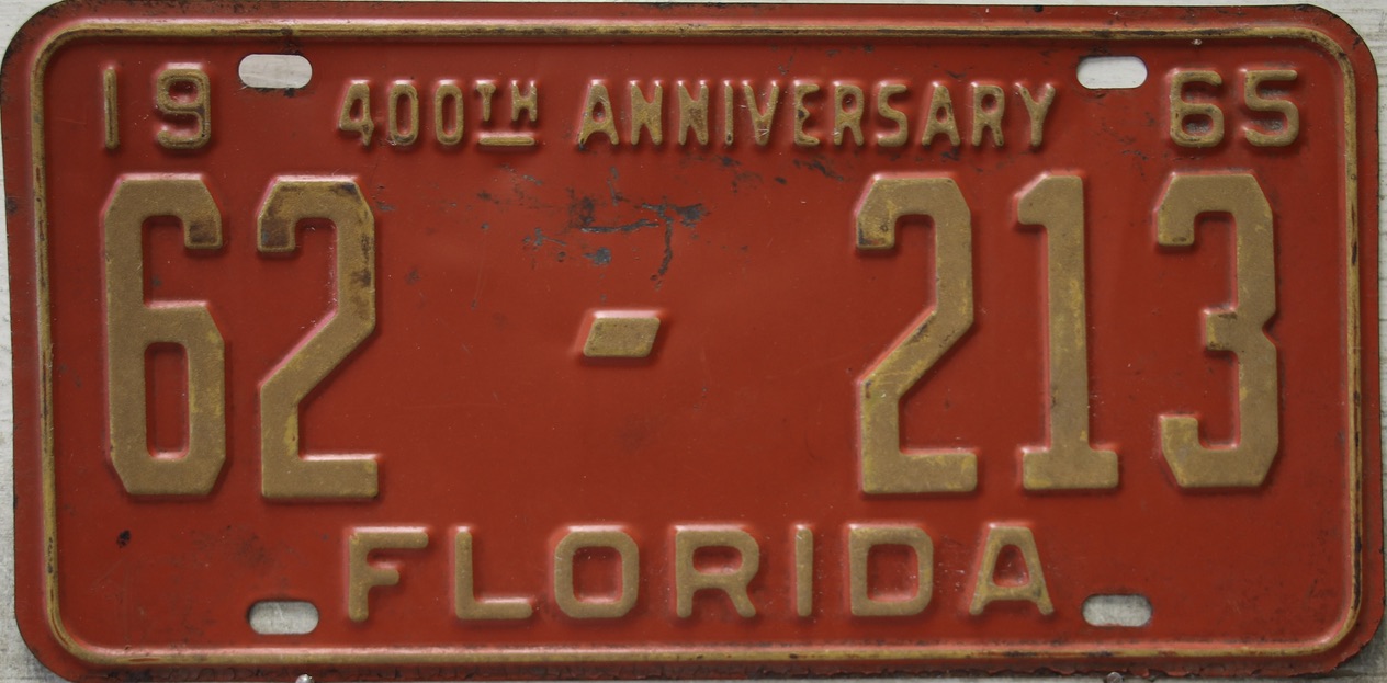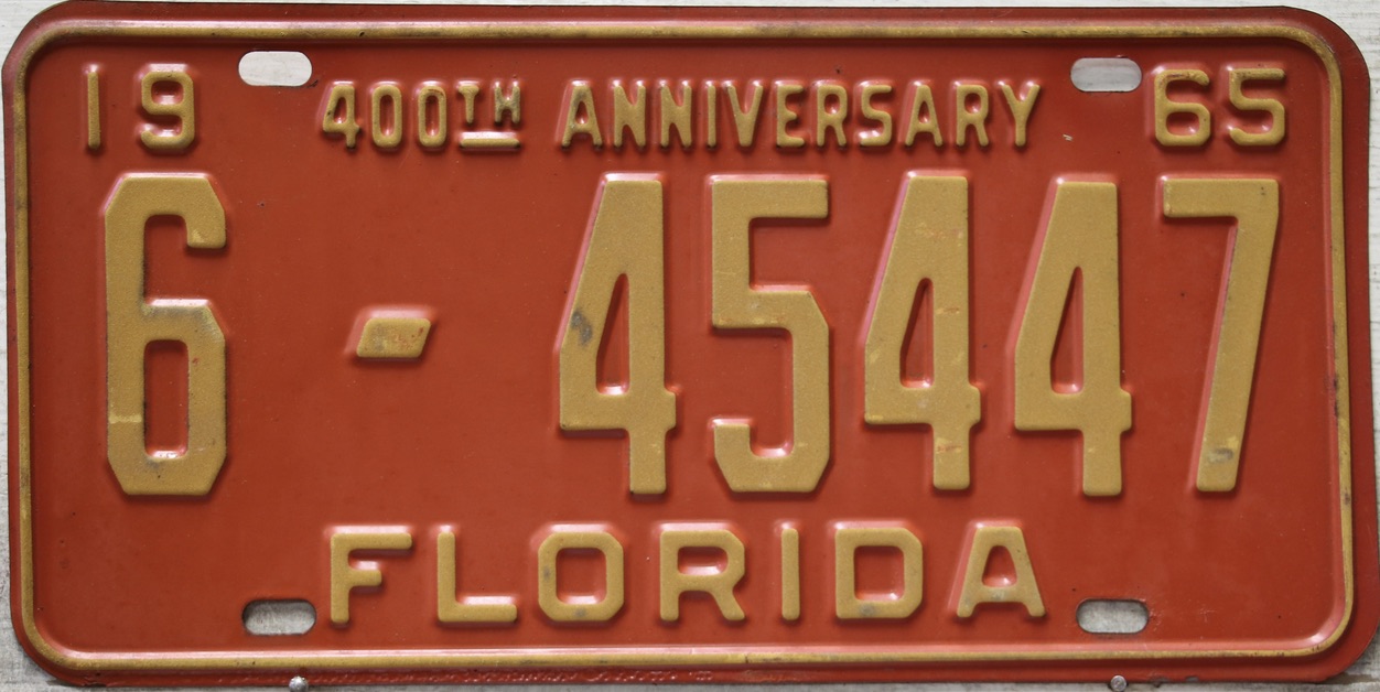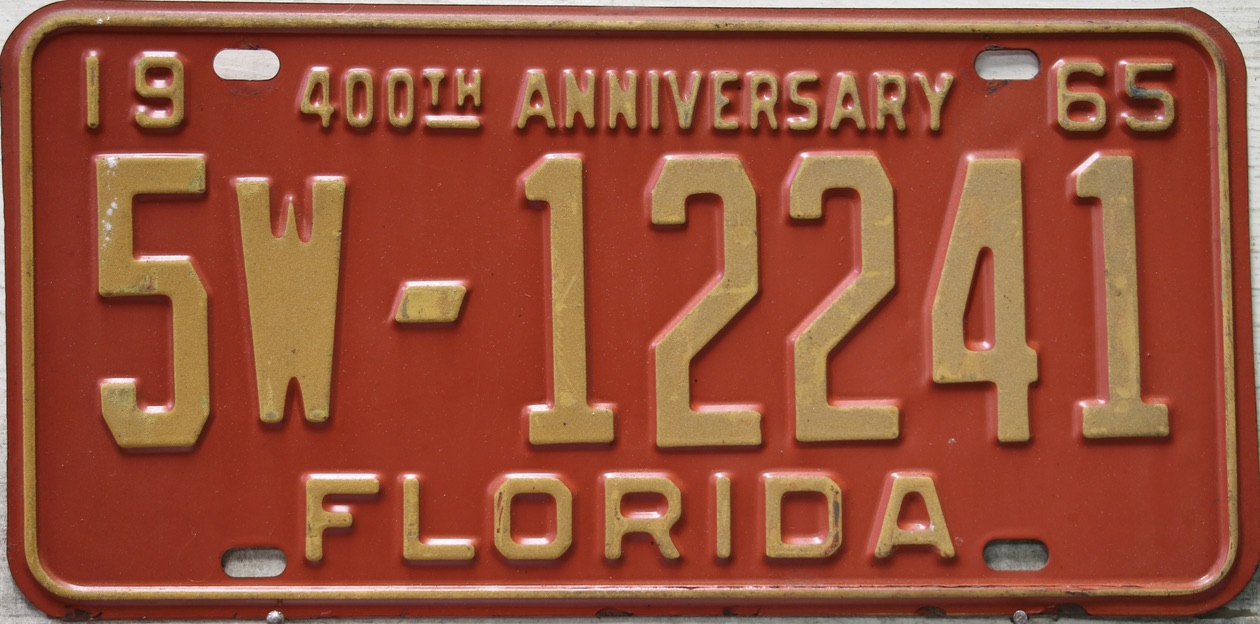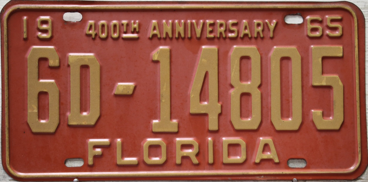 Don’t tell the indigenous inhabitants of Florida, but credit is given to Juan Ponce de Leon for ‘discovering’ Florida in 1565…so in 1965 Florida decided to honor that event by issuing a bright red plate with yellow letters and numbers (think Spanish hues)…as it also happened, I was in high school in 1965, about to sell my 1931 Model A Ford five-window coupe I had restored at our family’s gas station in Cutler, Florida…proceeds were to help fund my first year in college…it had a 1965 Florida plate on it, and I clearly remember focusing on it as the buyer drove it away…so 1965 Florida plates have always been among my favorites…with 67 counties in Florida, our plates for many years always carried the rank by population/registrations, and as you can see, we’re still missing Hamilton (56) and Lafayette (62) Counties…help!