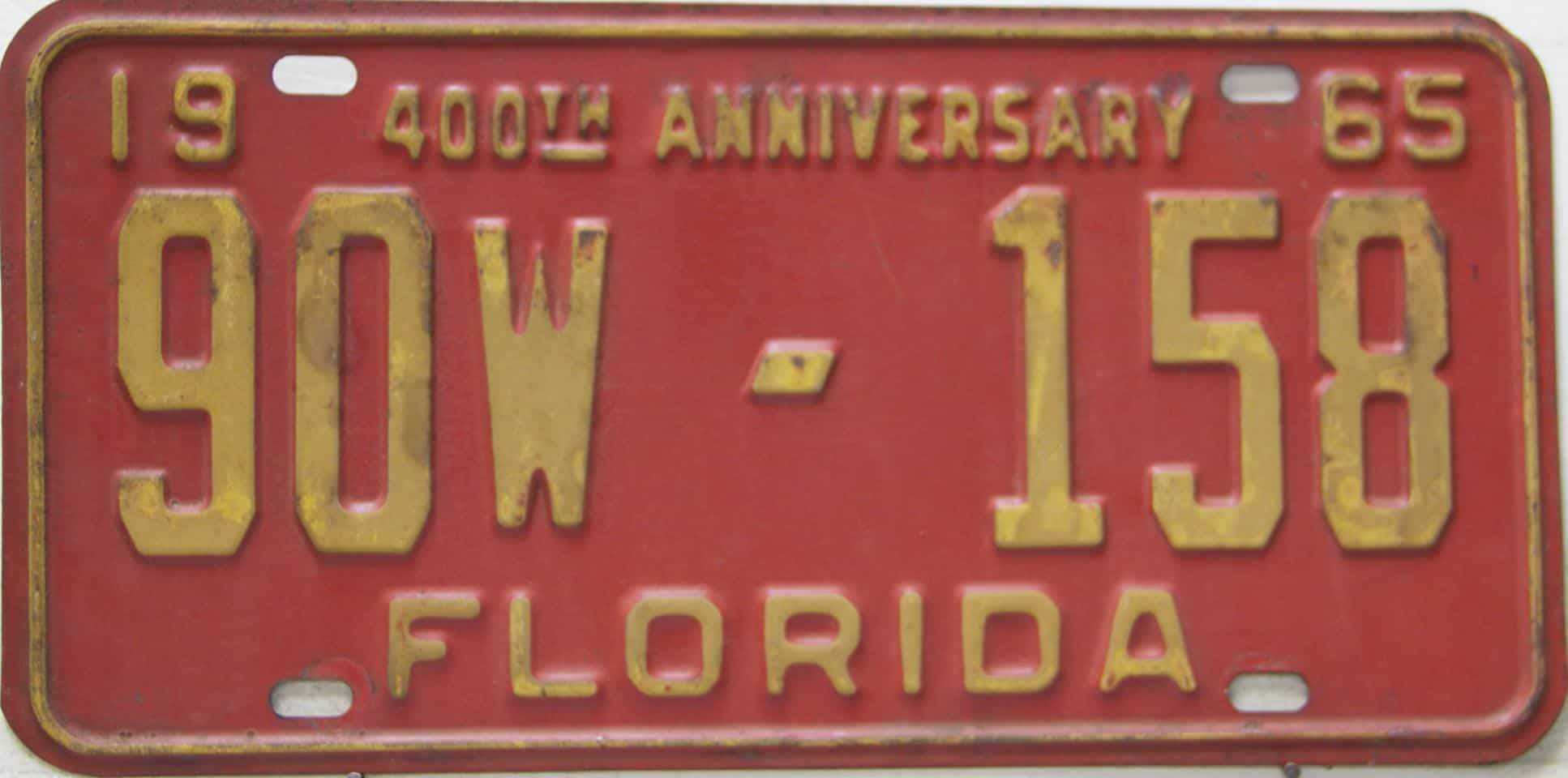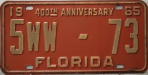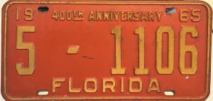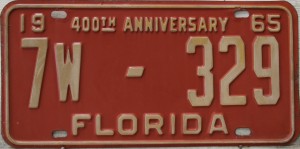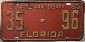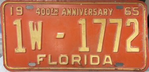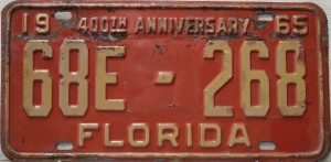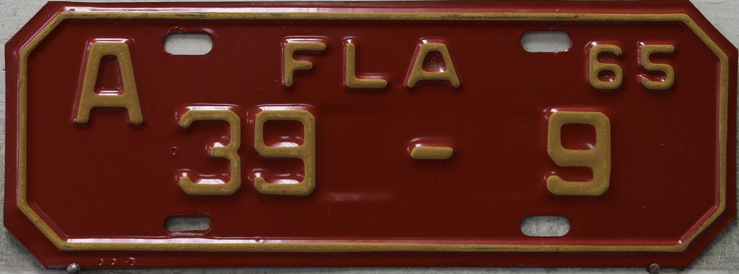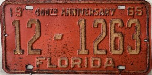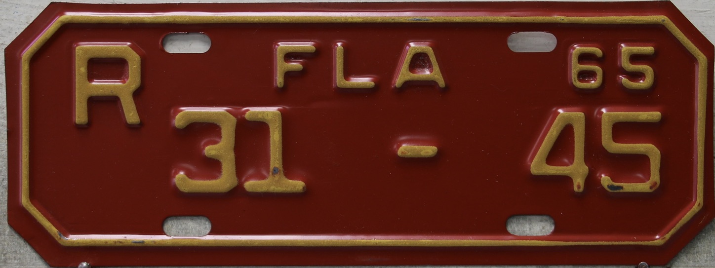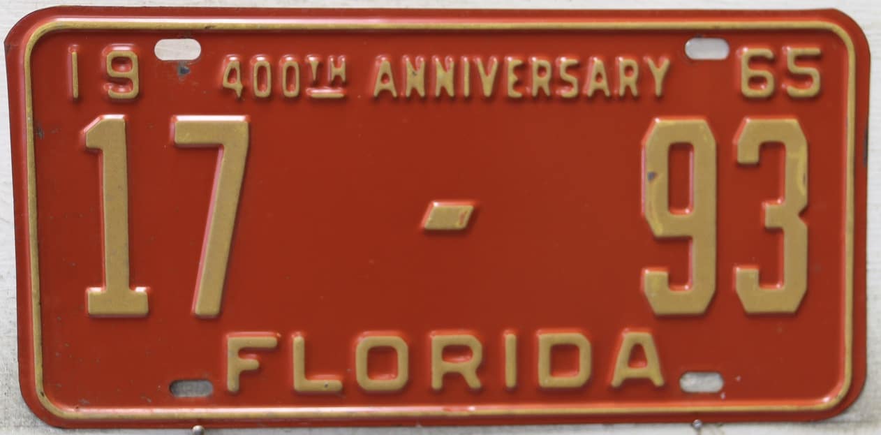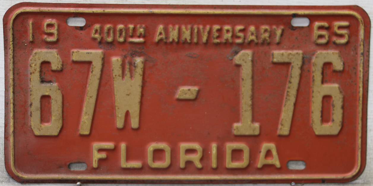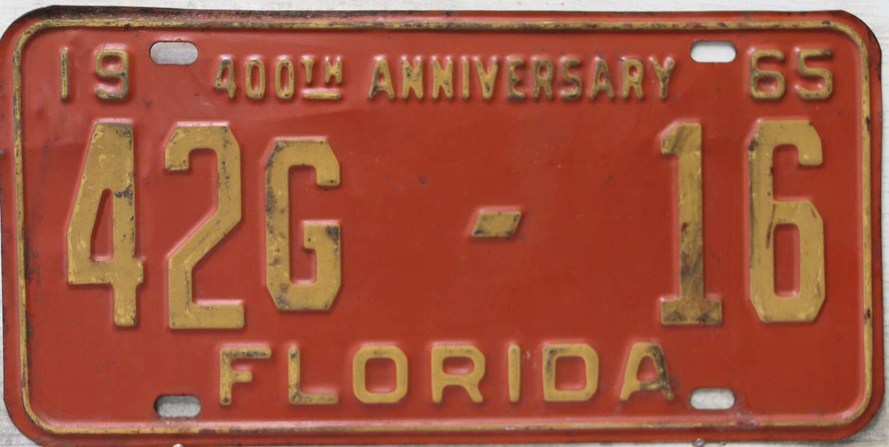 Don’t tell the indigenous inhabitants of Florida, but credit is given to Juan Ponce de Leon for ‘discovering’ Florida in 1565…so in 1965 Florida decided to honor that event by issuing a bright red plate with yellow letters and numbers (think Spanish hues)…as it also happened, I was in high school in 1965, about to sell my 1931 Model A Ford five-window coupe I had restored at our family’s gas station in Cutler, Florida…proceeds were to help fund my first year in college…it had a 1965 Florida plate on it, and I clearly remember focusing on it as the buyer drove it away…so 1965 Florida plates have always been among my favorites…with 67 counties in Florida, our plates for many years always carried the rank by population/registrations, and as you can see, we’re still missing Hamilton (56) and Lafayette (62) Counties…help!