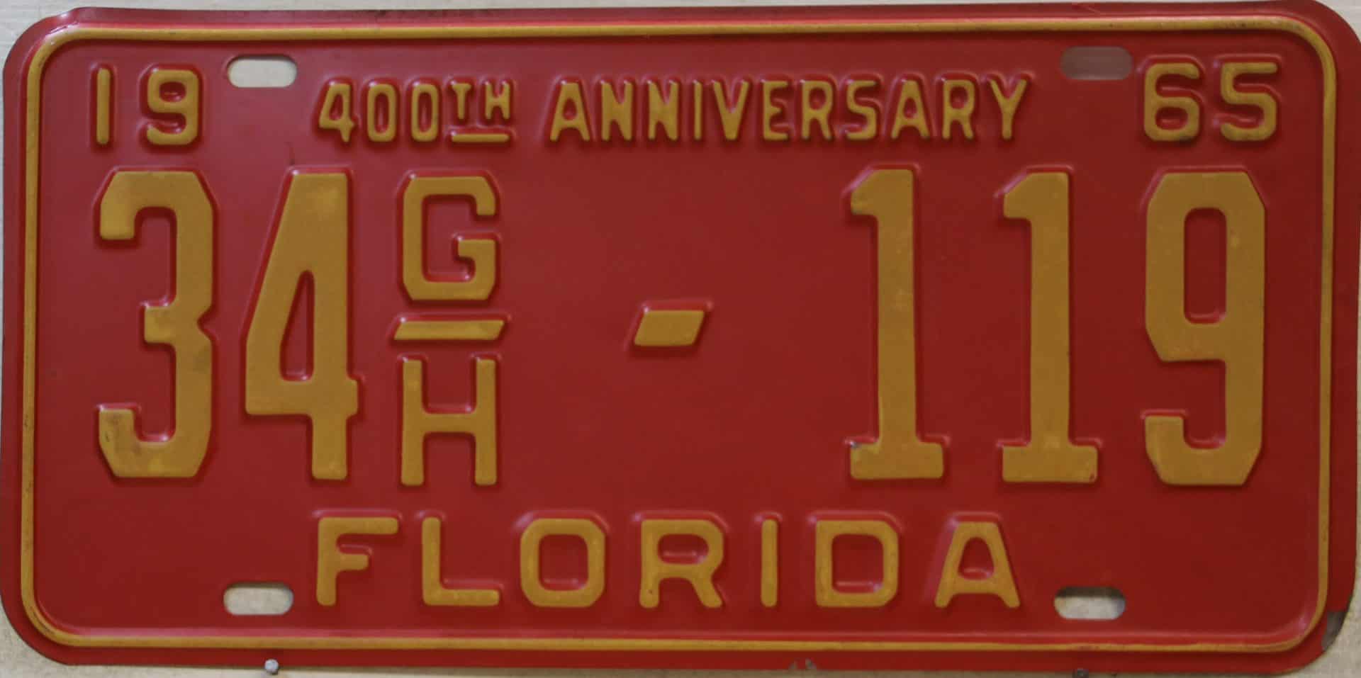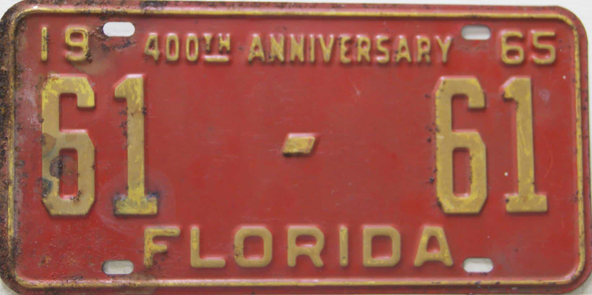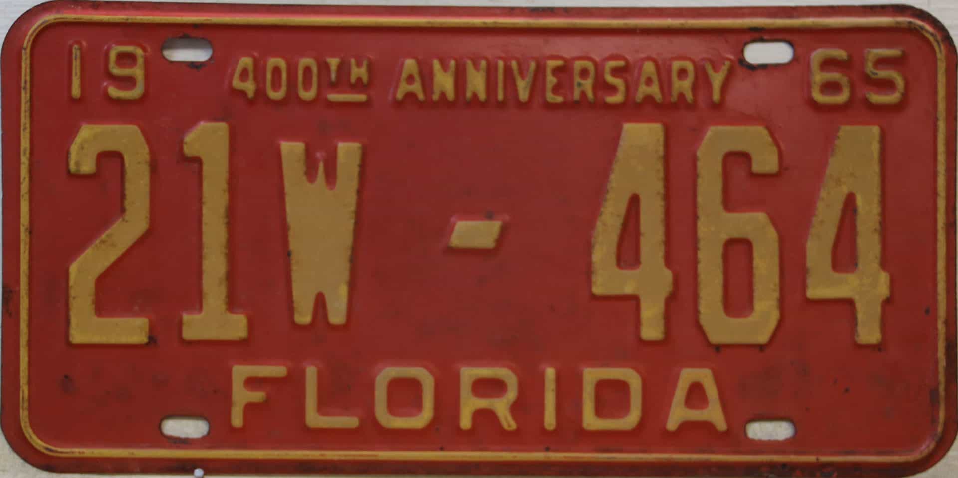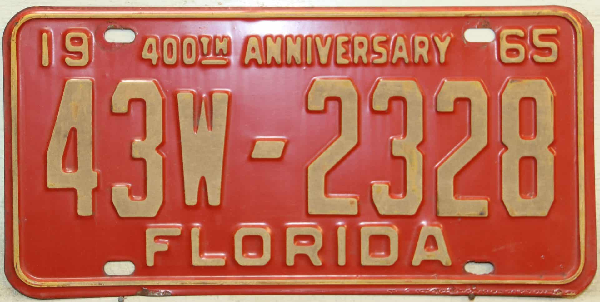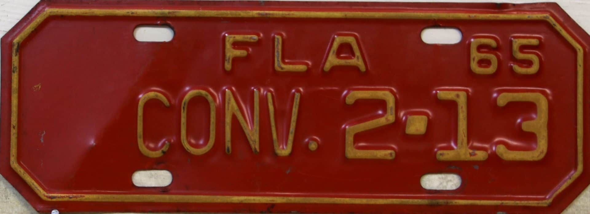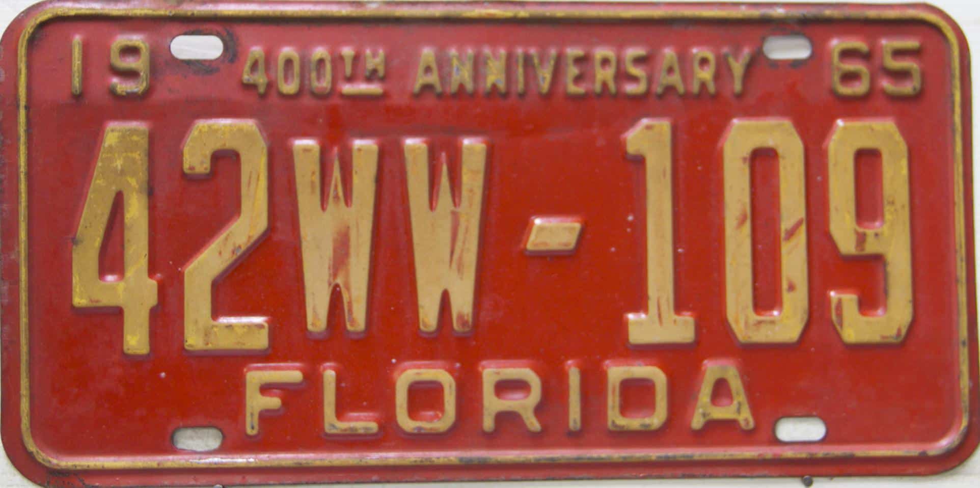 Don’t tell the indigenous inhabitants of Florida, but credit is given to Juan Ponce de Leon for ‘discovering’ Florida in 1565…so in 1965 Florida decided to honor that event by issuing a bright red plate with yellow letters and numbers (think Spanish hues)…as it also happened, I was in high school in 1965, about to sell my 1931 Model A Ford five-window coupe I had restored at our family’s gas station in Cutler, Florida…proceeds were to help fund my first year in college…it had a 1965 Florida plate on it, and I clearly remember focusing on it as the buyer drove it away…so 1965 Florida plates have always been among my favorites…with 67 counties in Florida, our plates for many years always carried the rank by population/registrations, and as you can see, we’re still missing Hamilton (56) and Lafayette (62) Counties…help!