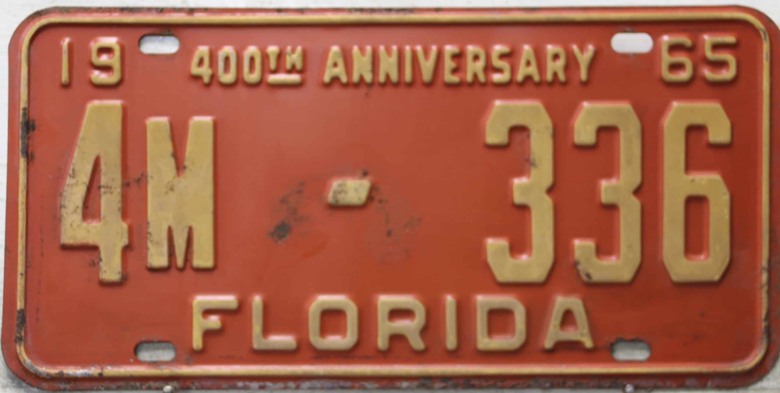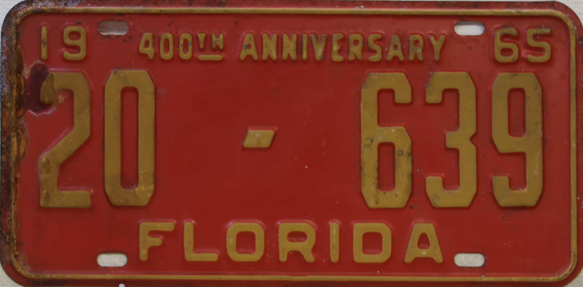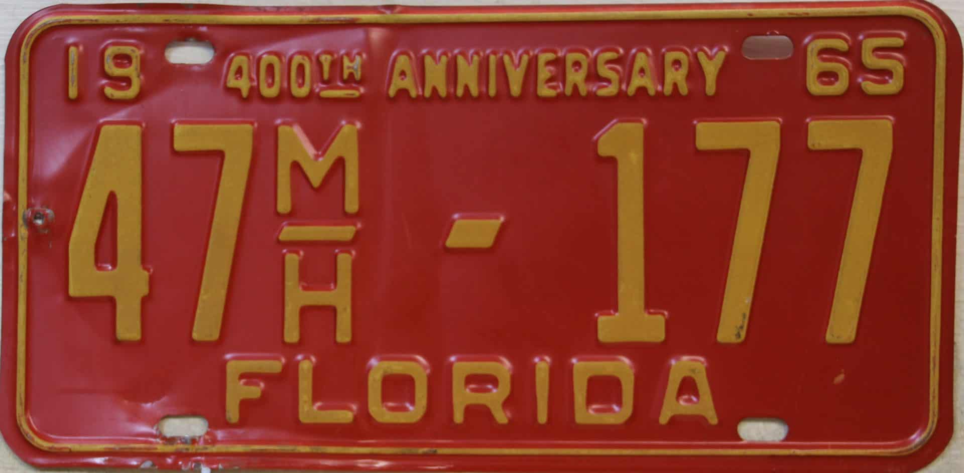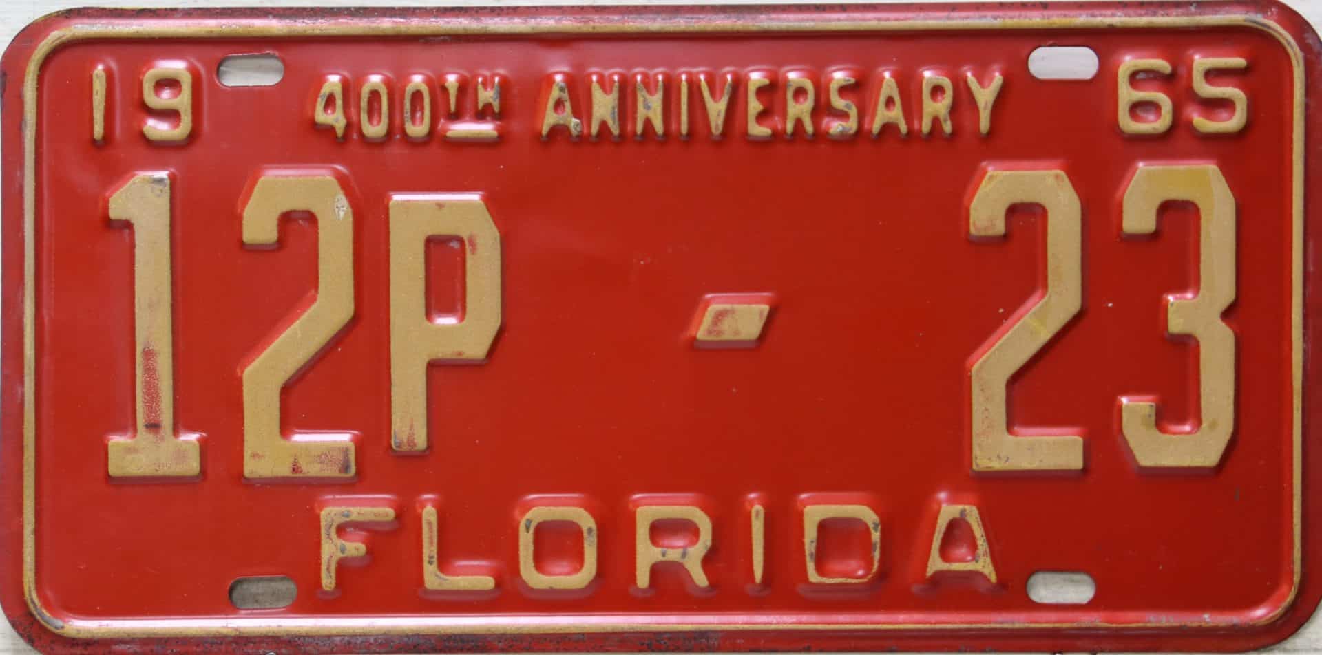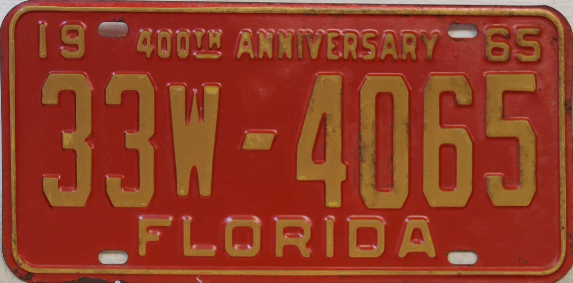 Don’t tell the indigenous inhabitants of Florida, but credit is given to Juan Ponce de Leon for ‘discovering’ Florida in 1565…so in 1965 Florida decided to honor that event by issuing a bright red plate with yellow letters and numbers (think Spanish hues)…as it also happened, I was in high school in 1965, about to sell my 1931 Model A Ford five-window coupe I had restored at our family’s gas station in Cutler, Florida…proceeds were to help fund my first year in college…it had a 1965 Florida plate on it, and I clearly remember focusing on it as the buyer drove it away…so 1965 Florida plates have always been among my favorites…with 67 counties in Florida, our plates for many years always carried the rank by population/registrations, and as you can see, we’re still missing Hamilton (56) and Lafayette (62) Counties…help!