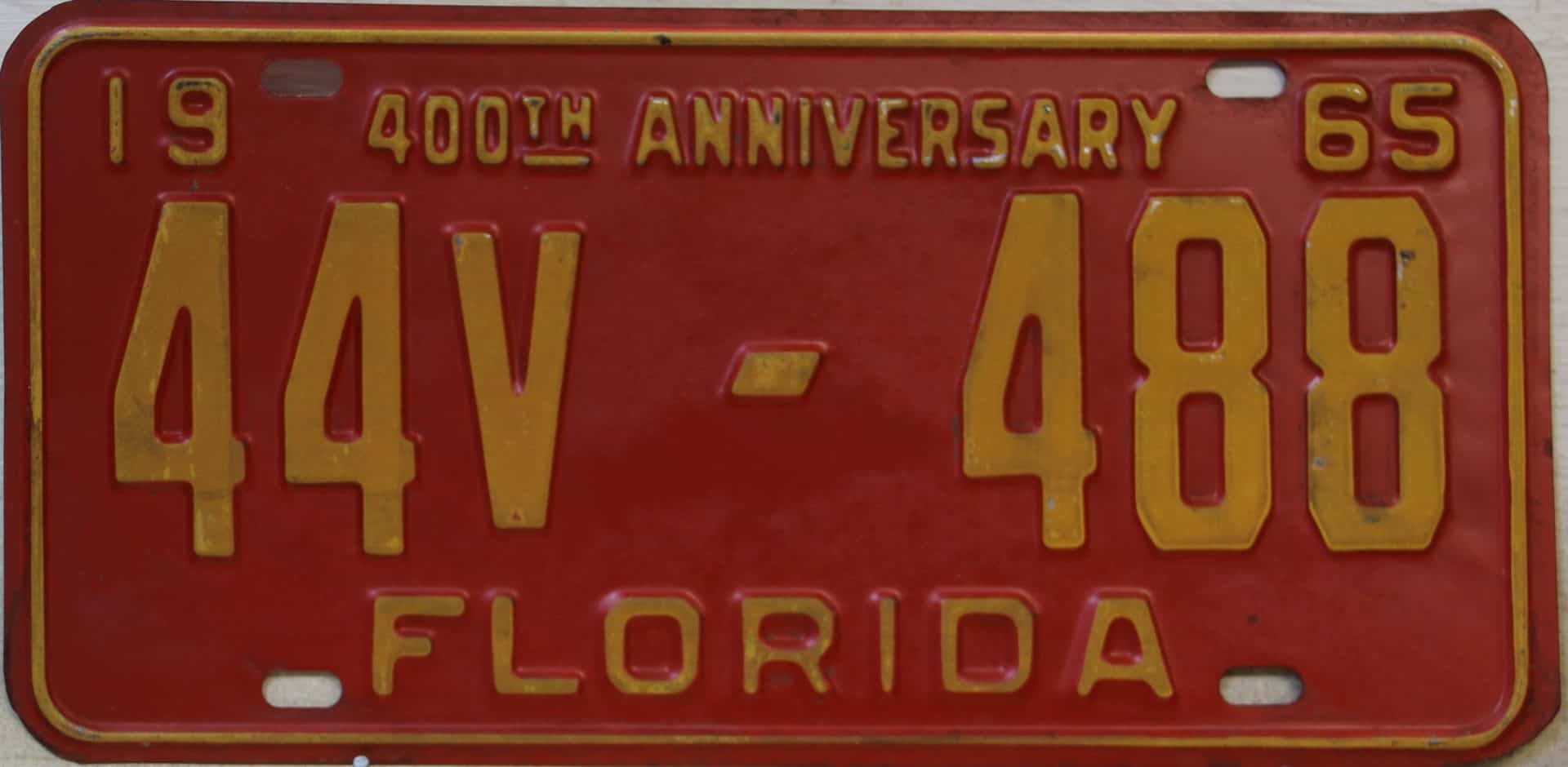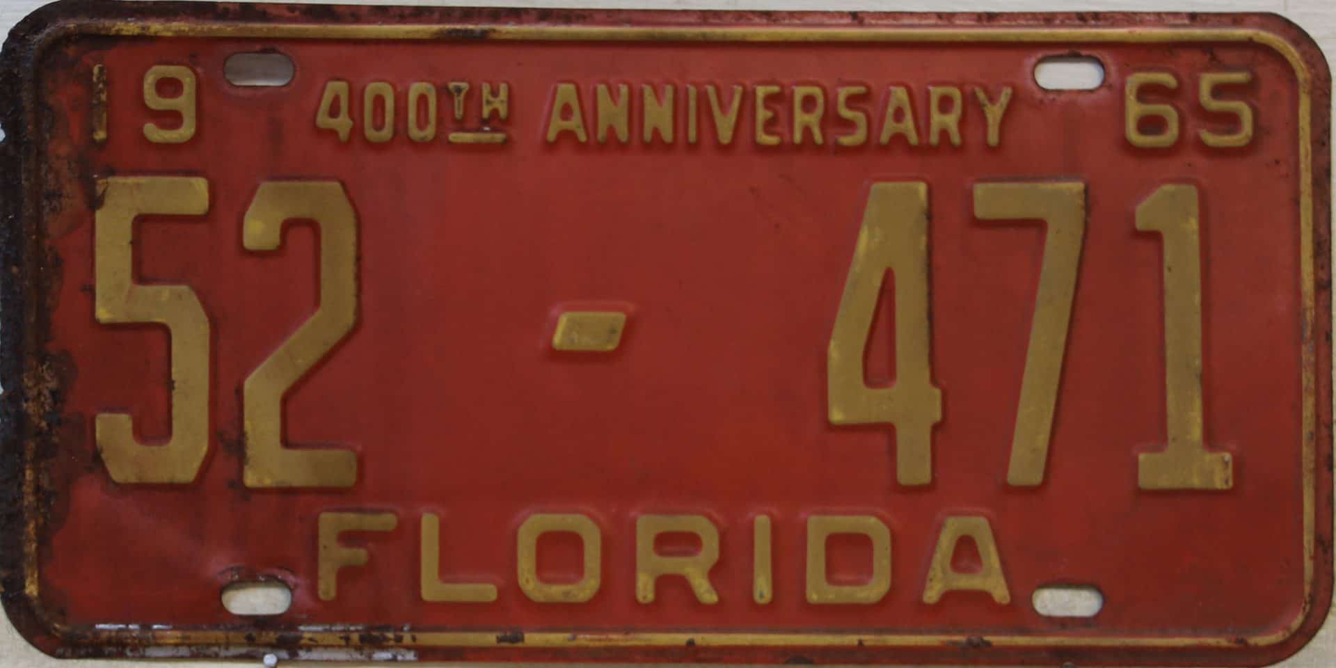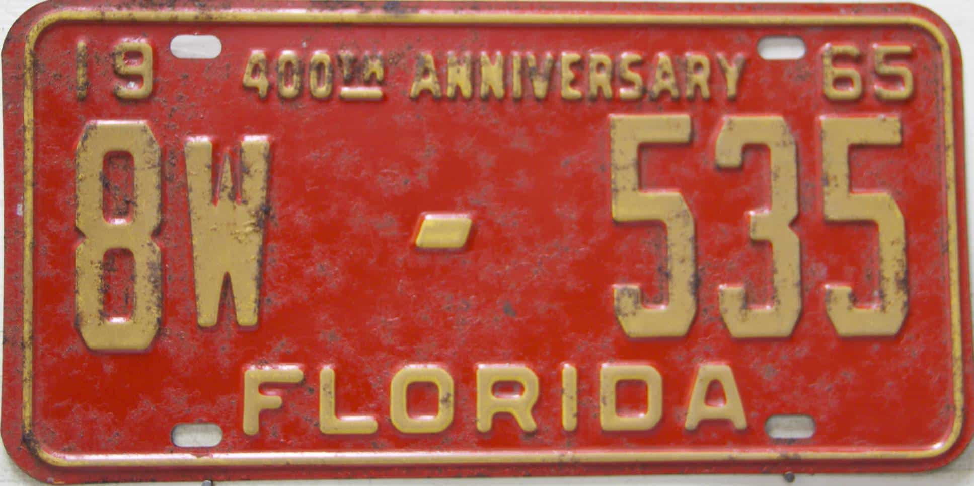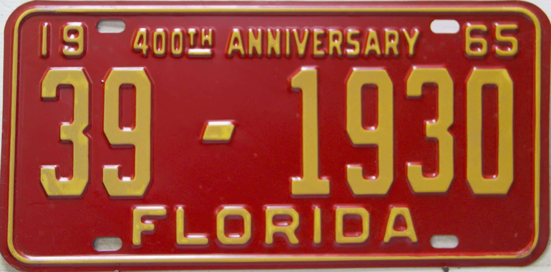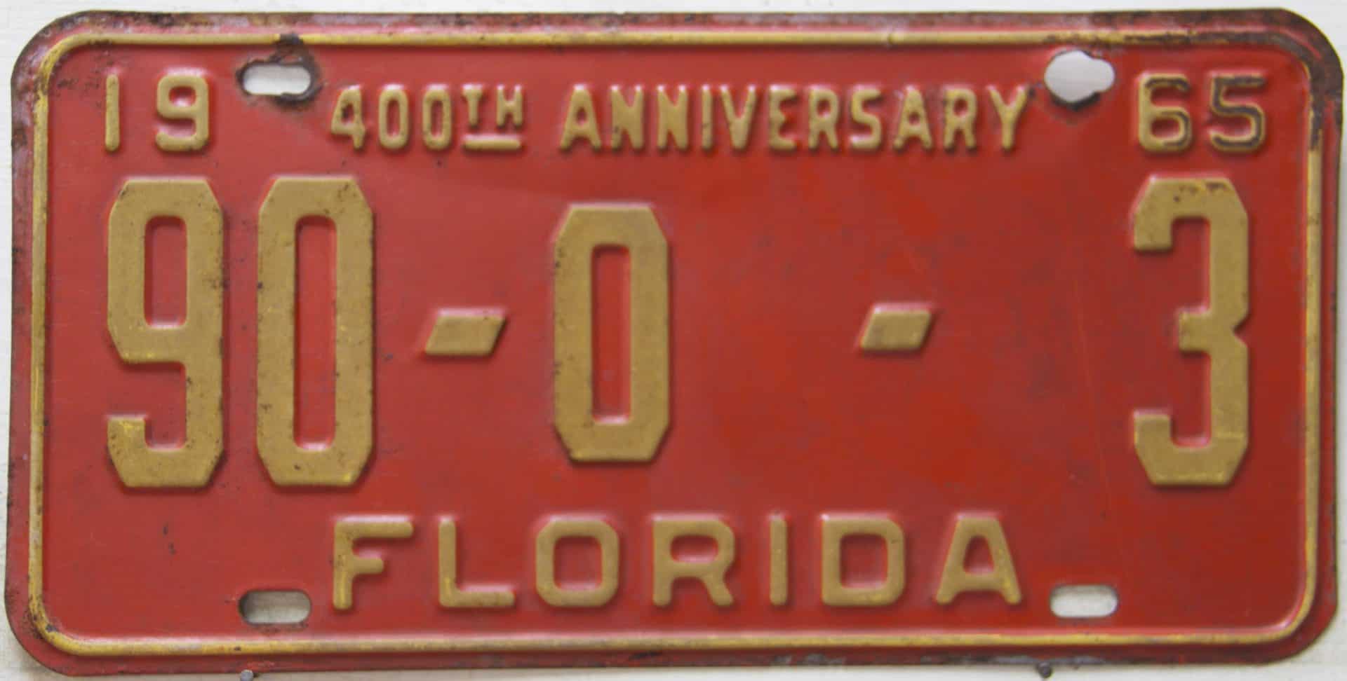 Don’t tell the indigenous inhabitants of Florida, but credit is given to Juan Ponce de Leon for ‘discovering’ Florida in 1565…so in 1965 Florida decided to honor that event by issuing a bright red plate with yellow letters and numbers (think Spanish hues)…as it also happened, I was in high school in 1965, about to sell my 1931 Model A Ford five-window coupe I had restored at our family’s gas station in Cutler, Florida…proceeds were to help fund my first year in college…it had a 1965 Florida plate on it, and I clearly remember focusing on it as the buyer drove it away…so 1965 Florida plates have always been among my favorites…with 67 counties in Florida, our plates for many years always carried the rank by population/registrations, and as you can see, we’re still missing Hamilton (56) and Lafayette (62) Counties…help!