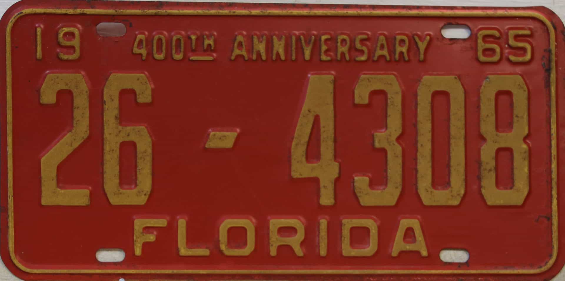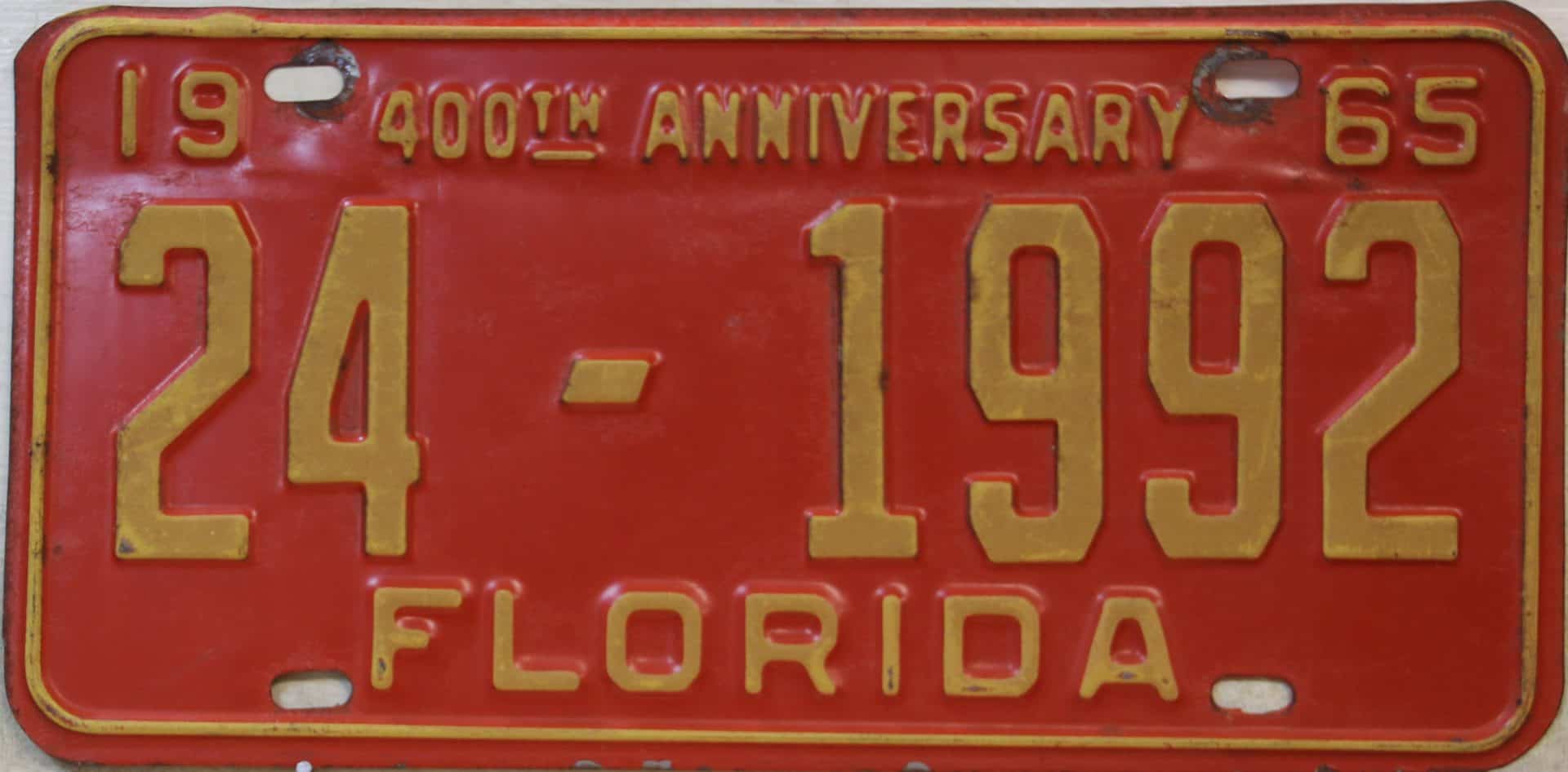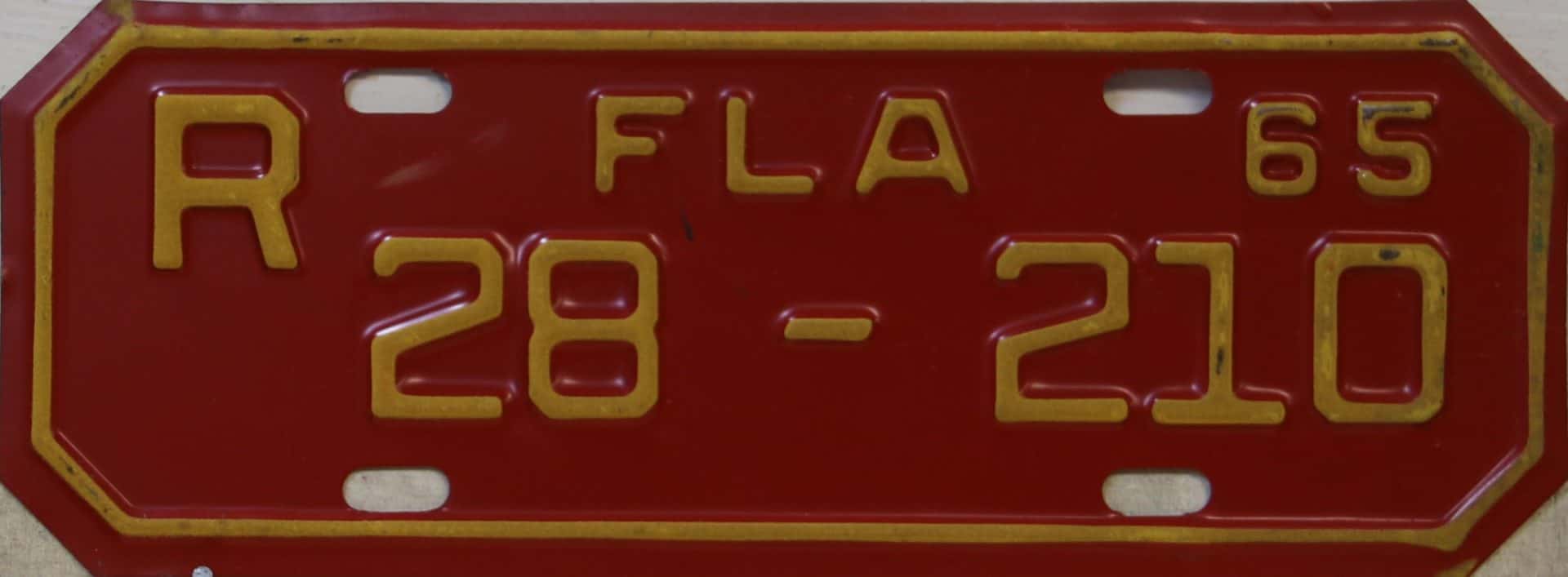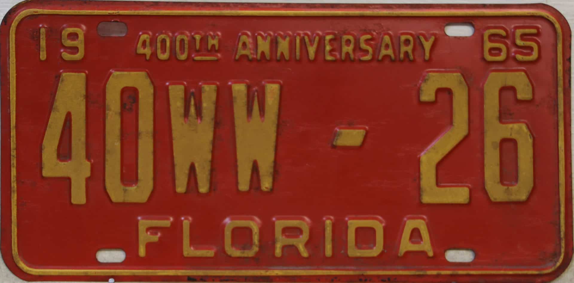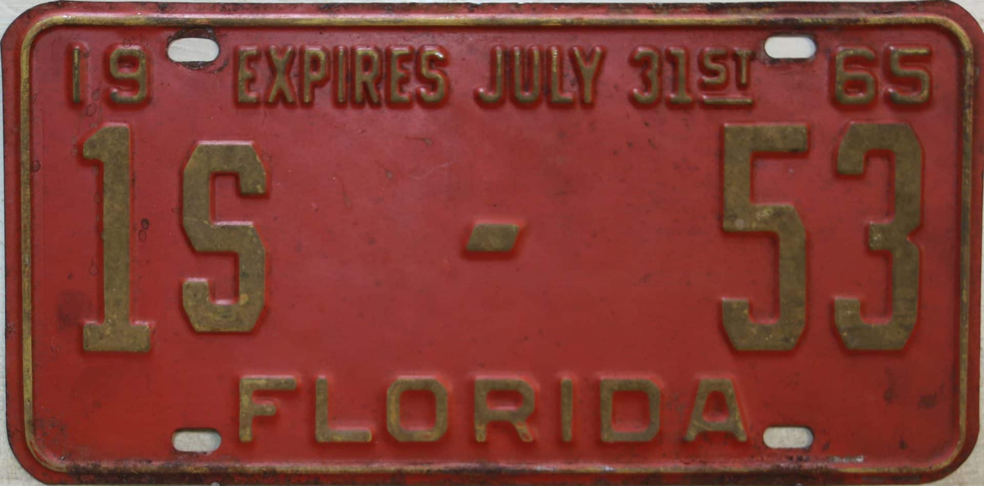 Don’t tell the indigenous inhabitants of Florida, but credit is given to Juan Ponce de Leon for ‘discovering’ Florida in 1565…so in 1965 Florida decided to honor that event by issuing a bright red plate with yellow letters and numbers (think Spanish hues)…as it also happened, I was in high school in 1965, about to sell my 1931 Model A Ford five-window coupe I had restored at our family’s gas station in Cutler, Florida…proceeds were to help fund my first year in college…it had a 1965 Florida plate on it, and I clearly remember focusing on it as the buyer drove it away…so 1965 Florida plates have always been among my favorites…with 67 counties in Florida, our plates for many years always carried the rank by population/registrations, and as you can see, we’re still missing Hamilton (56) and Lafayette (62) Counties…help!
