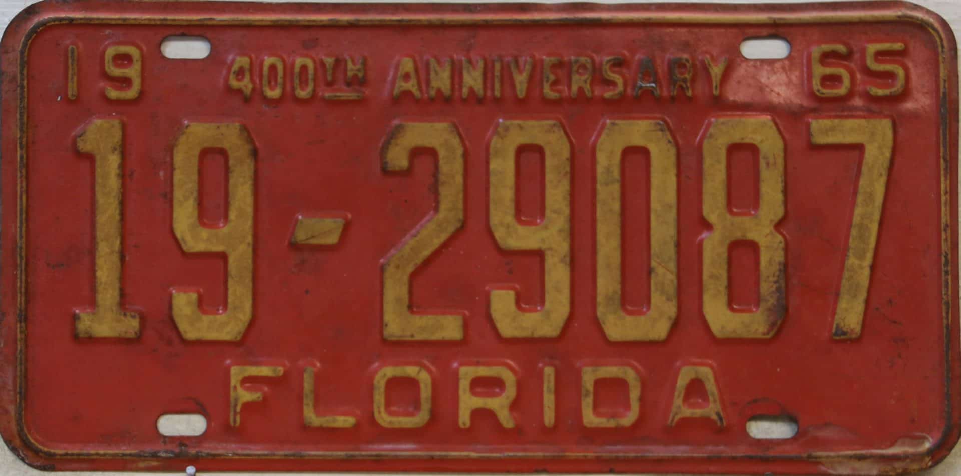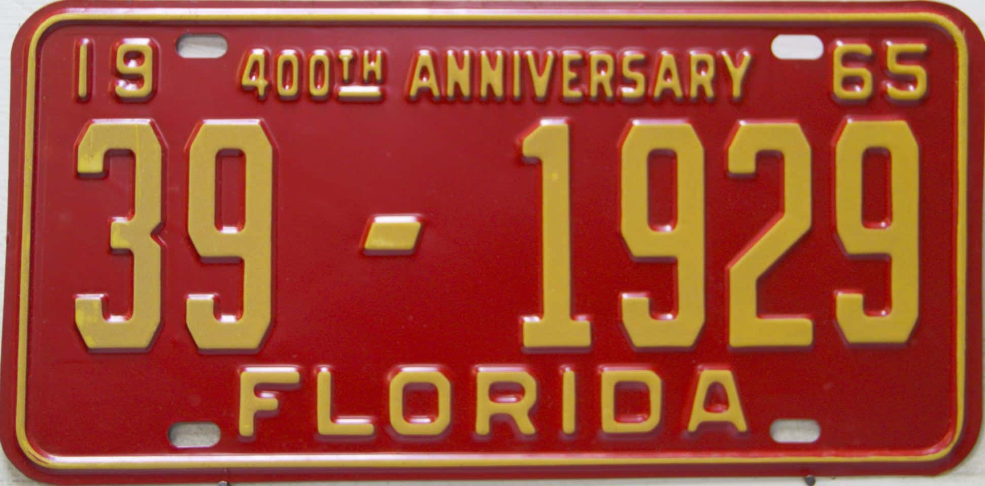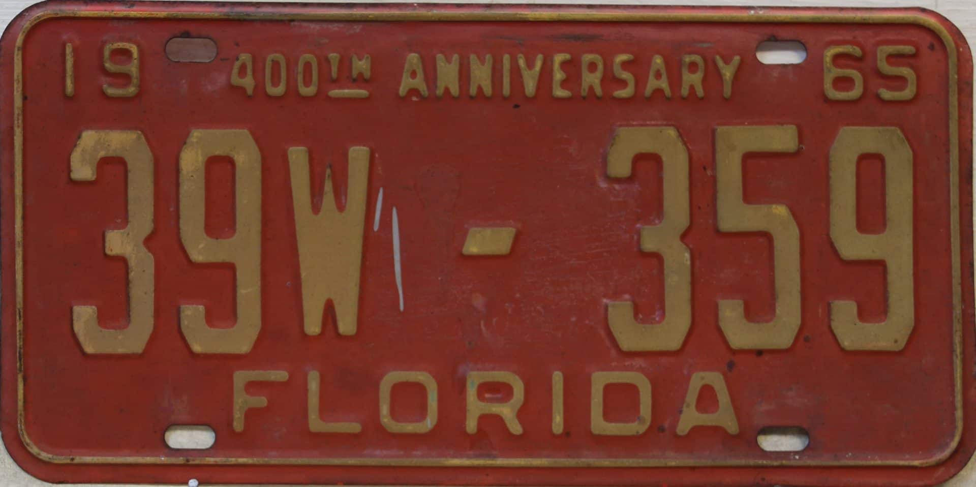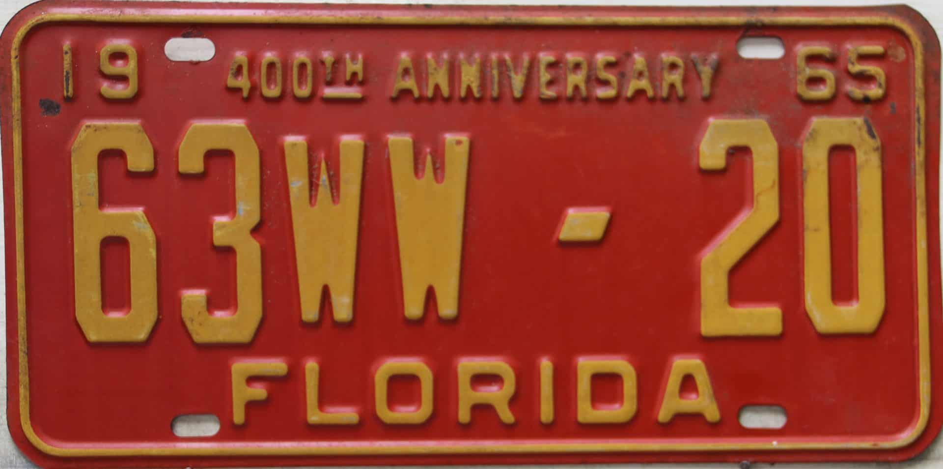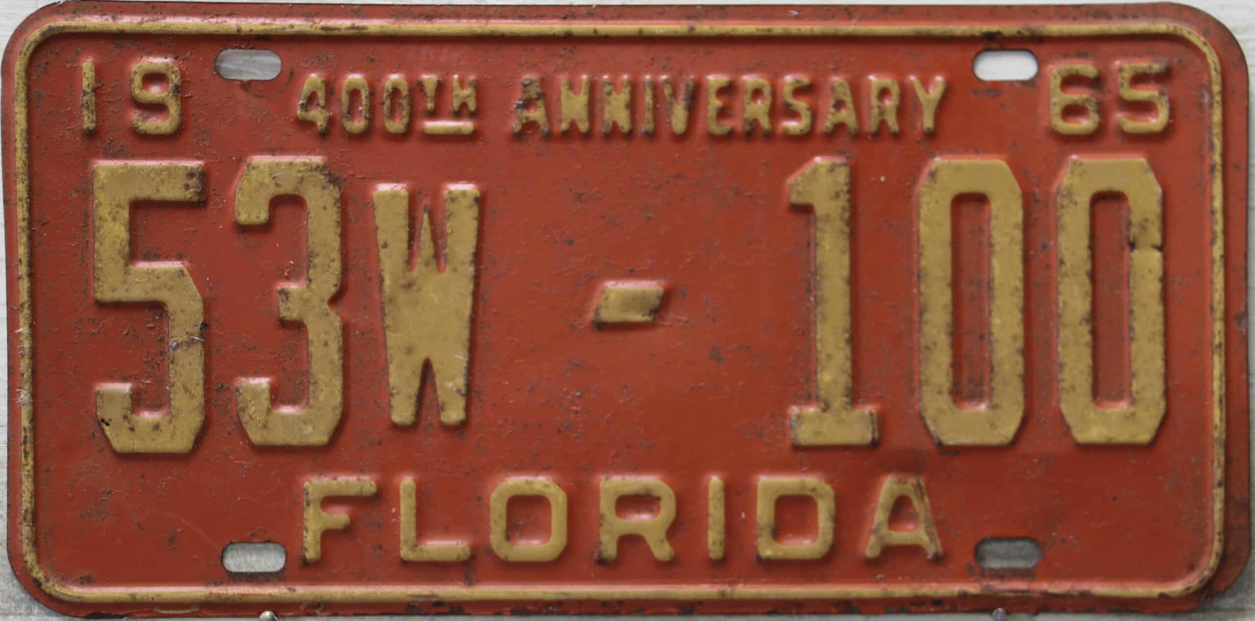 Don’t tell the indigenous inhabitants of Florida, but credit is given to Juan Ponce de Leon for ‘discovering’ Florida in 1565…so in 1965 Florida decided to honor that event by issuing a bright red plate with yellow letters and numbers (think Spanish hues)…as it also happened, I was in high school in 1965, about to sell my 1931 Model A Ford five-window coupe I had restored at our family’s gas station in Cutler, Florida…proceeds were to help fund my first year in college…it had a 1965 Florida plate on it, and I clearly remember focusing on it as the buyer drove it away…so 1965 Florida plates have always been among my favorites…with 67 counties in Florida, our plates for many years always carried the rank by population/registrations, and as you can see, we’re still missing Hamilton (56) and Lafayette (62) Counties…help!