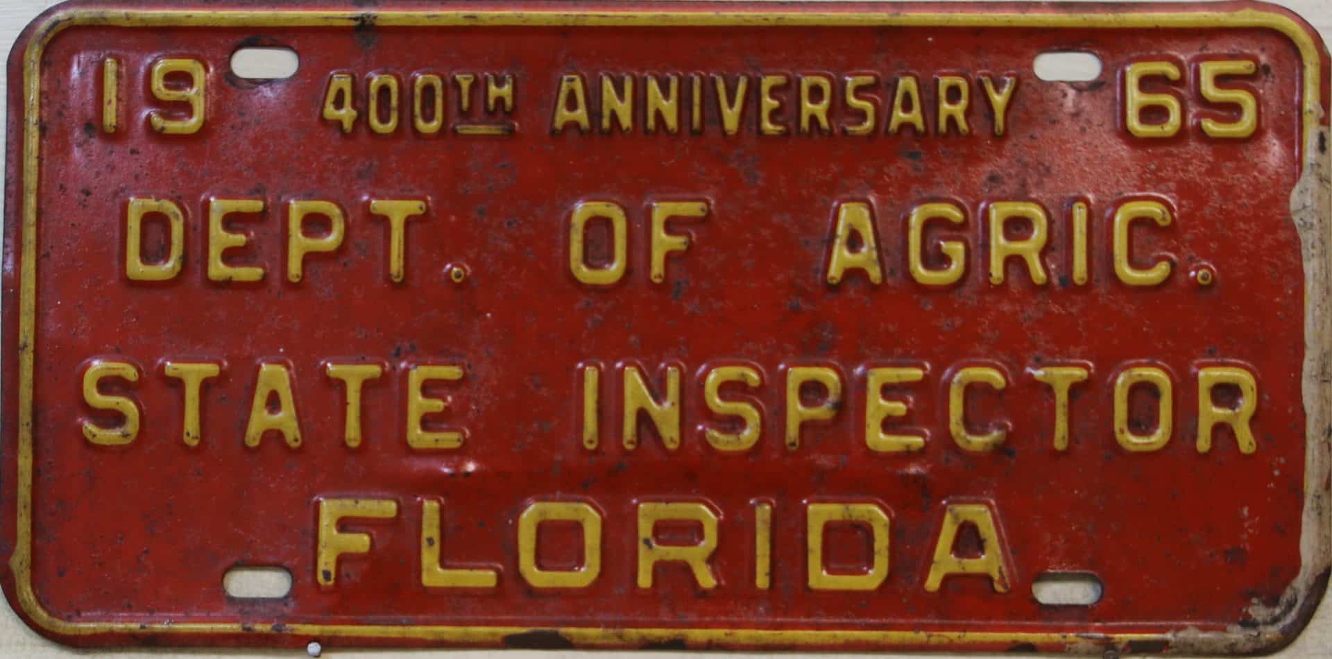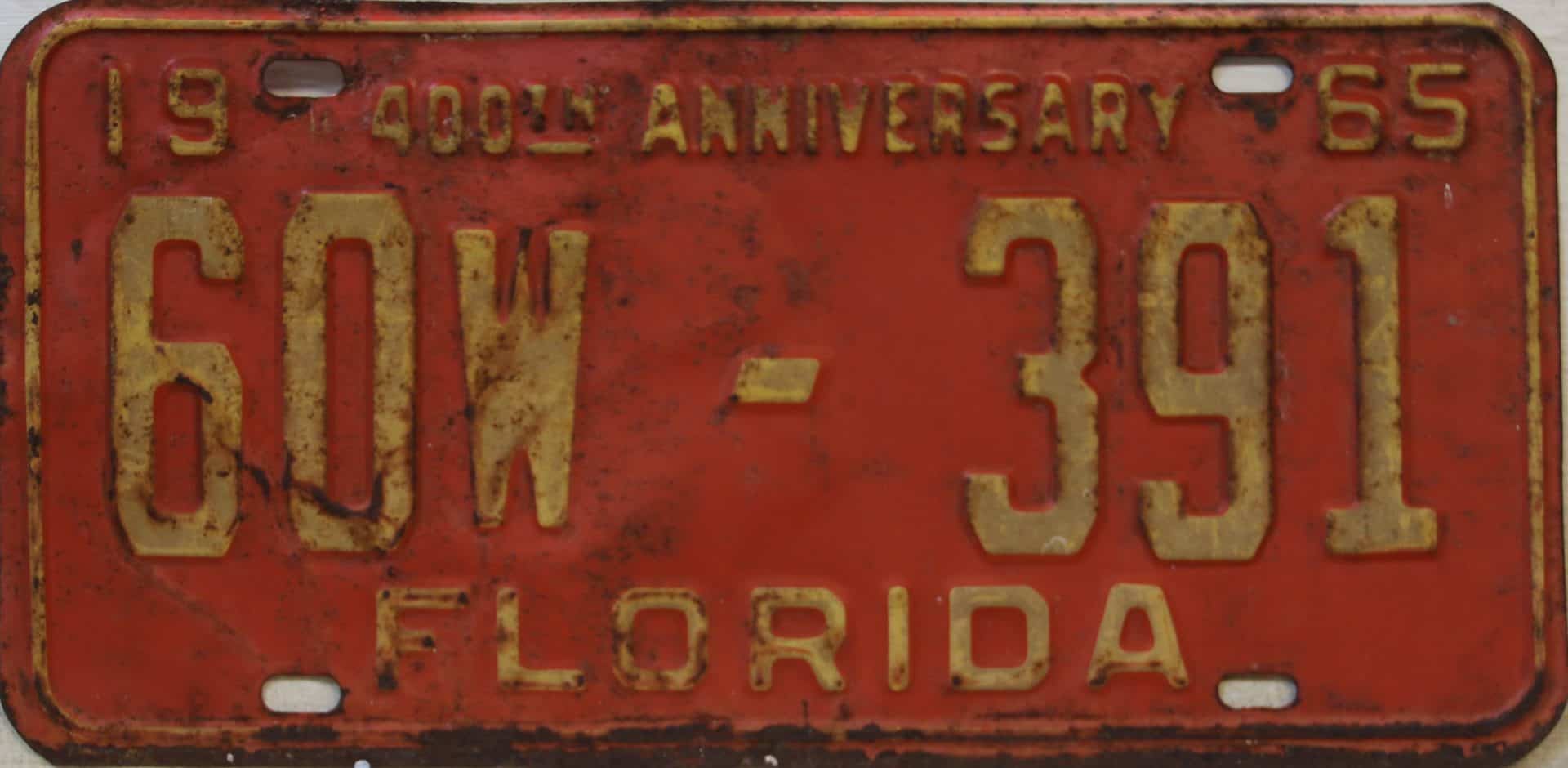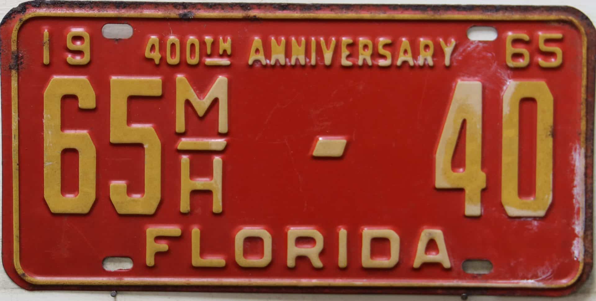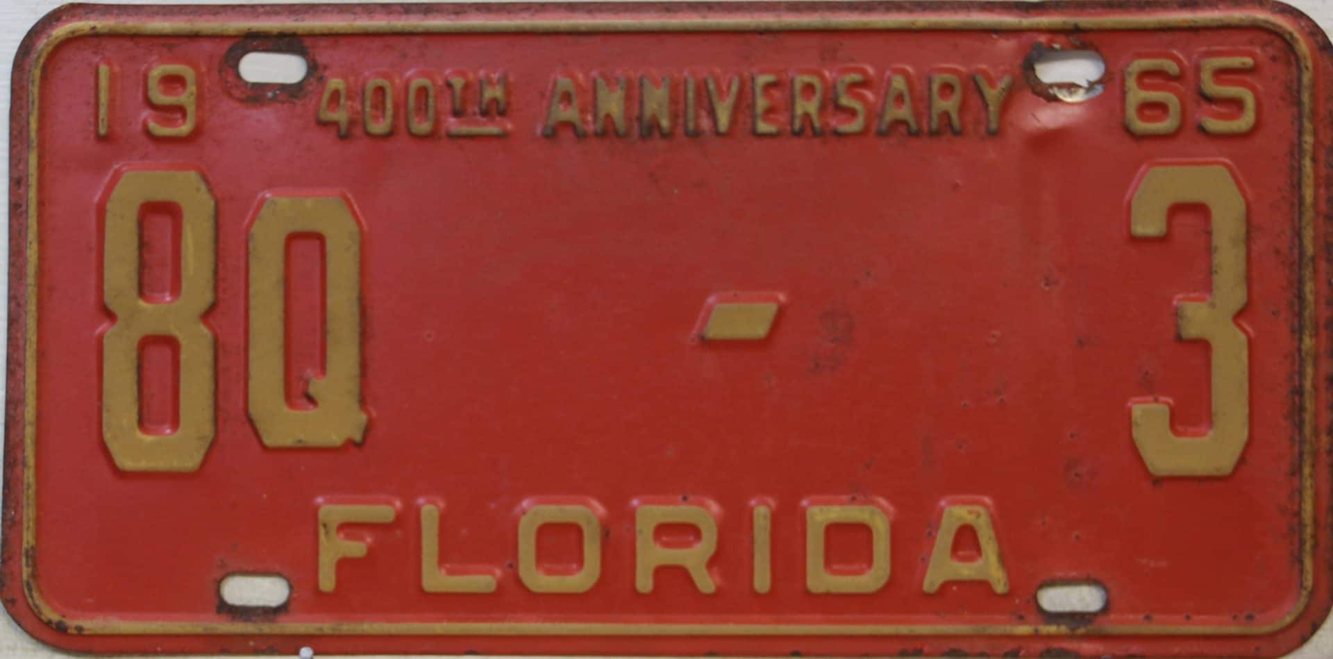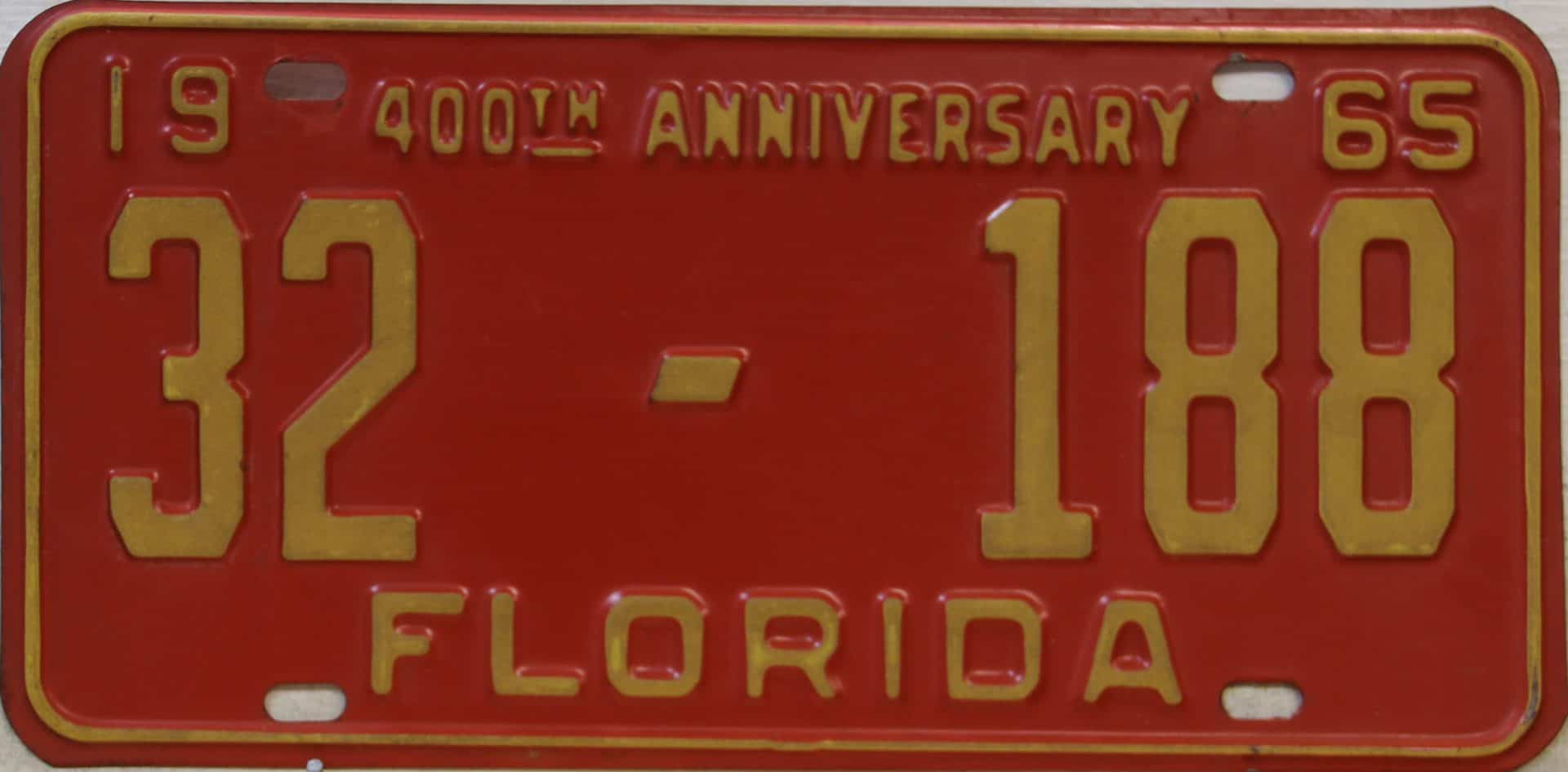 Don’t tell the indigenous inhabitants of Florida, but credit is given to Juan Ponce de Leon for ‘discovering’ Florida in 1565…so in 1965 Florida decided to honor that event by issuing a bright red plate with yellow letters and numbers (think Spanish hues)…as it also happened, I was in high school in 1965, about to sell my 1931 Model A Ford five-window coupe I had restored at our family’s gas station in Cutler, Florida…proceeds were to help fund my first year in college…it had a 1965 Florida plate on it, and I clearly remember focusing on it as the buyer drove it away…so 1965 Florida plates have always been among my favorites…with 67 counties in Florida, our plates for many years always carried the rank by population/registrations, and as you can see, we’re still missing Hamilton (56) and Lafayette (62) Counties…help!