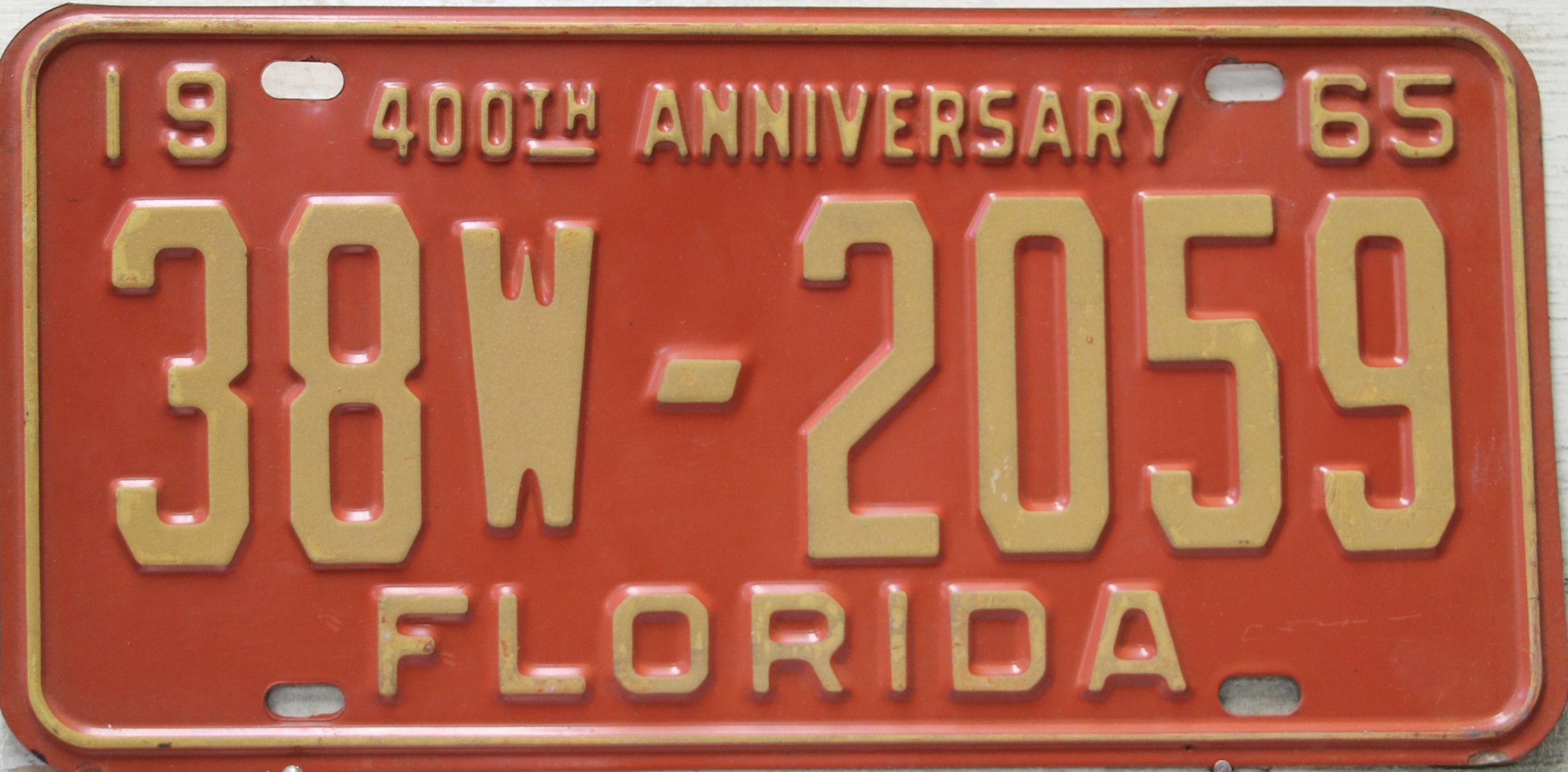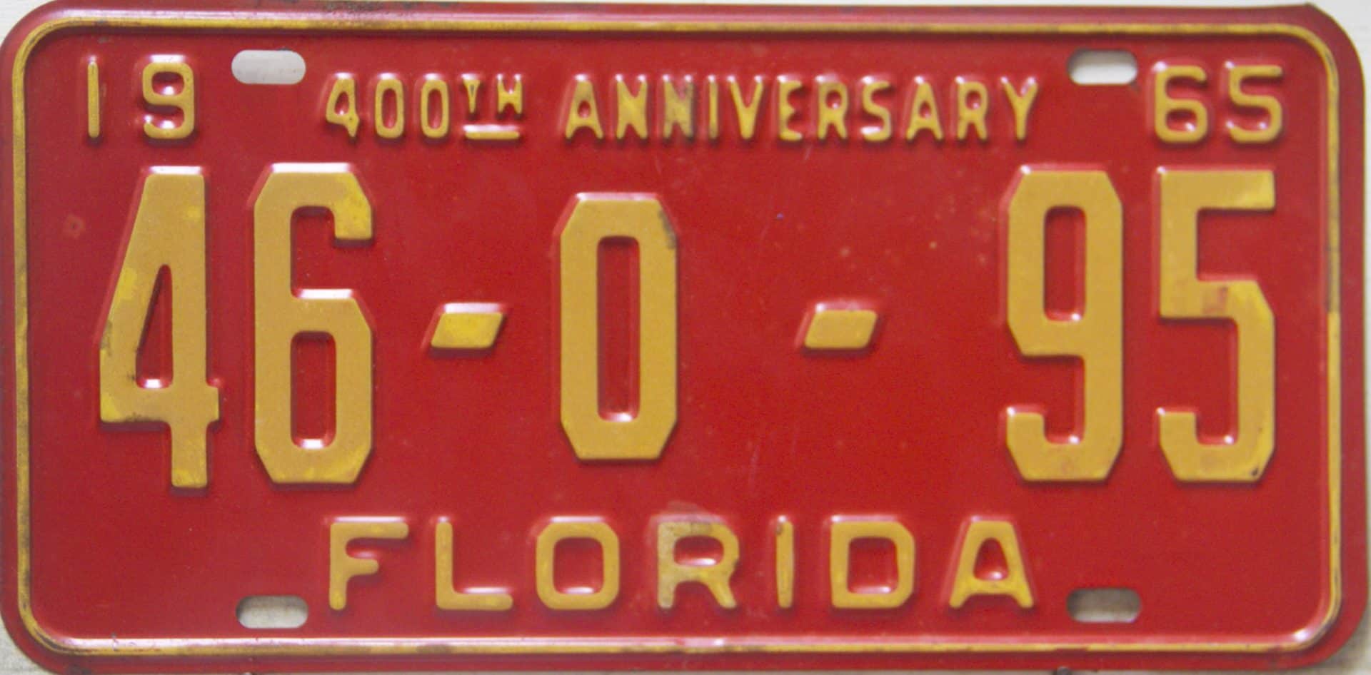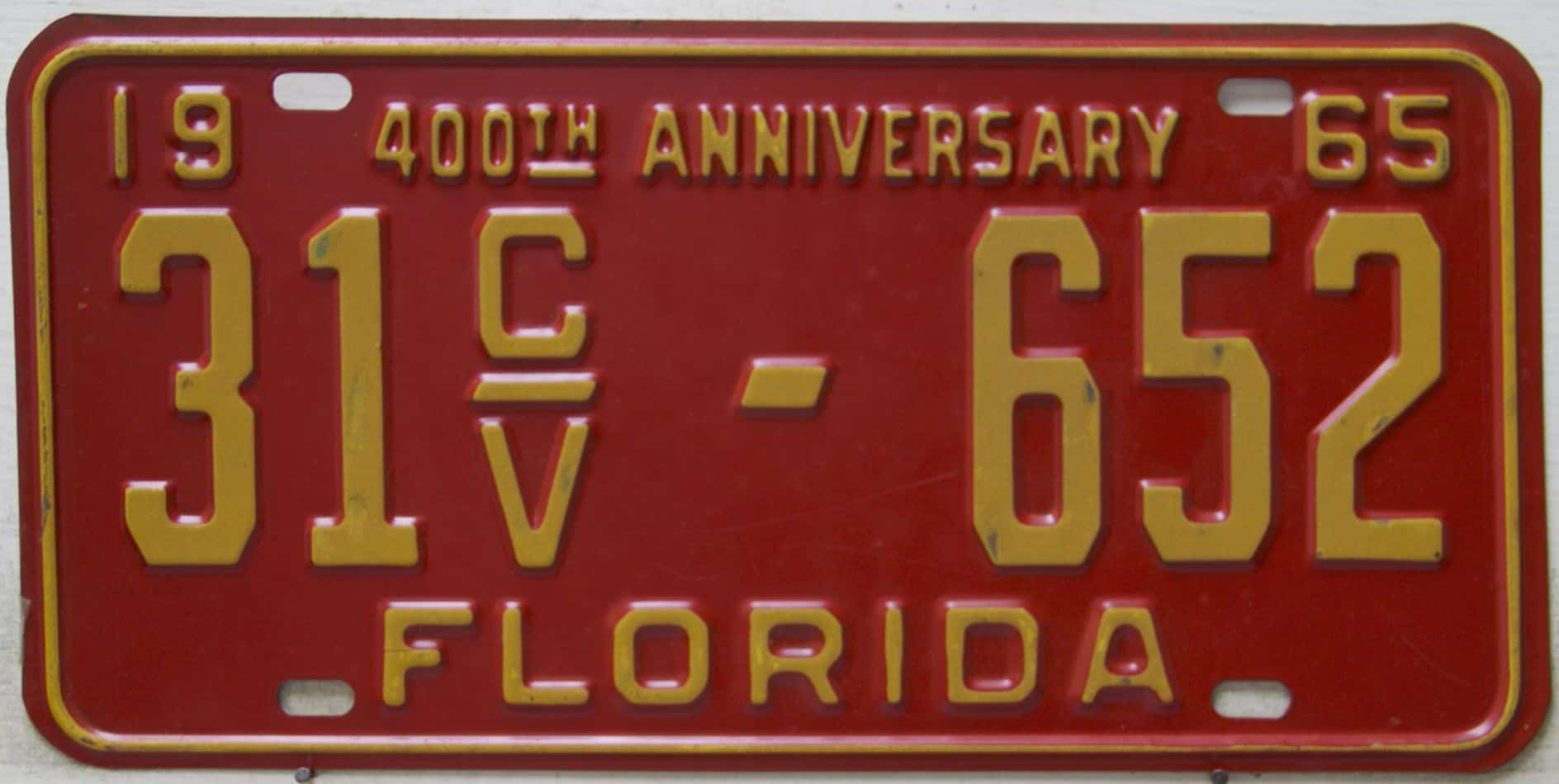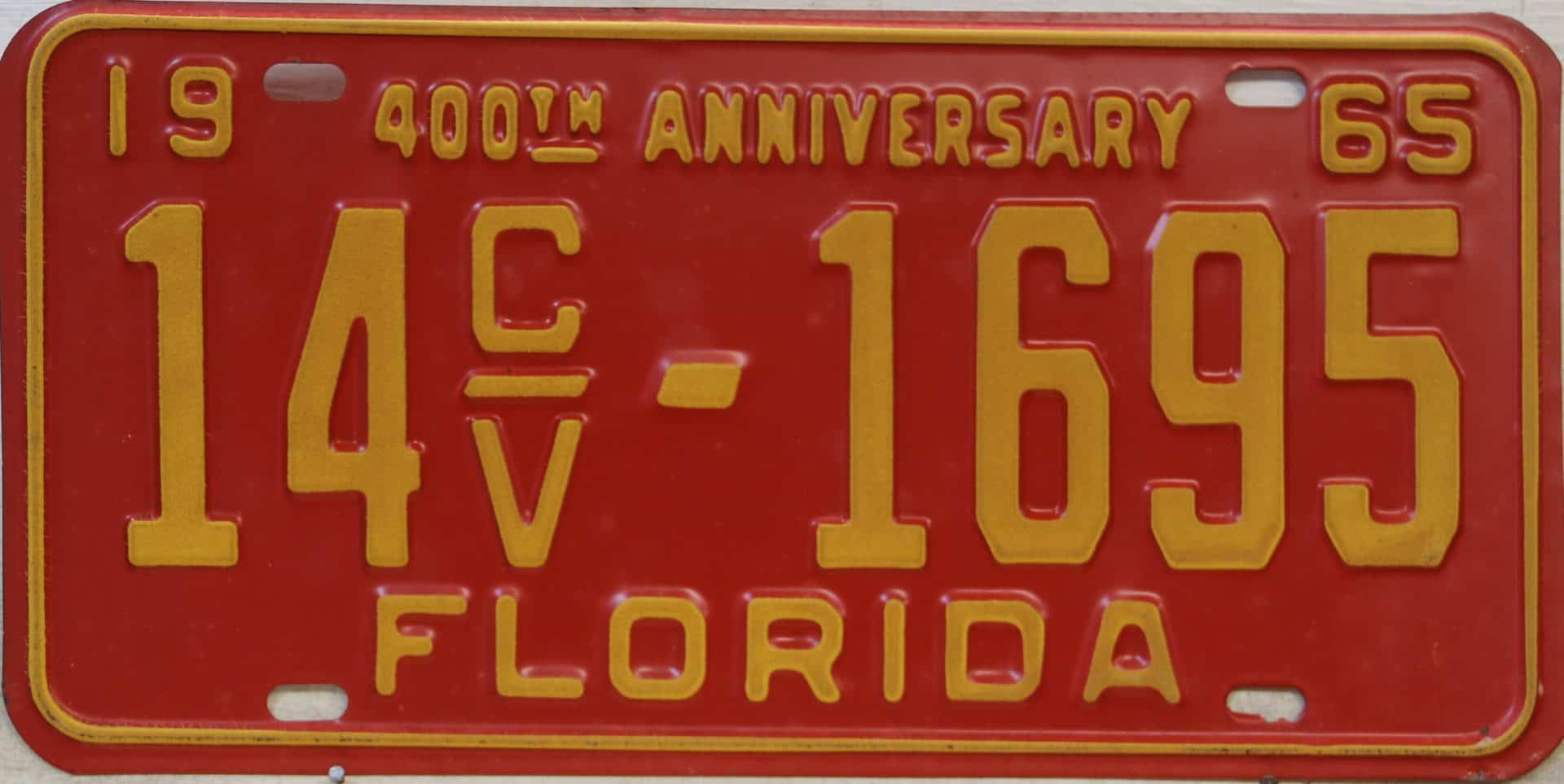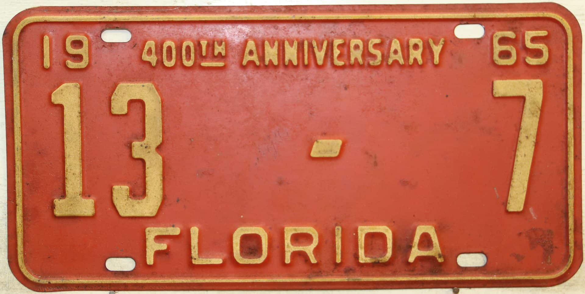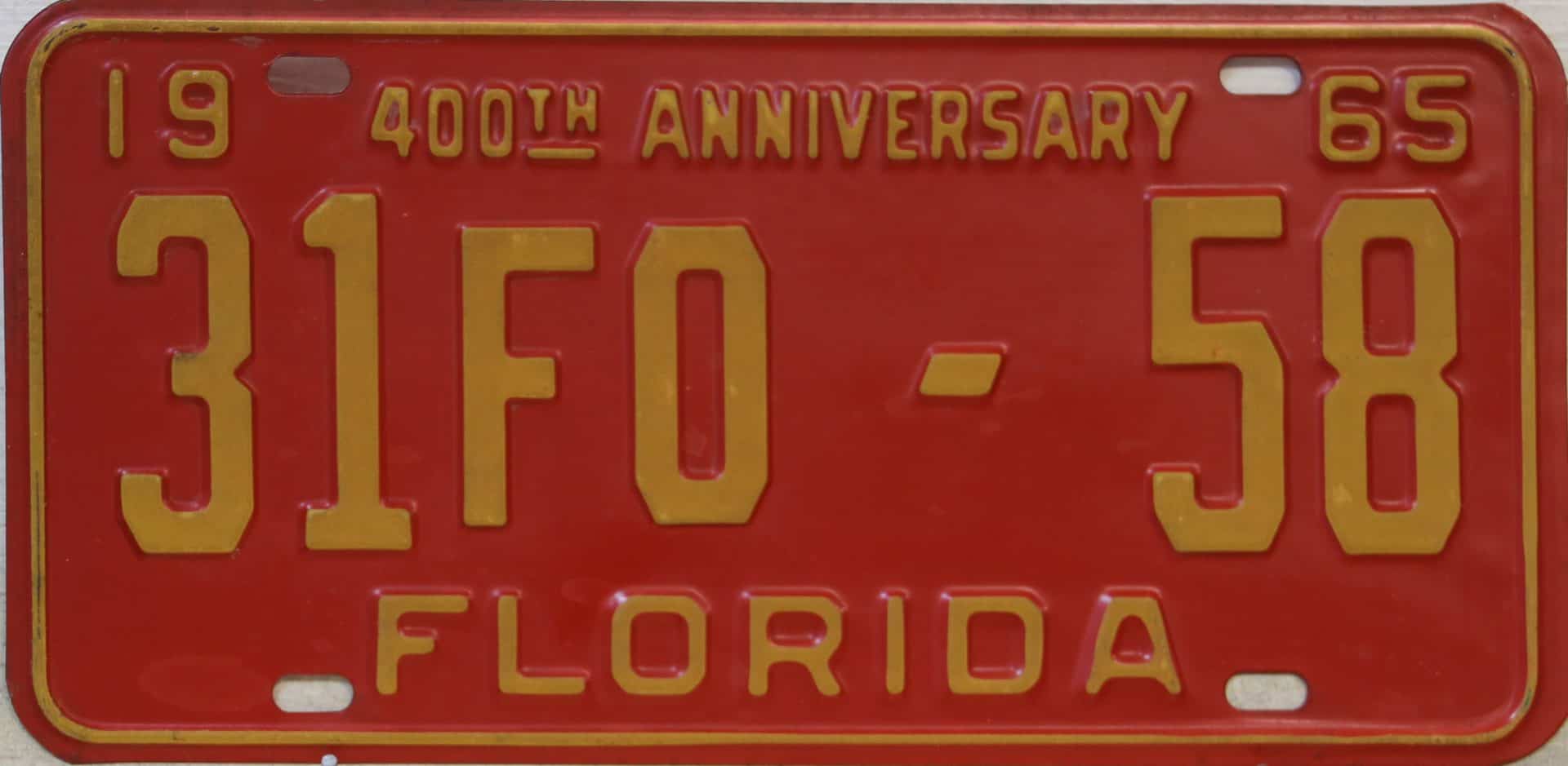 Don’t tell the indigenous inhabitants of Florida, but credit is given to Juan Ponce de Leon for ‘discovering’ Florida in 1565…so in 1965 Florida decided to honor that event by issuing a bright red plate with yellow letters and numbers (think Spanish hues)…as it also happened, I was in high school in 1965, about to sell my 1931 Model A Ford five-window coupe I had restored at our family’s gas station in Cutler, Florida…proceeds were to help fund my first year in college…it had a 1965 Florida plate on it, and I clearly remember focusing on it as the buyer drove it away…so 1965 Florida plates have always been among my favorites…with 67 counties in Florida, our plates for many years always carried the rank by population/registrations, and as you can see, we’re still missing Hamilton (56) and Lafayette (62) Counties…help!