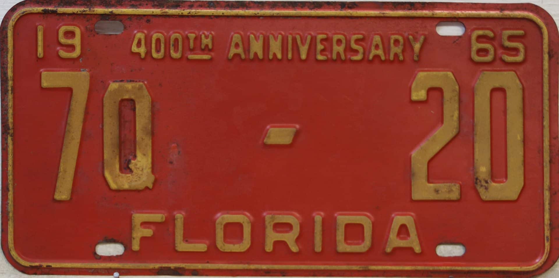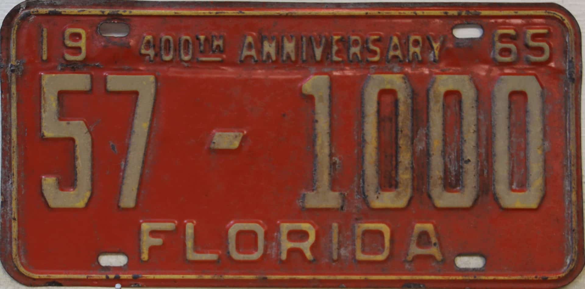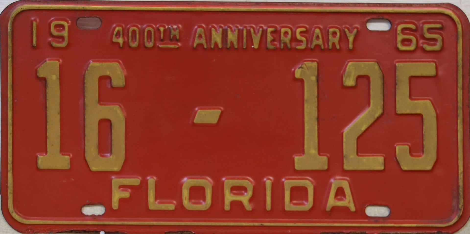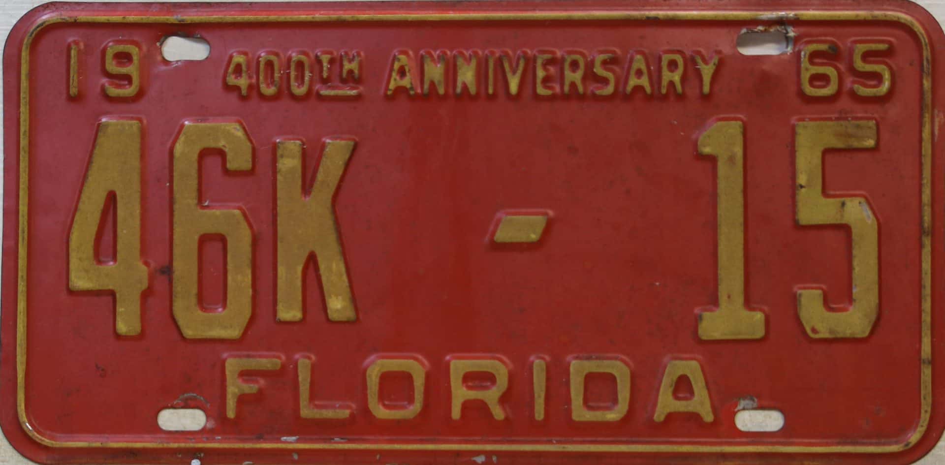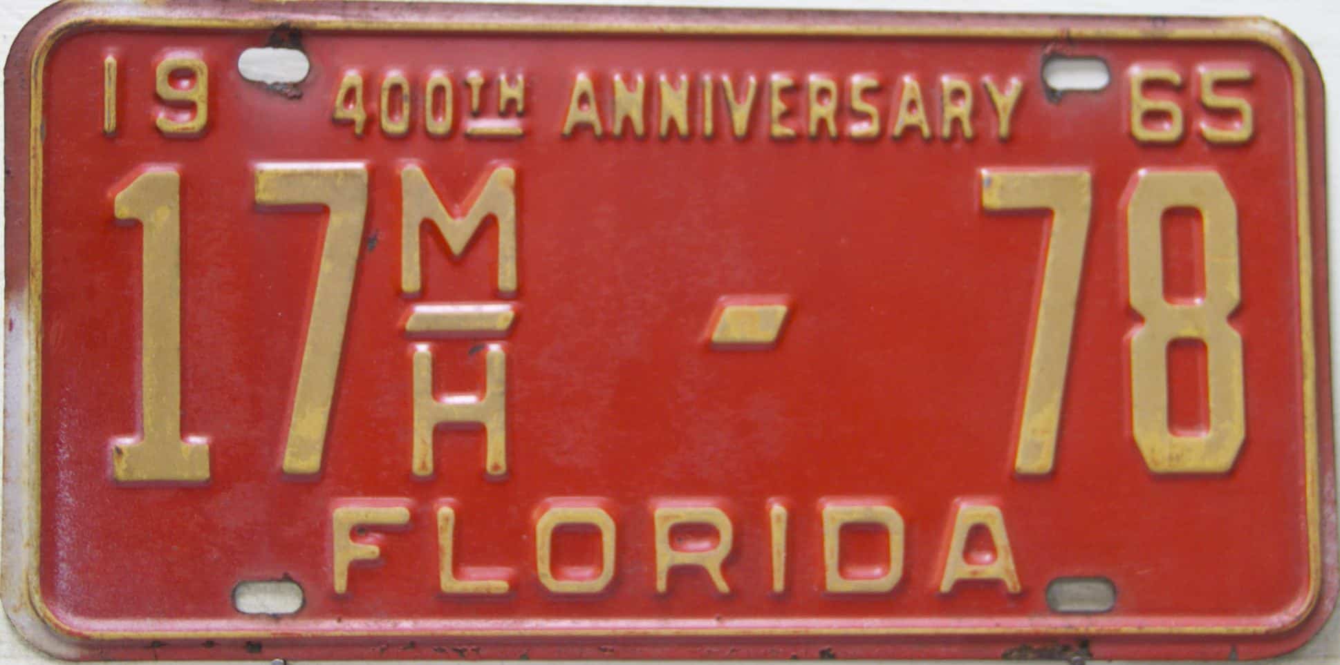 Don’t tell the indigenous inhabitants of Florida, but credit is given to Juan Ponce de Leon for ‘discovering’ Florida in 1565…so in 1965 Florida decided to honor that event by issuing a bright red plate with yellow letters and numbers (think Spanish hues)…as it also happened, I was in high school in 1965, about to sell my 1931 Model A Ford five-window coupe I had restored at our family’s gas station in Cutler, Florida…proceeds were to help fund my first year in college…it had a 1965 Florida plate on it, and I clearly remember focusing on it as the buyer drove it away…so 1965 Florida plates have always been among my favorites…with 67 counties in Florida, our plates for many years always carried the rank by population/registrations, and as you can see, we’re still missing Hamilton (56) and Lafayette (62) Counties…help!