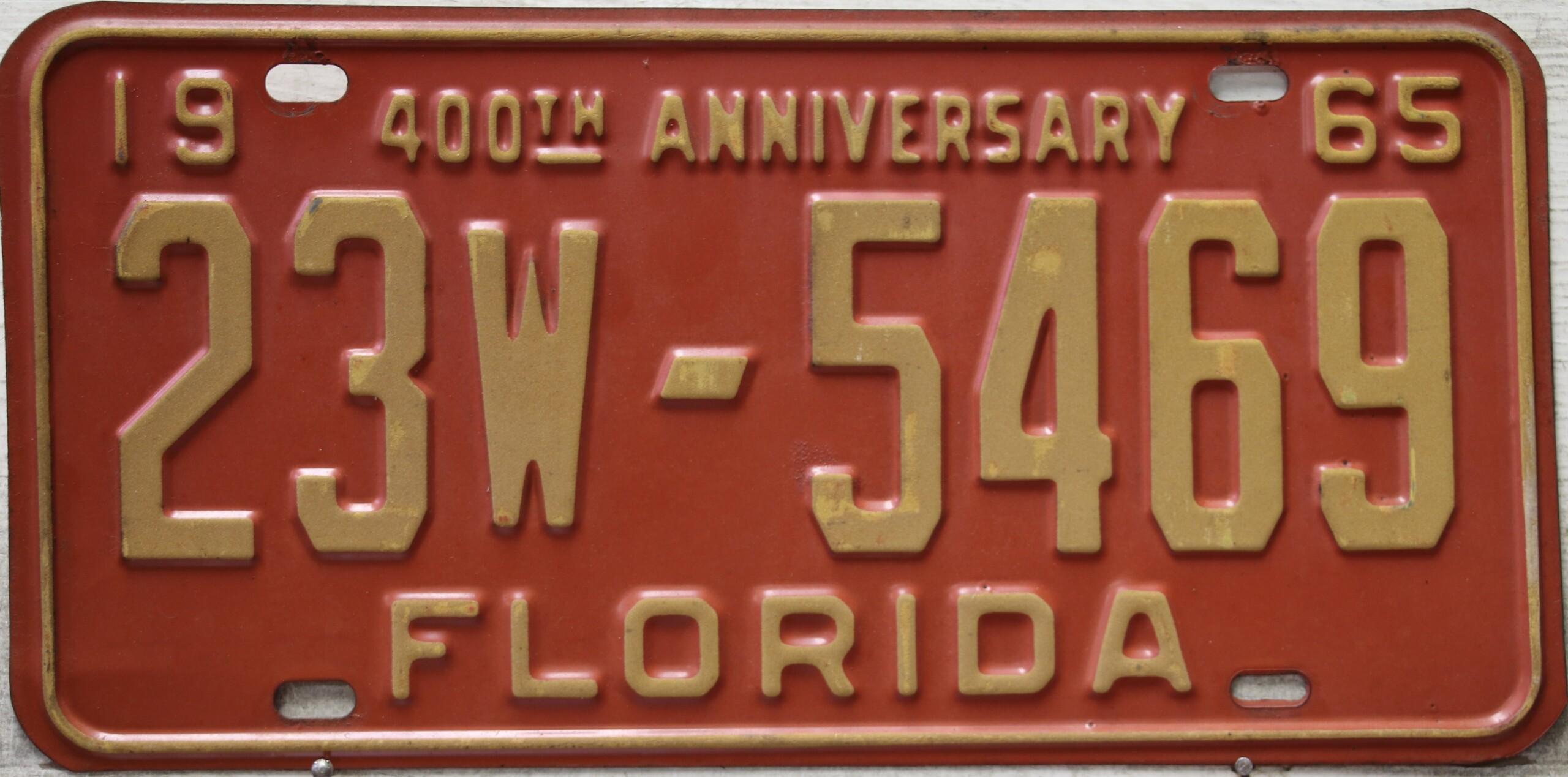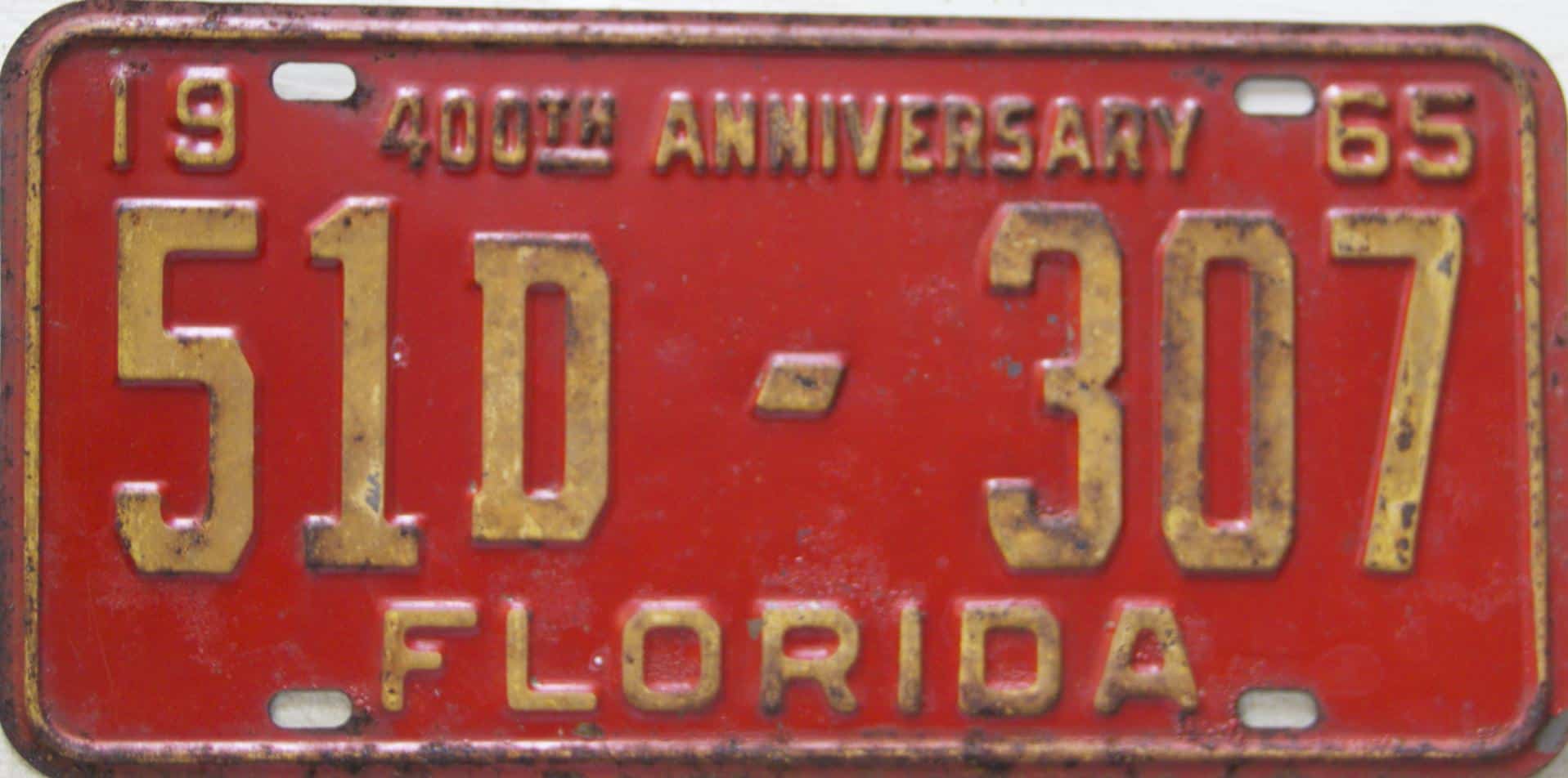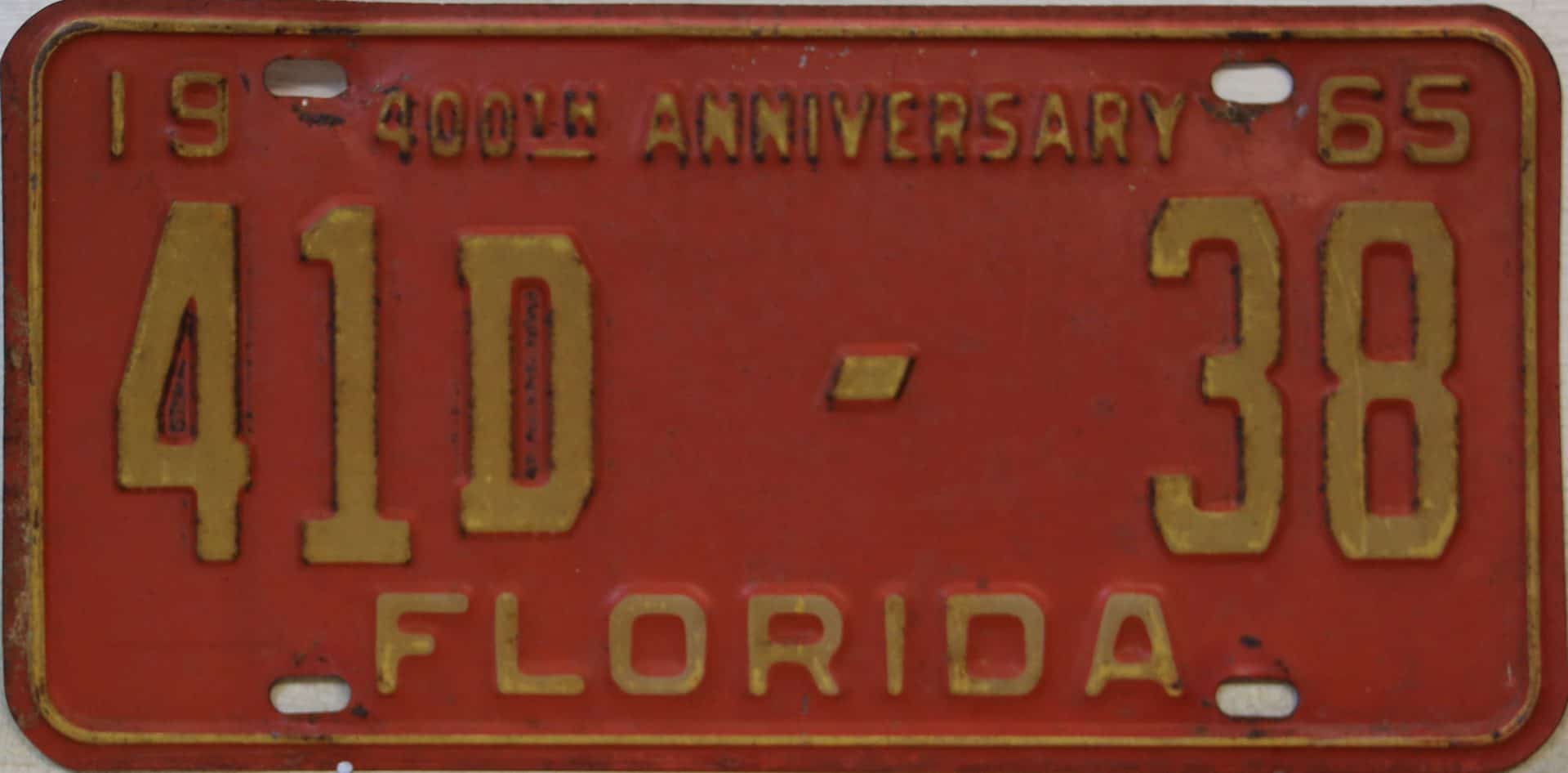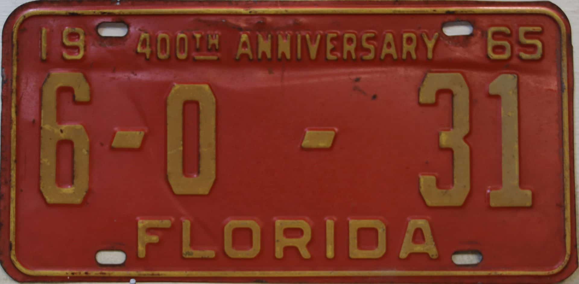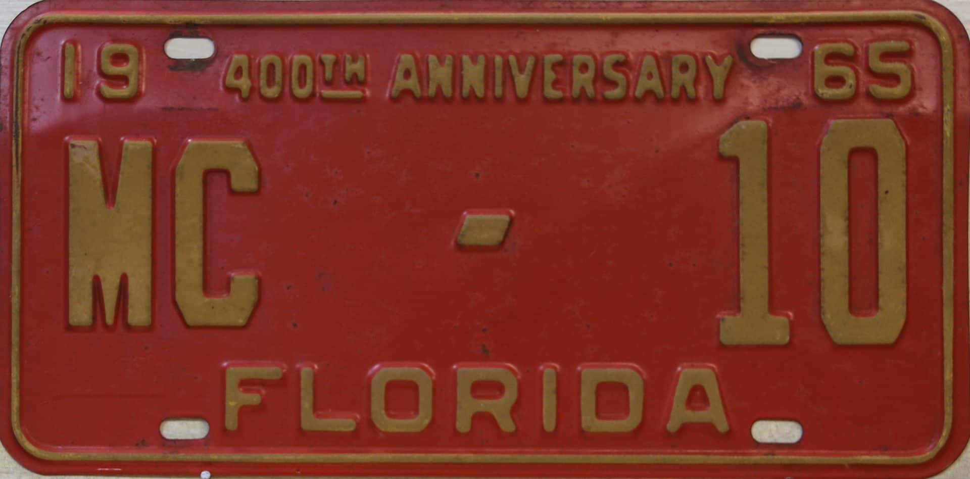 Don’t tell the indigenous inhabitants of Florida, but credit is given to Juan Ponce de Leon for ‘discovering’ Florida in 1565…so in 1965 Florida decided to honor that event by issuing a bright red plate with yellow letters and numbers (think Spanish hues)…as it also happened, I was in high school in 1965, about to sell my 1931 Model A Ford five-window coupe I had restored at our family’s gas station in Cutler, Florida…proceeds were to help fund my first year in college…it had a 1965 Florida plate on it, and I clearly remember focusing on it as the buyer drove it away…so 1965 Florida plates have always been among my favorites…with 67 counties in Florida, our plates for many years always carried the rank by population/registrations, and as you can see, we’re still missing Hamilton (56) and Lafayette (62) Counties…help!
