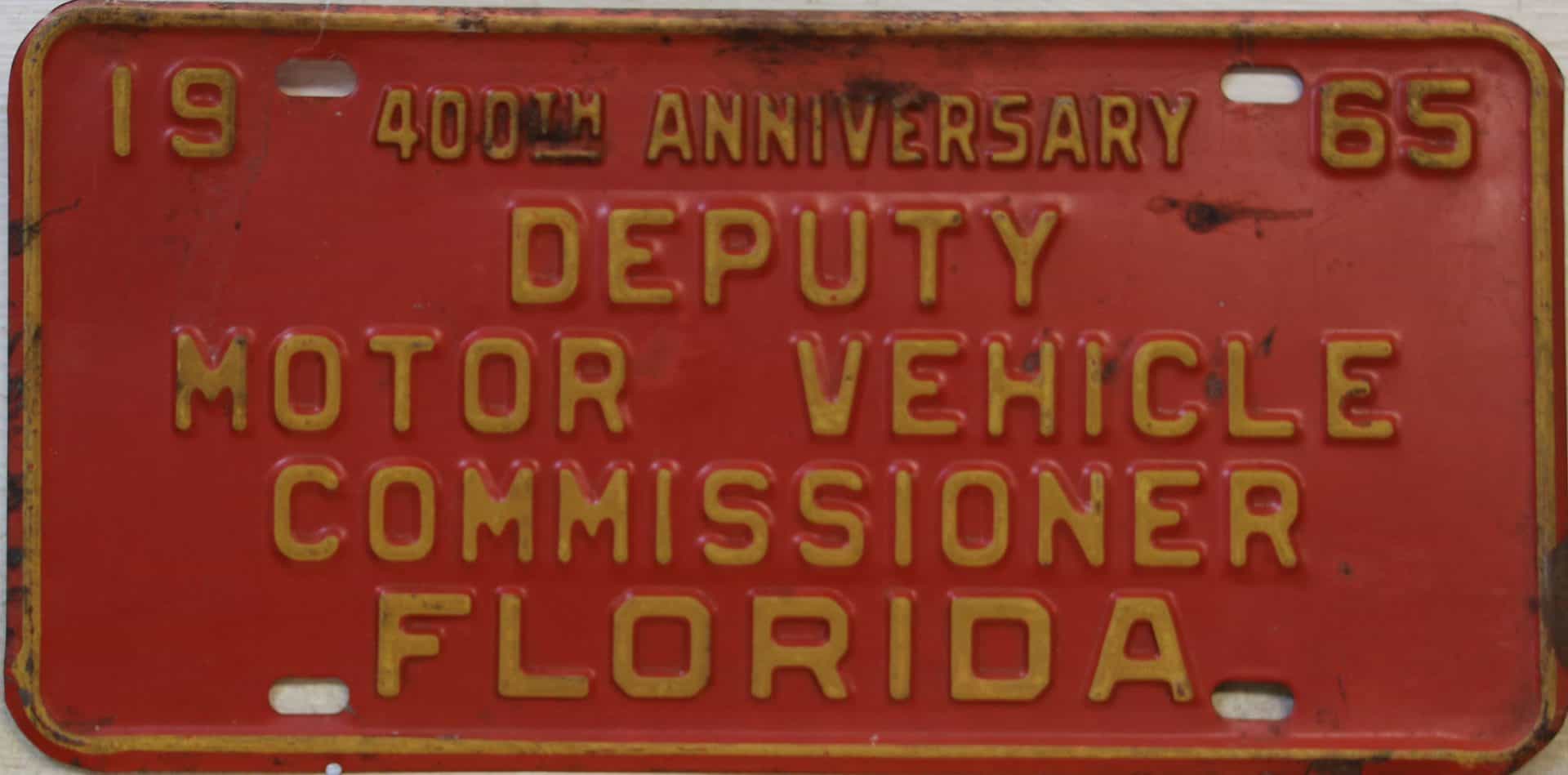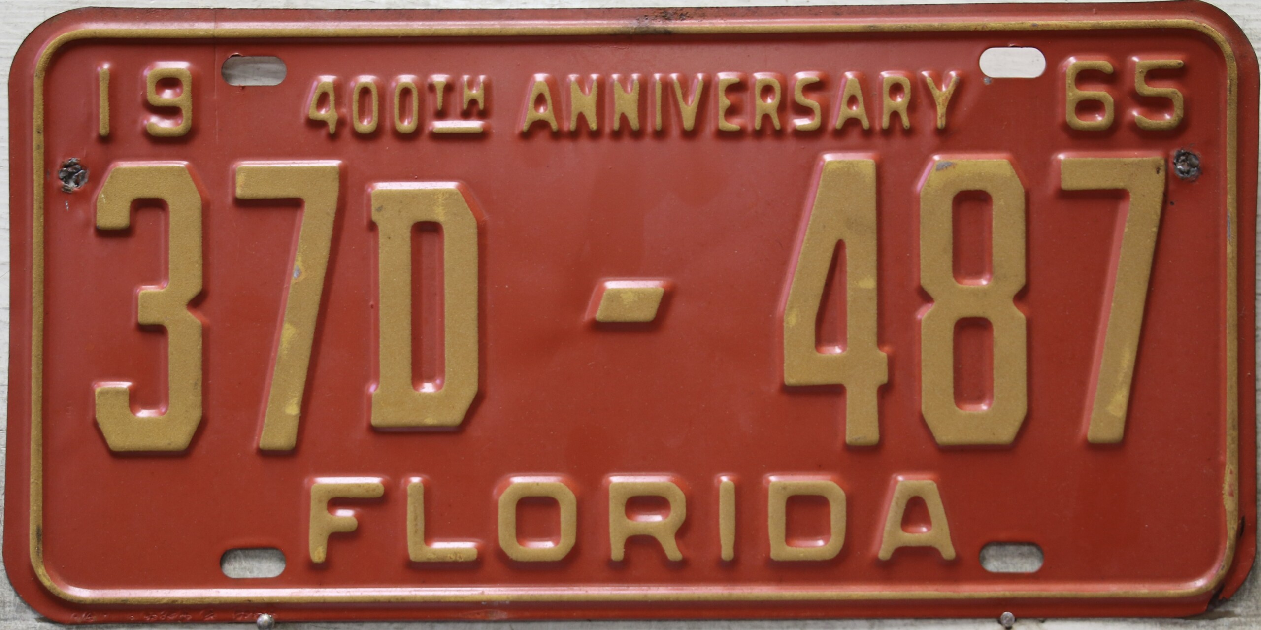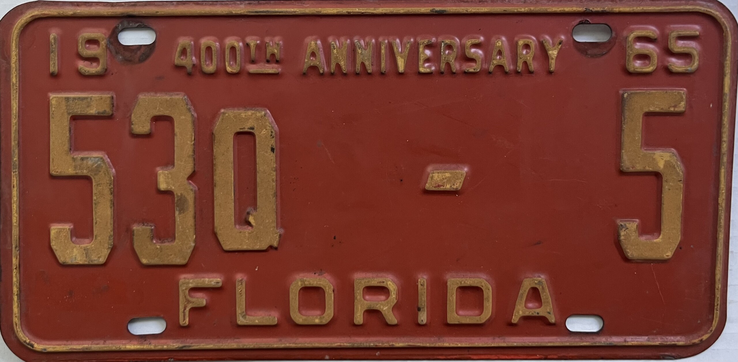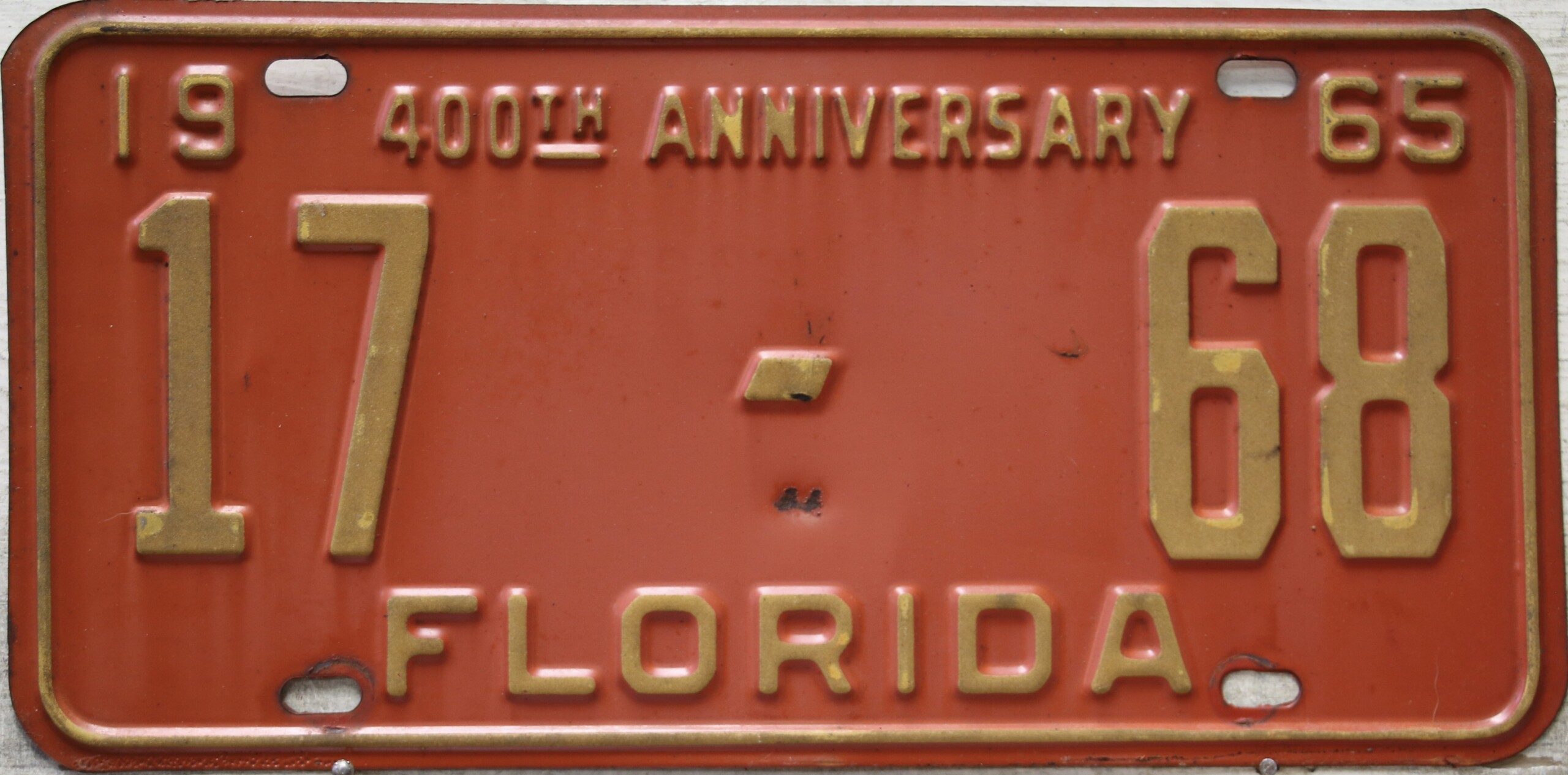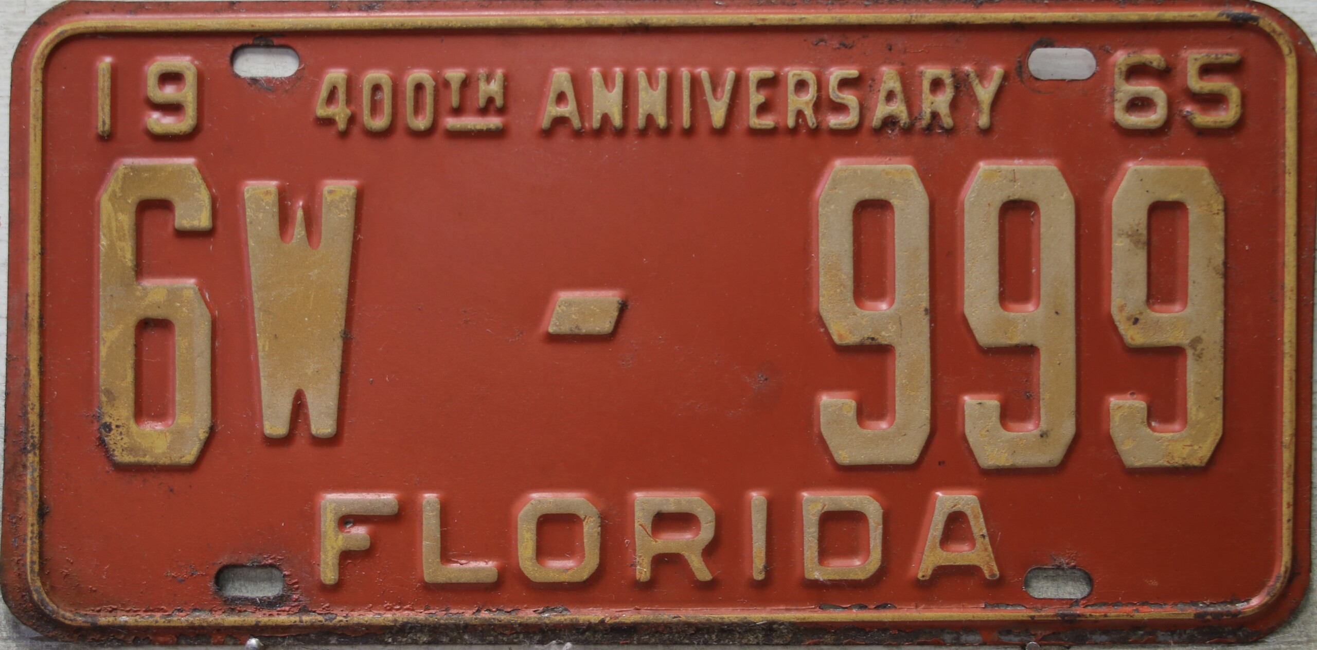 Don’t tell the indigenous inhabitants of Florida, but credit is given to Juan Ponce de Leon for ‘discovering’ Florida in 1565…so in 1965 Florida decided to honor that event by issuing a bright red plate with yellow letters and numbers (think Spanish hues)…as it also happened, I was in high school in 1965, about to sell my 1931 Model A Ford five-window coupe I had restored at our family’s gas station in Cutler, Florida…proceeds were to help fund my first year in college…it had a 1965 Florida plate on it, and I clearly remember focusing on it as the buyer drove it away…so 1965 Florida plates have always been among my favorites…with 67 counties in Florida, our plates for many years always carried the rank by population/registrations, and as you can see, we’re still missing Hamilton (56) and Lafayette (62) Counties…help!