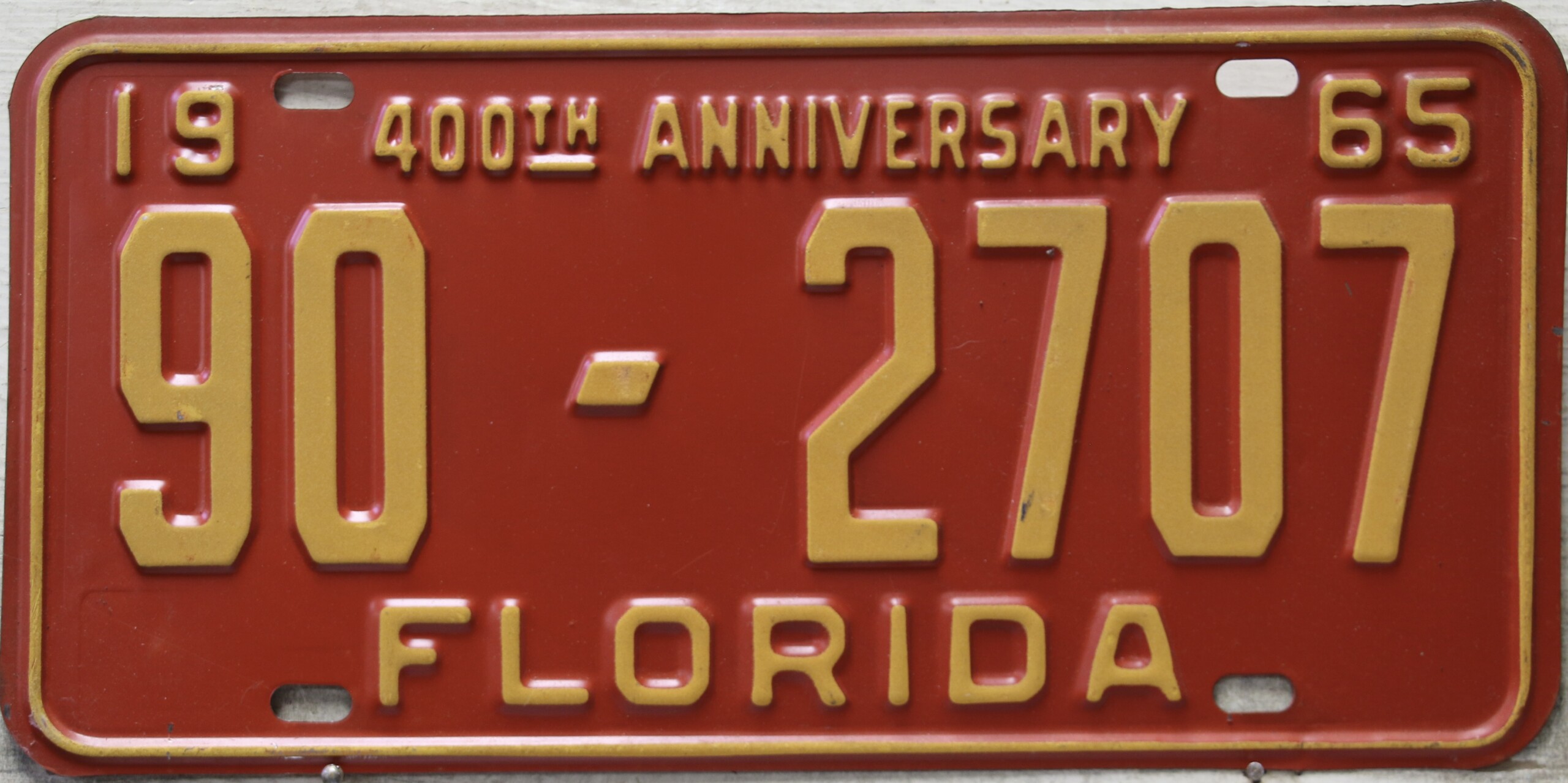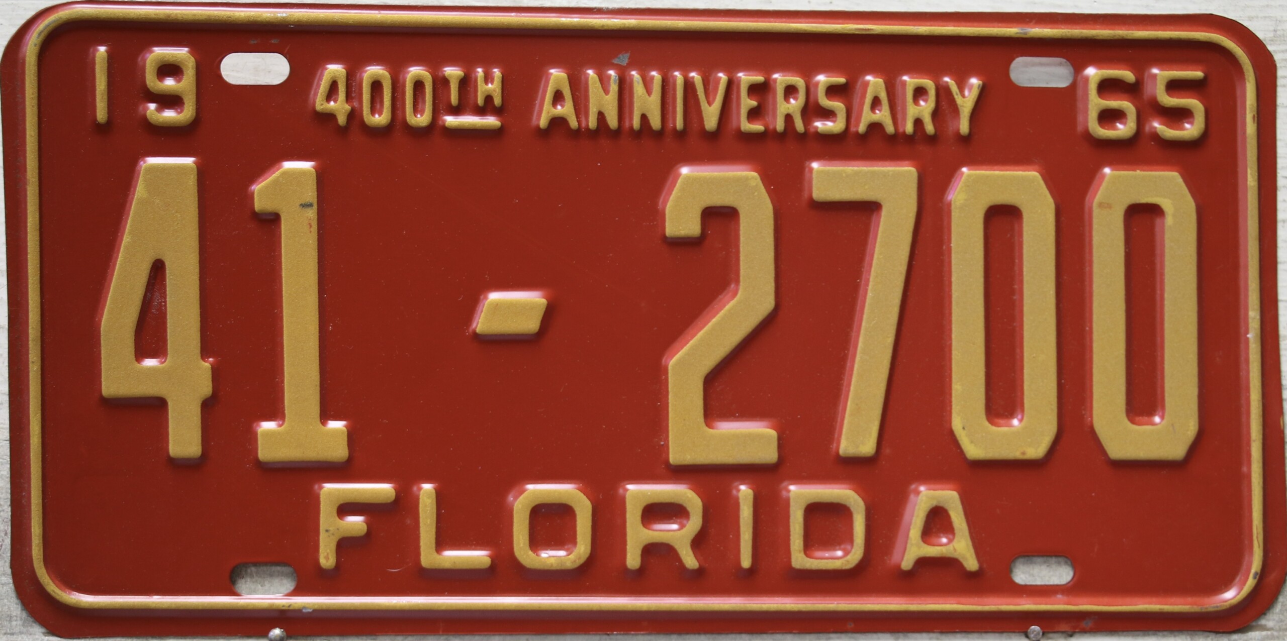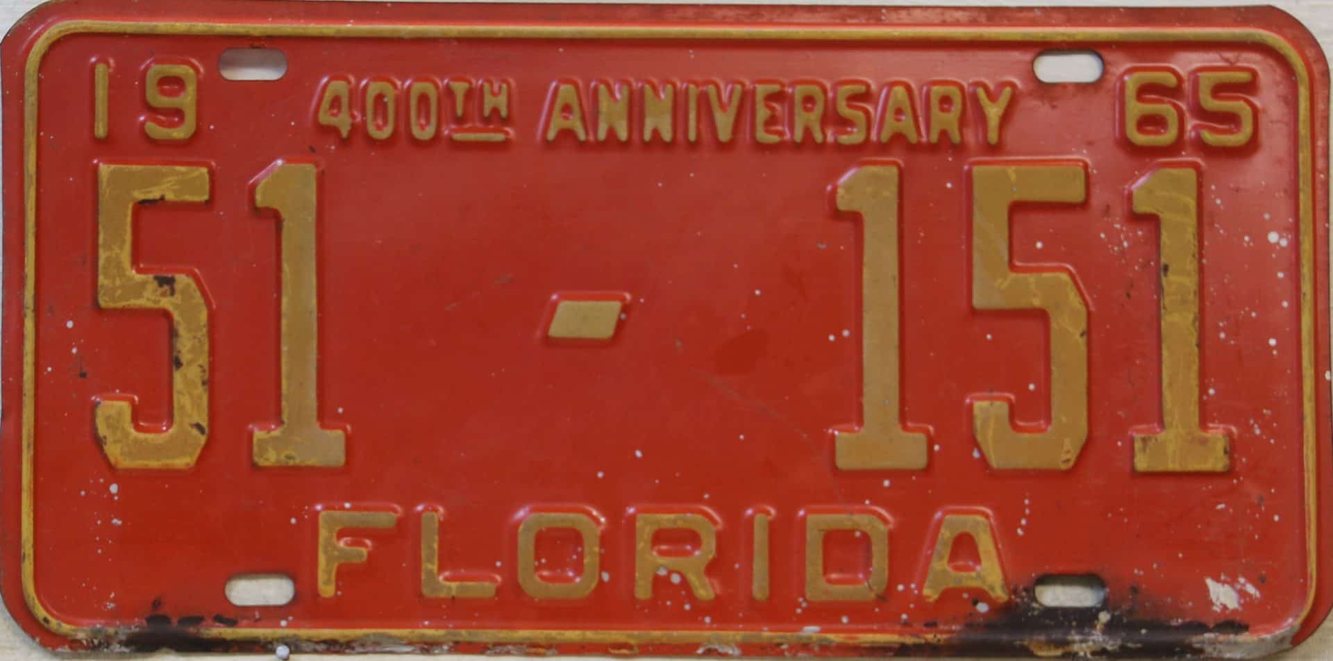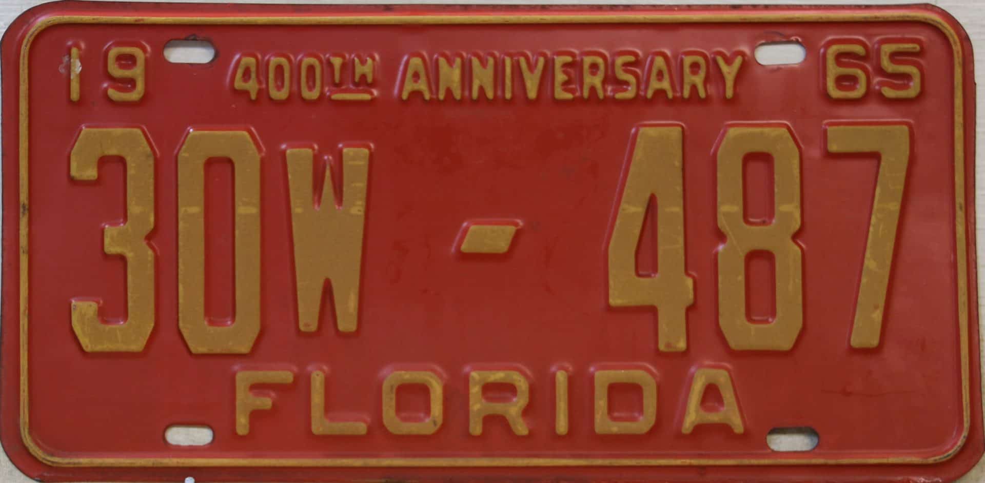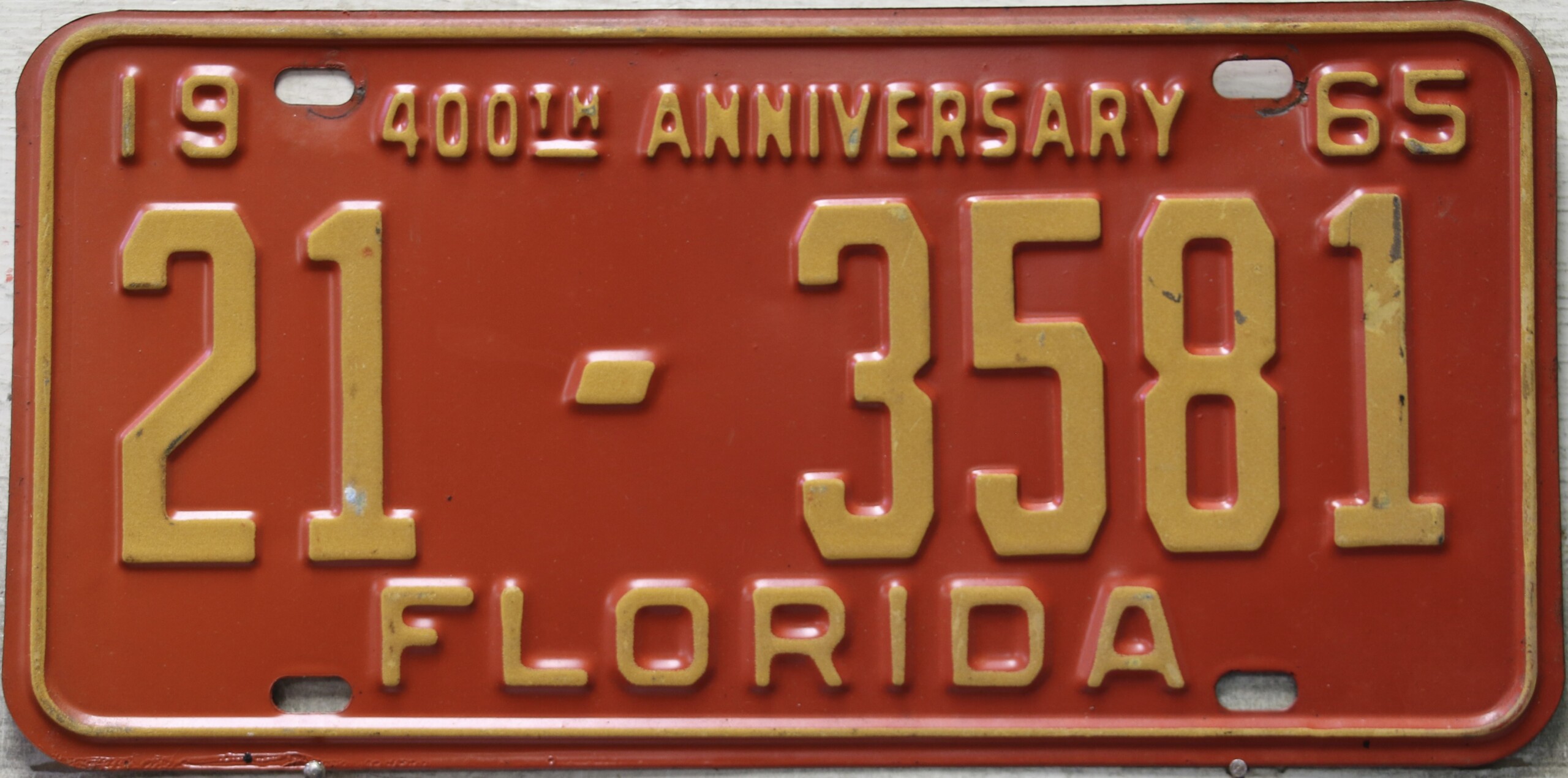 Don’t tell the indigenous inhabitants of Florida, but credit is given to Juan Ponce de Leon for ‘discovering’ Florida in 1565…so in 1965 Florida decided to honor that event by issuing a bright red plate with yellow letters and numbers (think Spanish hues)…as it also happened, I was in high school in 1965, about to sell my 1931 Model A Ford five-window coupe I had restored at our family’s gas station in Cutler, Florida…proceeds were to help fund my first year in college…it had a 1965 Florida plate on it, and I clearly remember focusing on it as the buyer drove it away…so 1965 Florida plates have always been among my favorites…with 67 counties in Florida, our plates for many years always carried the rank by population/registrations, and as you can see, we’re still missing Hamilton (56) and Lafayette (62) Counties…help!