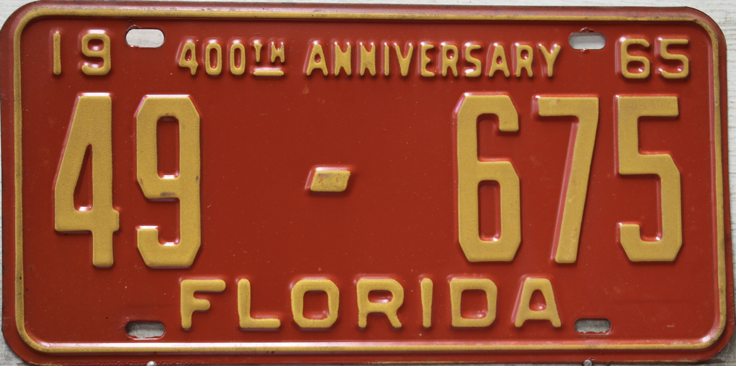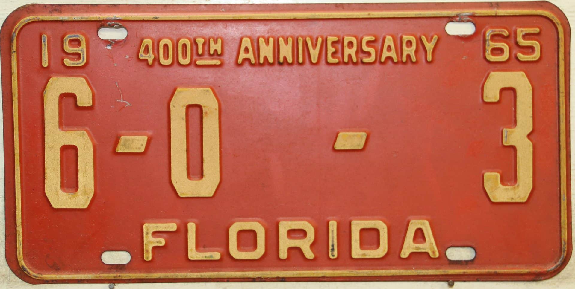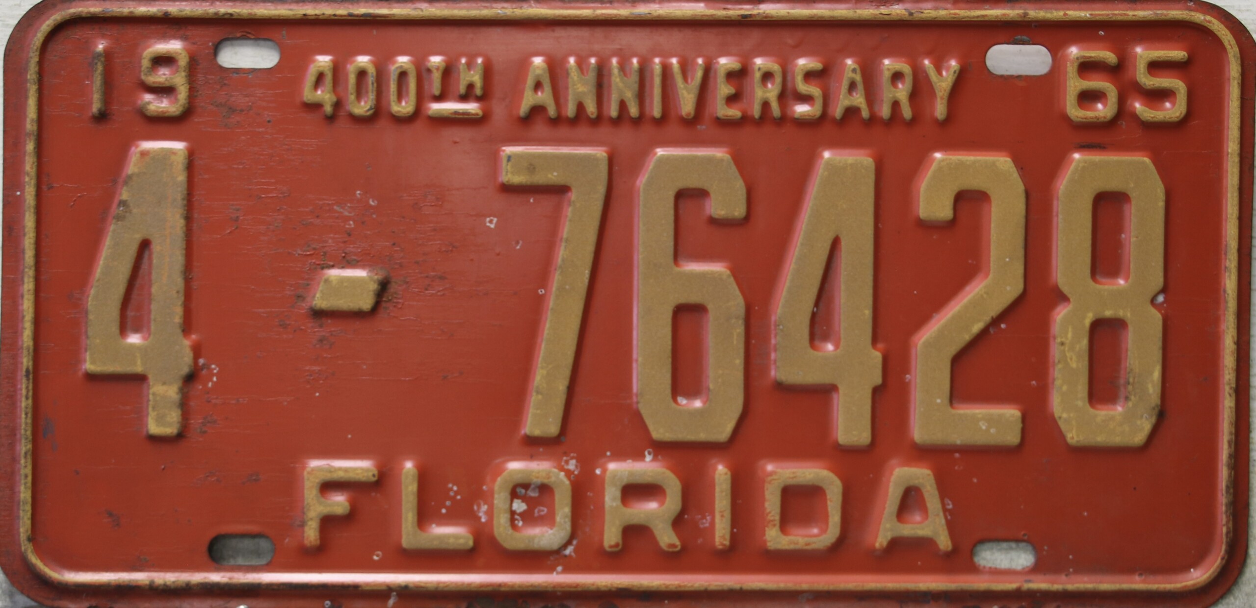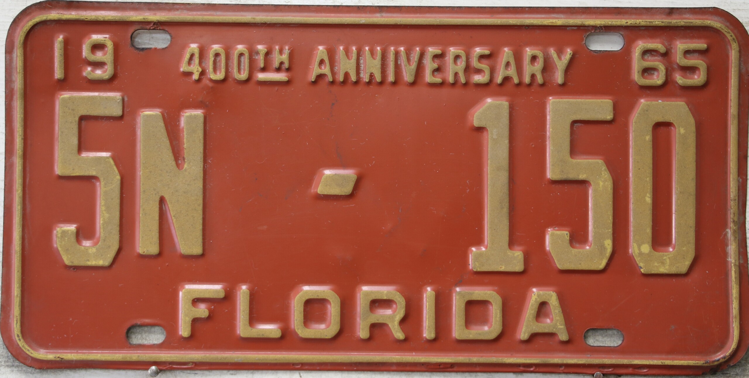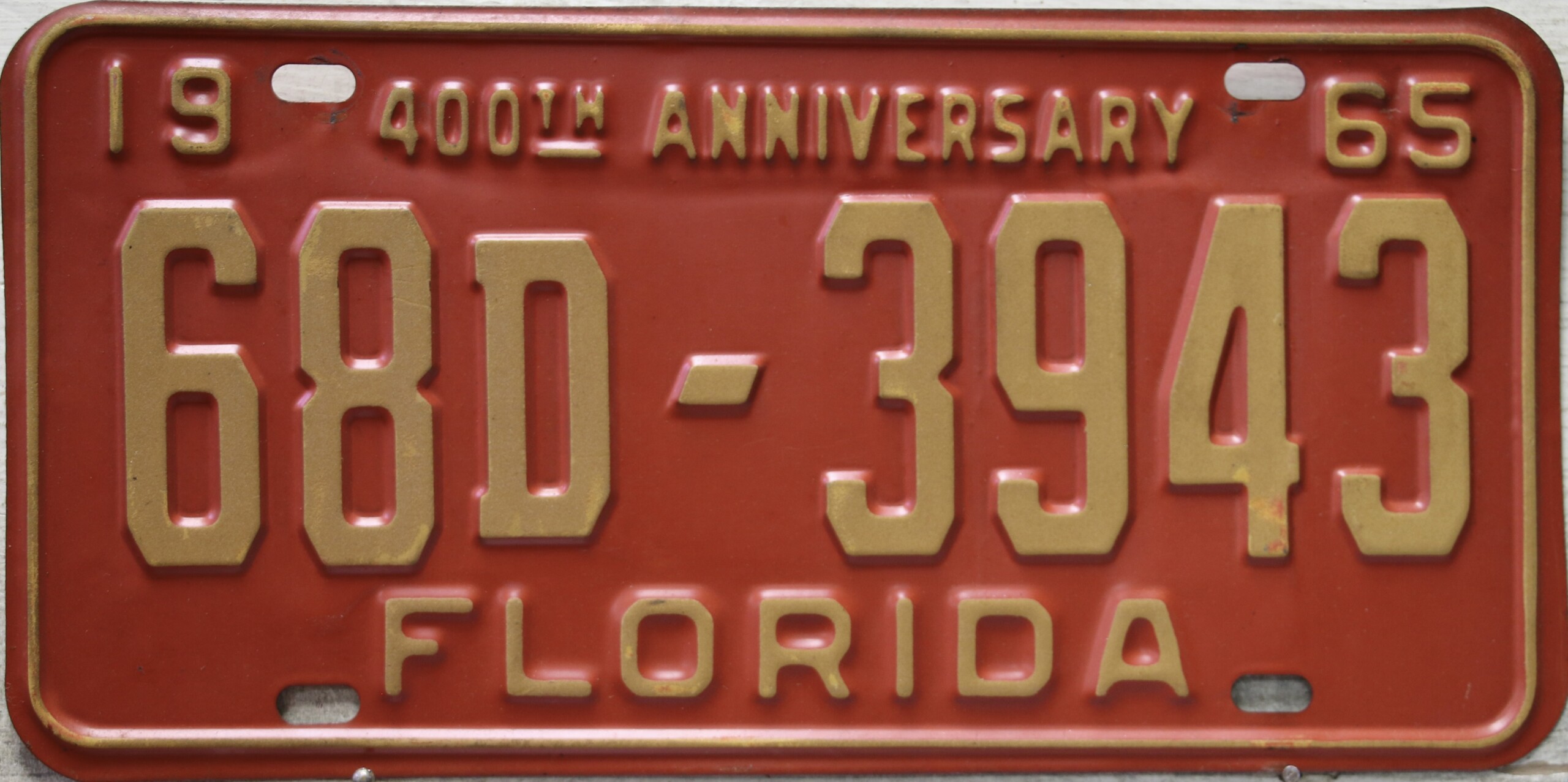 Don’t tell the indigenous inhabitants of Florida, but credit is given to Juan Ponce de Leon for ‘discovering’ Florida in 1565…so in 1965 Florida decided to honor that event by issuing a bright red plate with yellow letters and numbers (think Spanish hues)…as it also happened, I was in high school in 1965, about to sell my 1931 Model A Ford five-window coupe I had restored at our family’s gas station in Cutler, Florida…proceeds were to help fund my first year in college…it had a 1965 Florida plate on it, and I clearly remember focusing on it as the buyer drove it away…so 1965 Florida plates have always been among my favorites…with 67 counties in Florida, our plates for many years always carried the rank by population/registrations, and as you can see, we’re still missing Hamilton (56) and Lafayette (62) Counties…help!