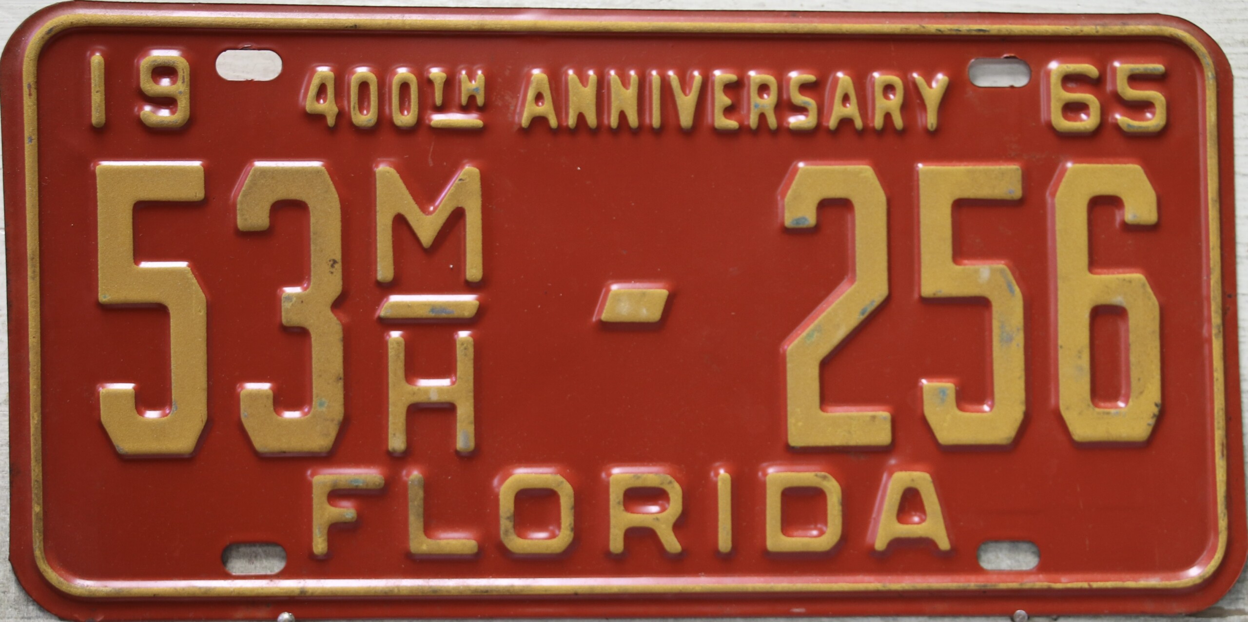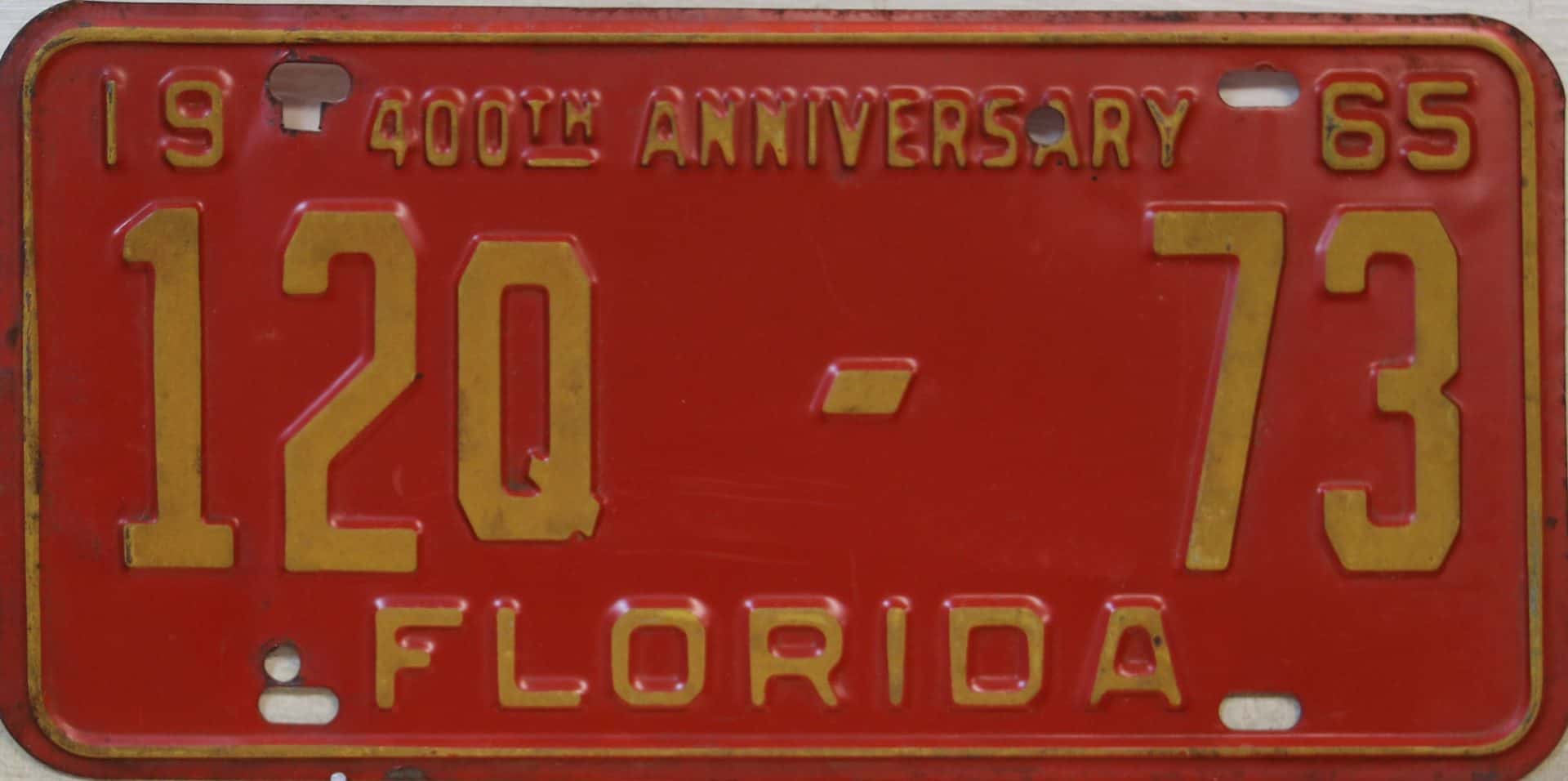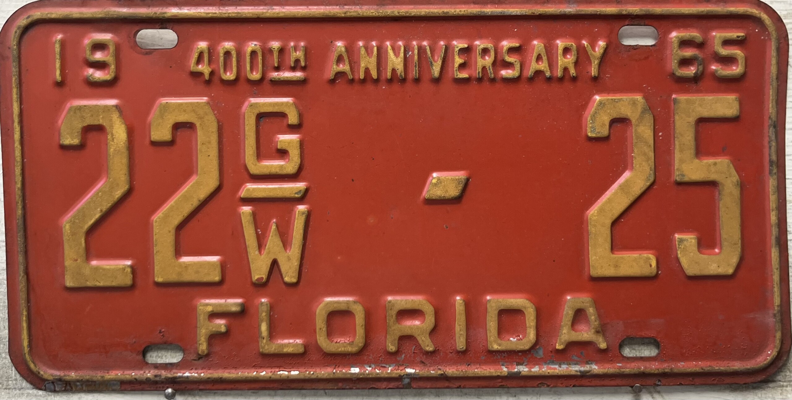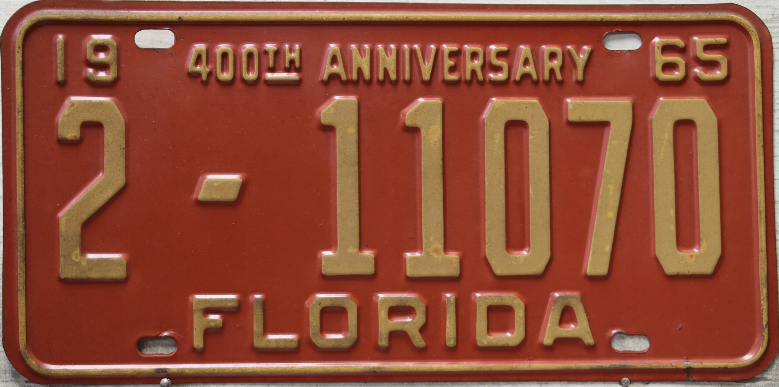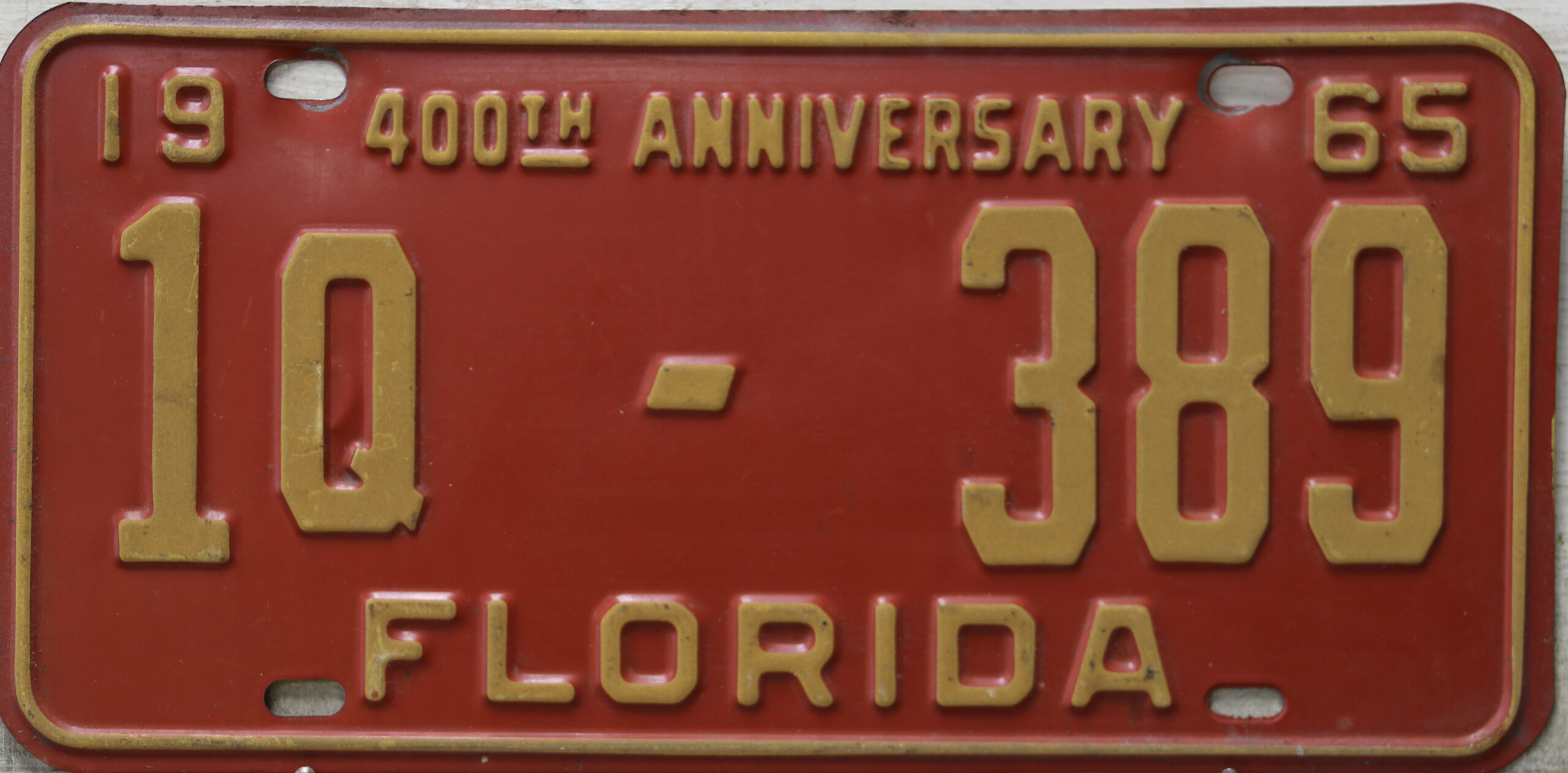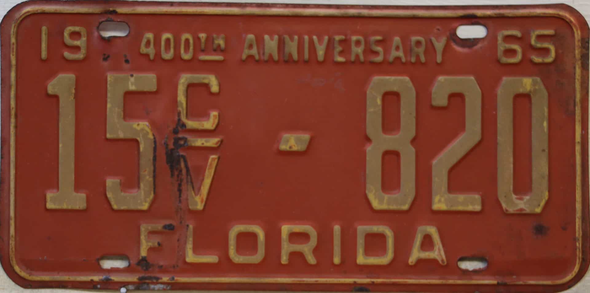 Don’t tell the indigenous inhabitants of Florida, but credit is given to Juan Ponce de Leon for ‘discovering’ Florida in 1565…so in 1965 Florida decided to honor that event by issuing a bright red plate with yellow letters and numbers (think Spanish hues)…as it also happened, I was in high school in 1965, about to sell my 1931 Model A Ford five-window coupe I had restored at our family’s gas station in Cutler, Florida…proceeds were to help fund my first year in college…it had a 1965 Florida plate on it, and I clearly remember focusing on it as the buyer drove it away…so 1965 Florida plates have always been among my favorites…with 67 counties in Florida, our plates for many years always carried the rank by population/registrations, and as you can see, we’re still missing Hamilton (56) and Lafayette (62) Counties…help!
