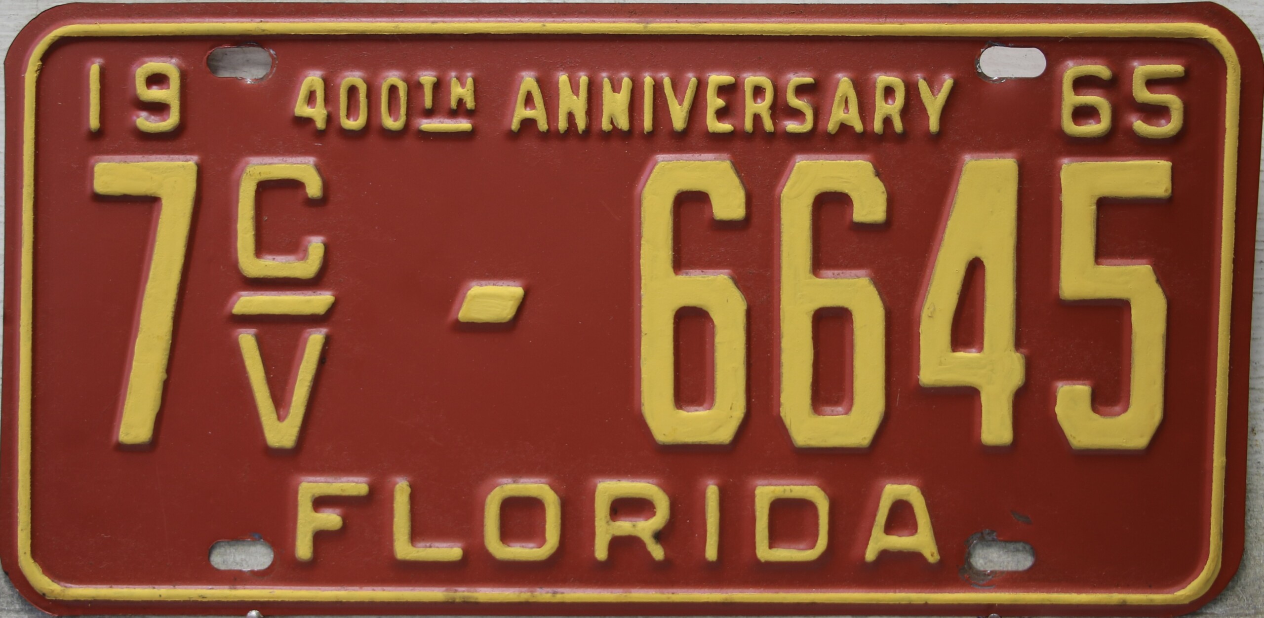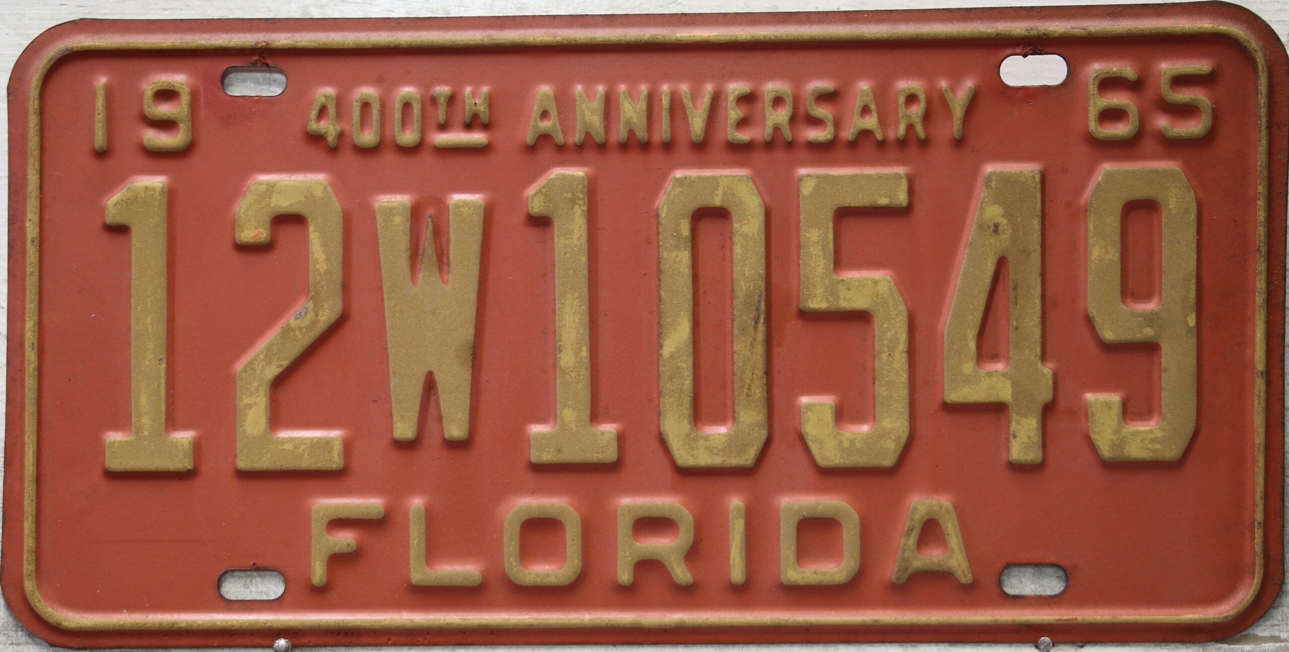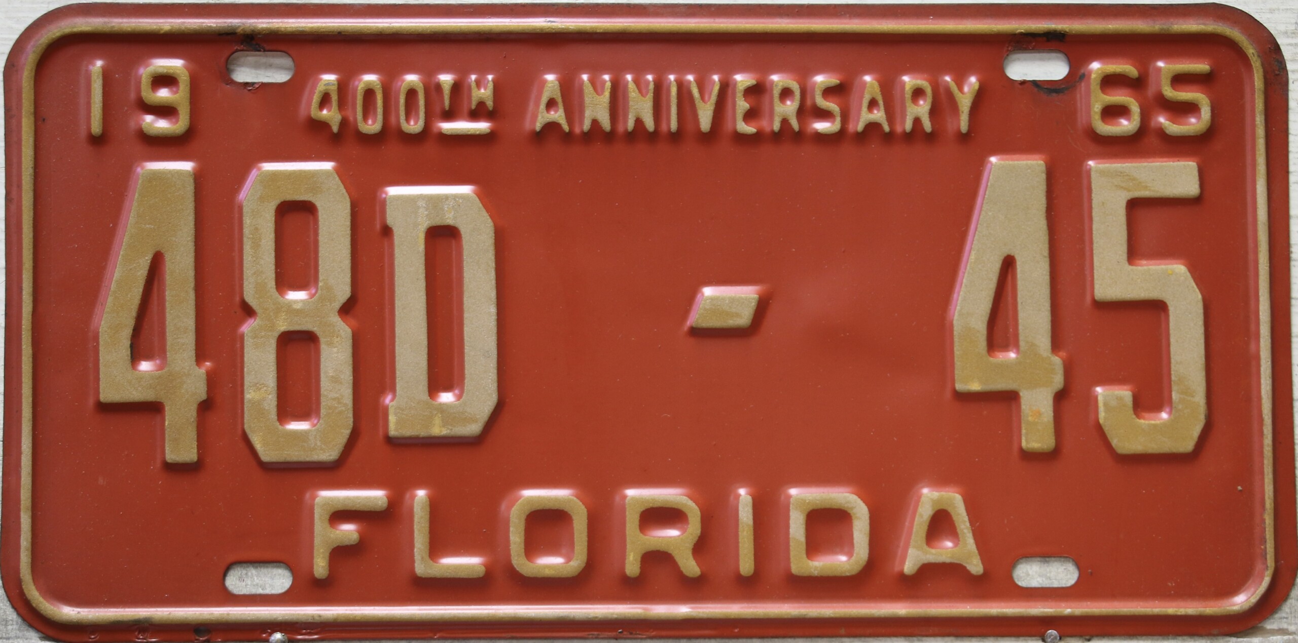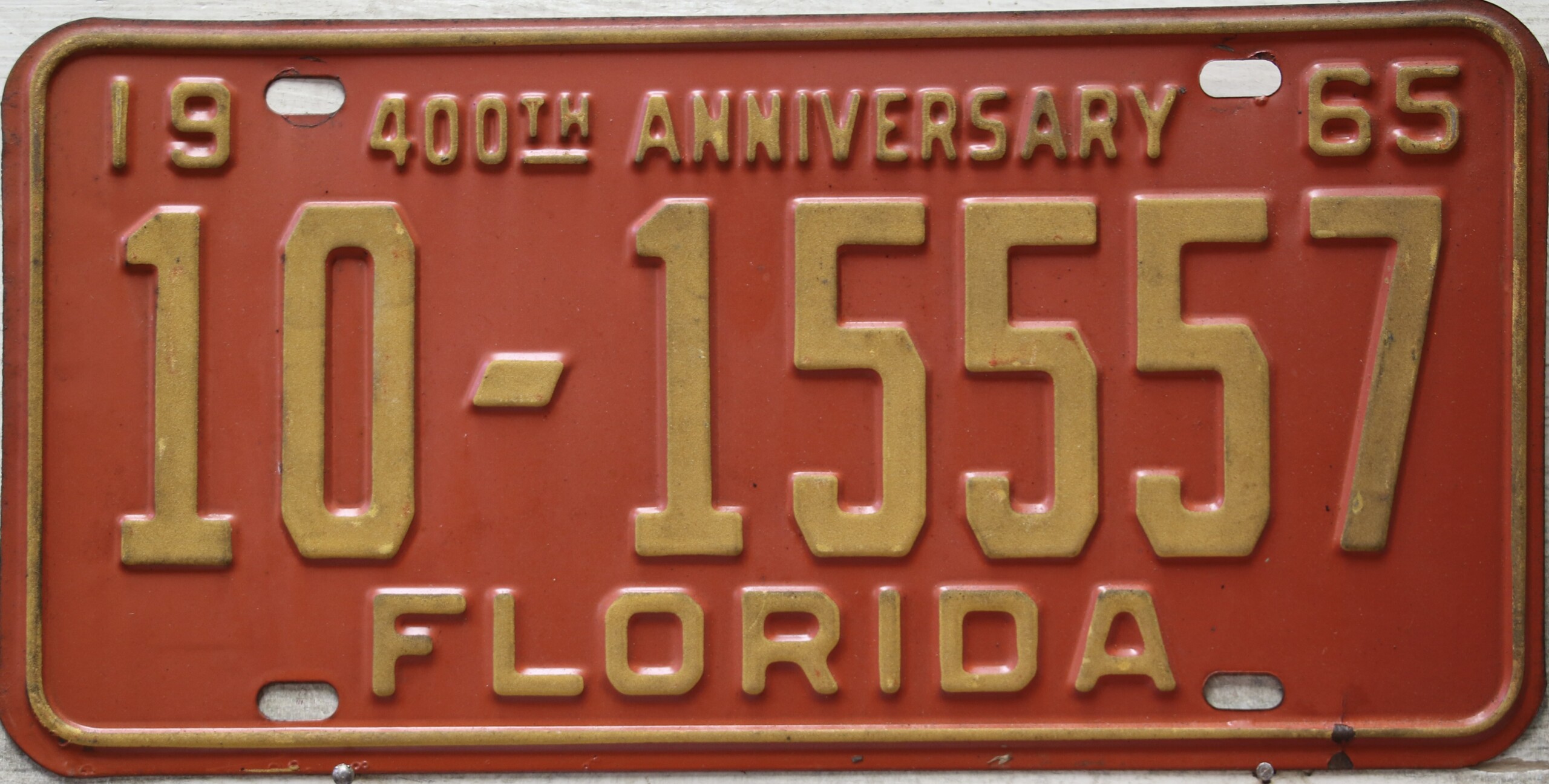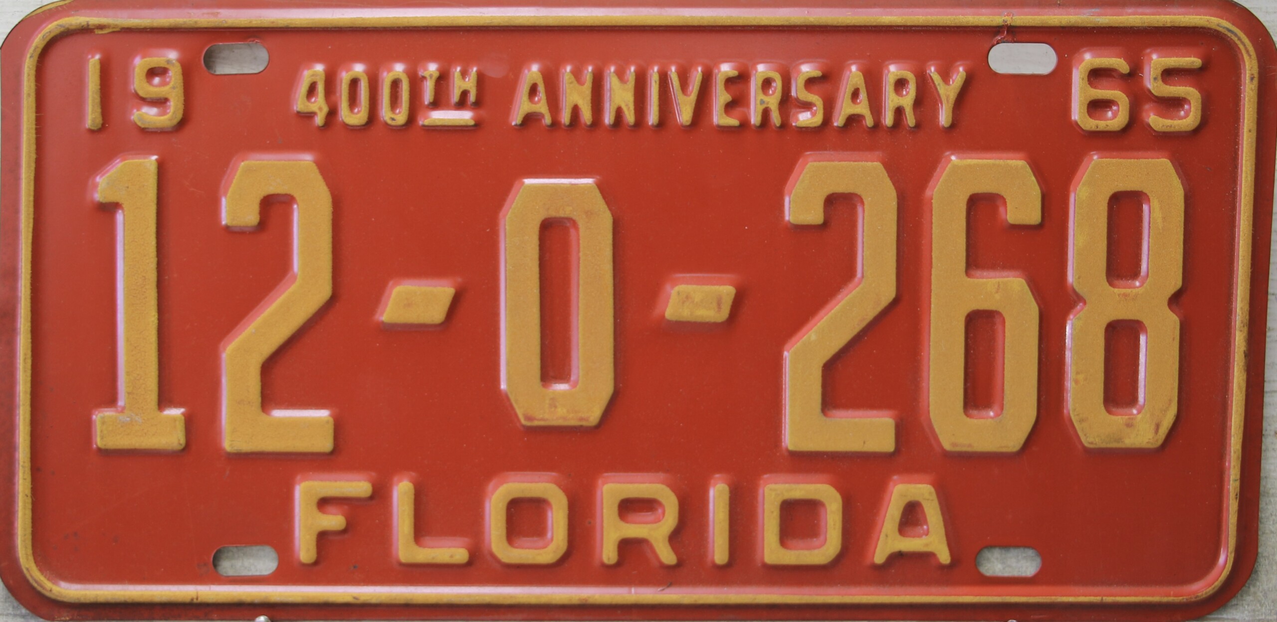 Don’t tell the indigenous inhabitants of Florida, but credit is given to Juan Ponce de Leon for ‘discovering’ Florida in 1565…so in 1965 Florida decided to honor that event by issuing a bright red plate with yellow letters and numbers (think Spanish hues)…as it also happened, I was in high school in 1965, about to sell my 1931 Model A Ford five-window coupe I had restored at our family’s gas station in Cutler, Florida…proceeds were to help fund my first year in college…it had a 1965 Florida plate on it, and I clearly remember focusing on it as the buyer drove it away…so 1965 Florida plates have always been among my favorites…with 67 counties in Florida, our plates for many years always carried the rank by population/registrations, and as you can see, we’re still missing Hamilton (56) and Lafayette (62) Counties…help!