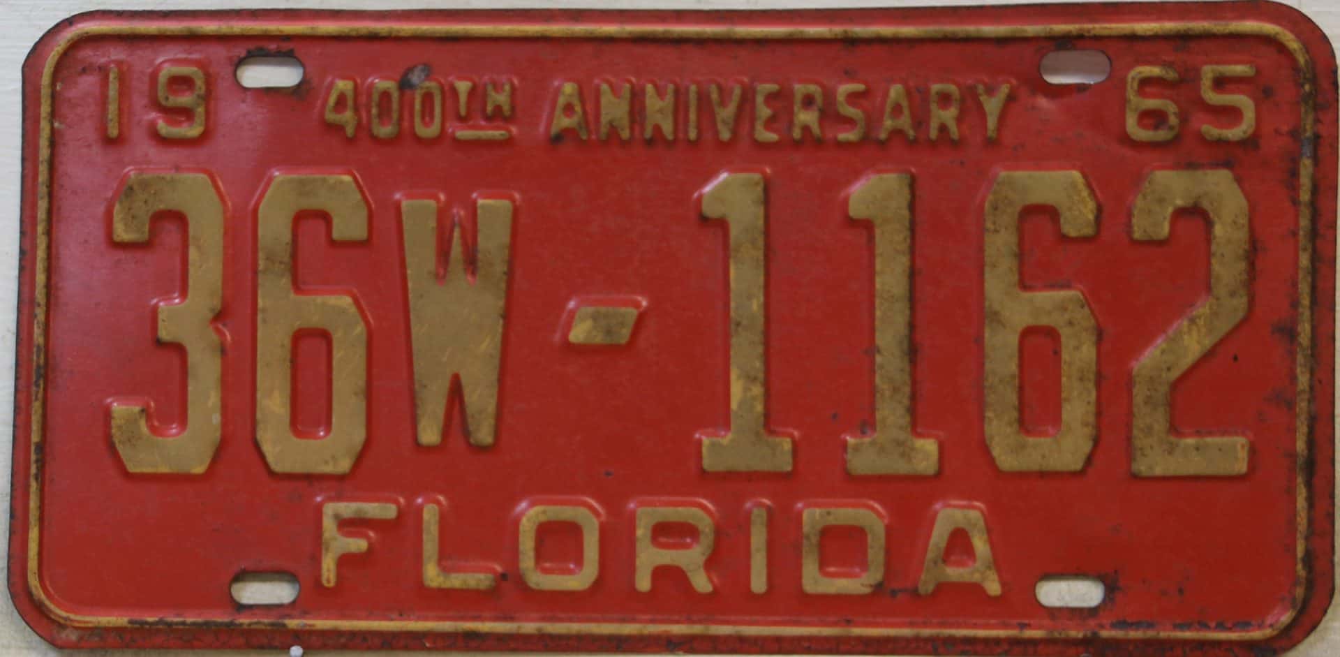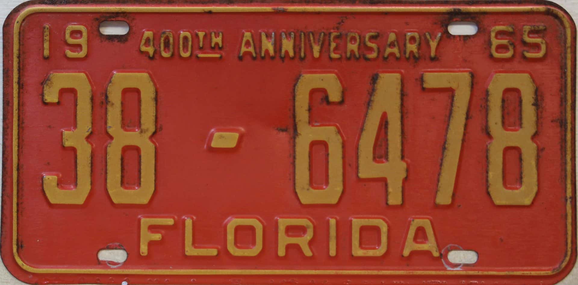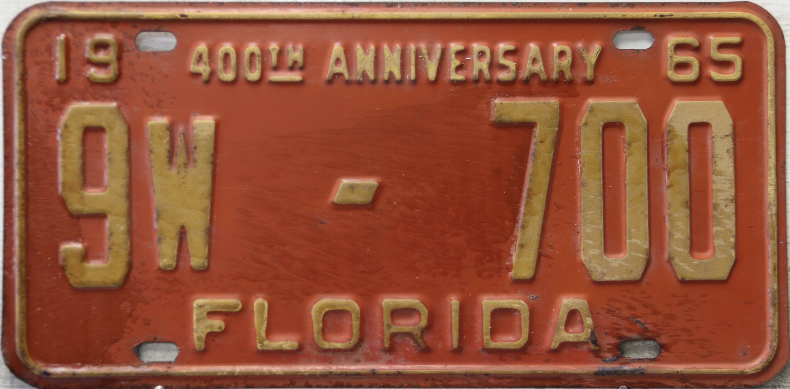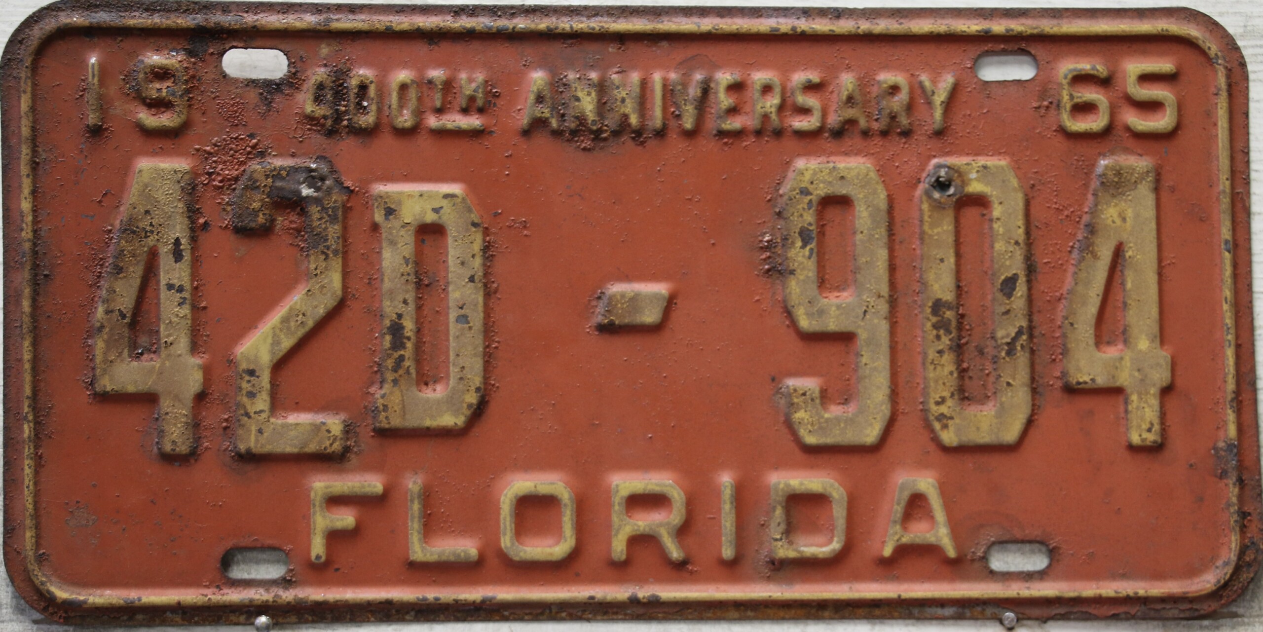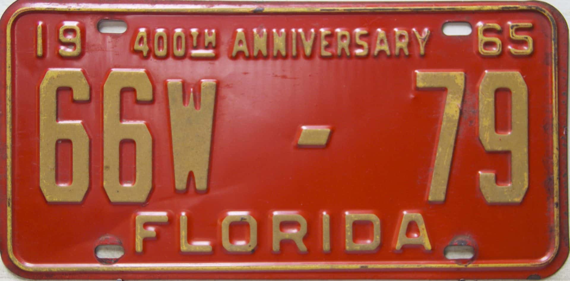 Don’t tell the indigenous inhabitants of Florida, but credit is given to Juan Ponce de Leon for ‘discovering’ Florida in 1565…so in 1965 Florida decided to honor that event by issuing a bright red plate with yellow letters and numbers (think Spanish hues)…as it also happened, I was in high school in 1965, about to sell my 1931 Model A Ford five-window coupe I had restored at our family’s gas station in Cutler, Florida…proceeds were to help fund my first year in college…it had a 1965 Florida plate on it, and I clearly remember focusing on it as the buyer drove it away…so 1965 Florida plates have always been among my favorites…with 67 counties in Florida, our plates for many years always carried the rank by population/registrations, and as you can see, we’re still missing Hamilton (56) and Lafayette (62) Counties…help!