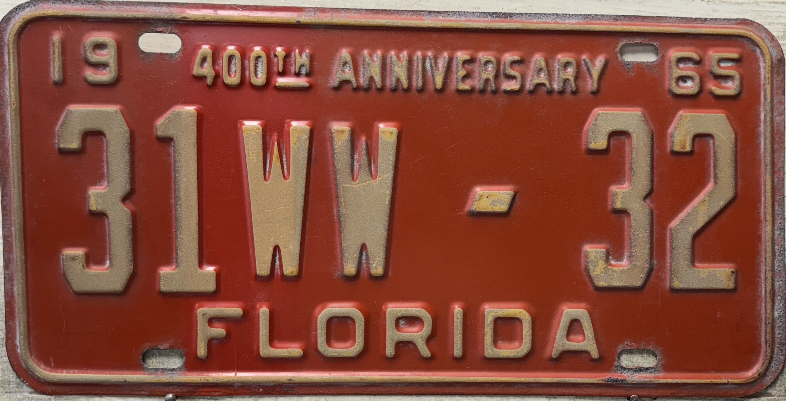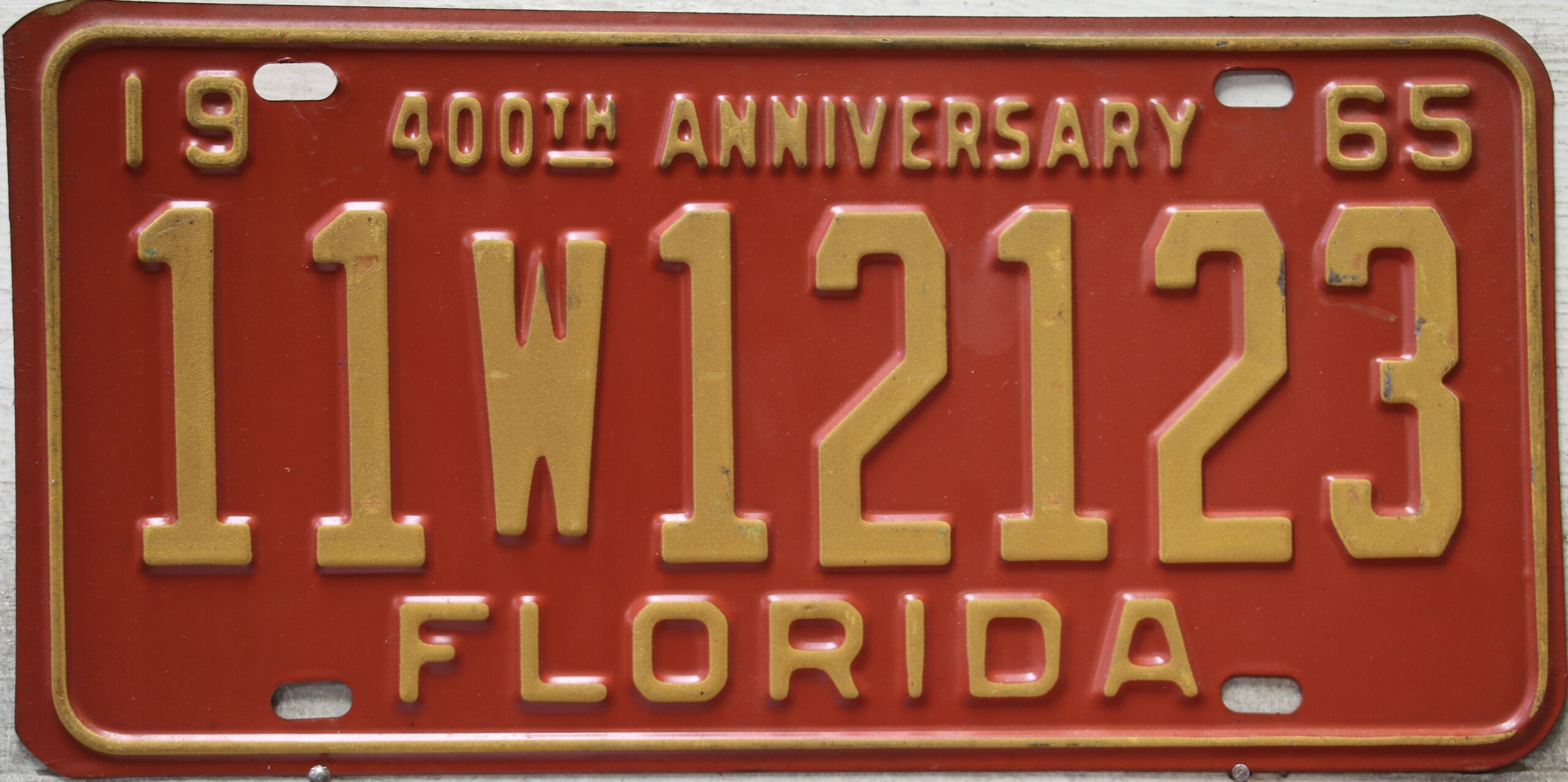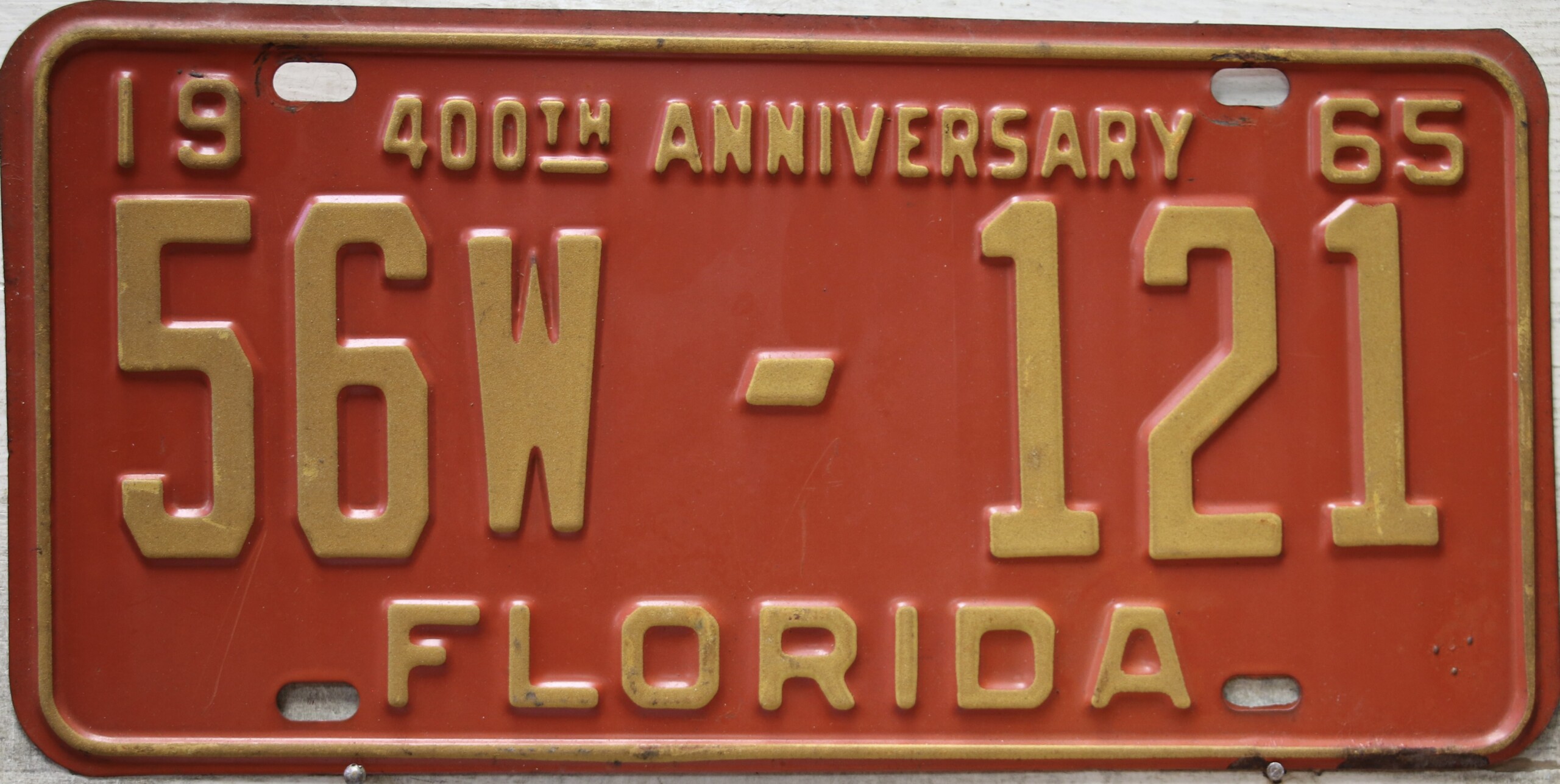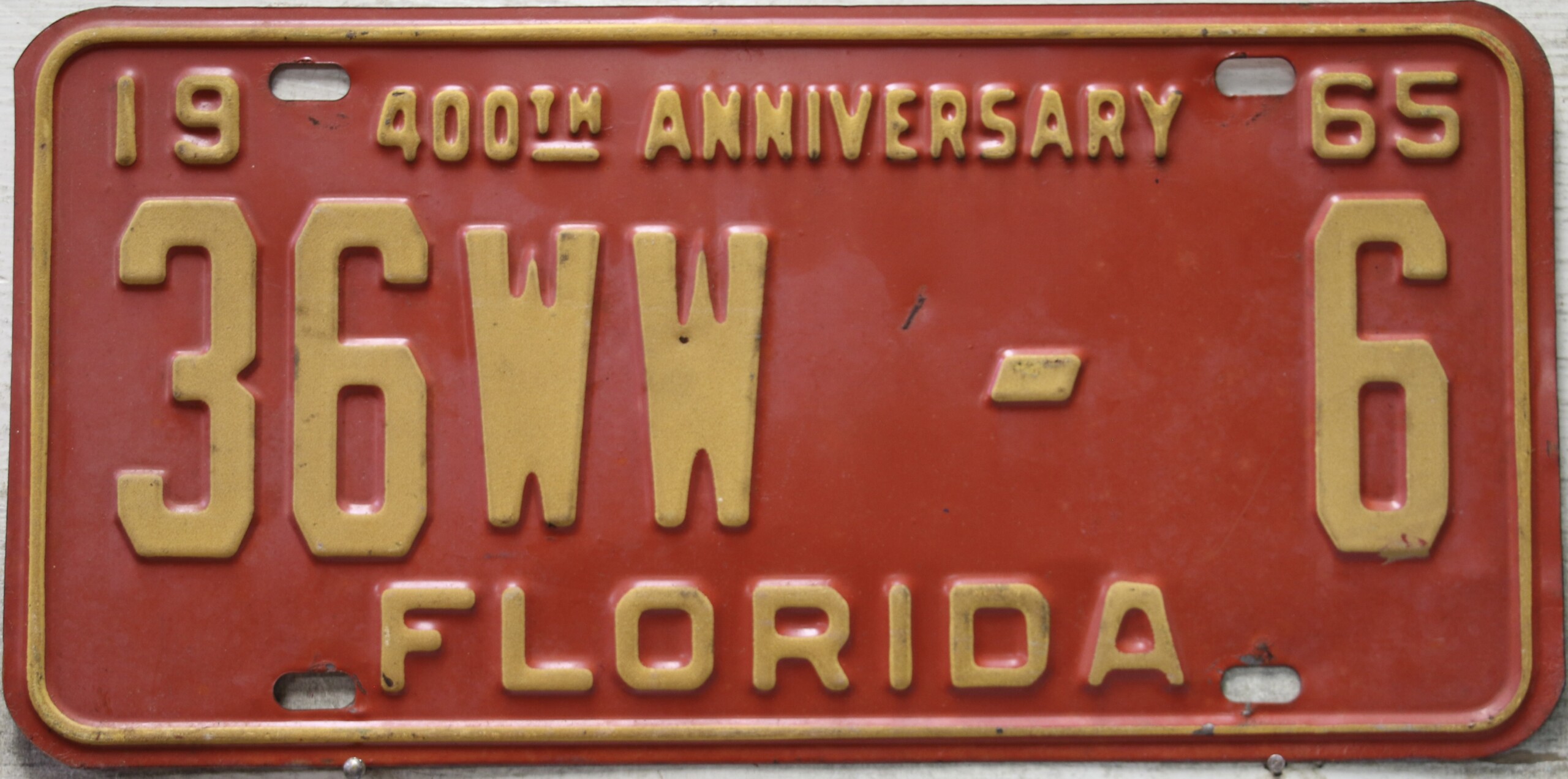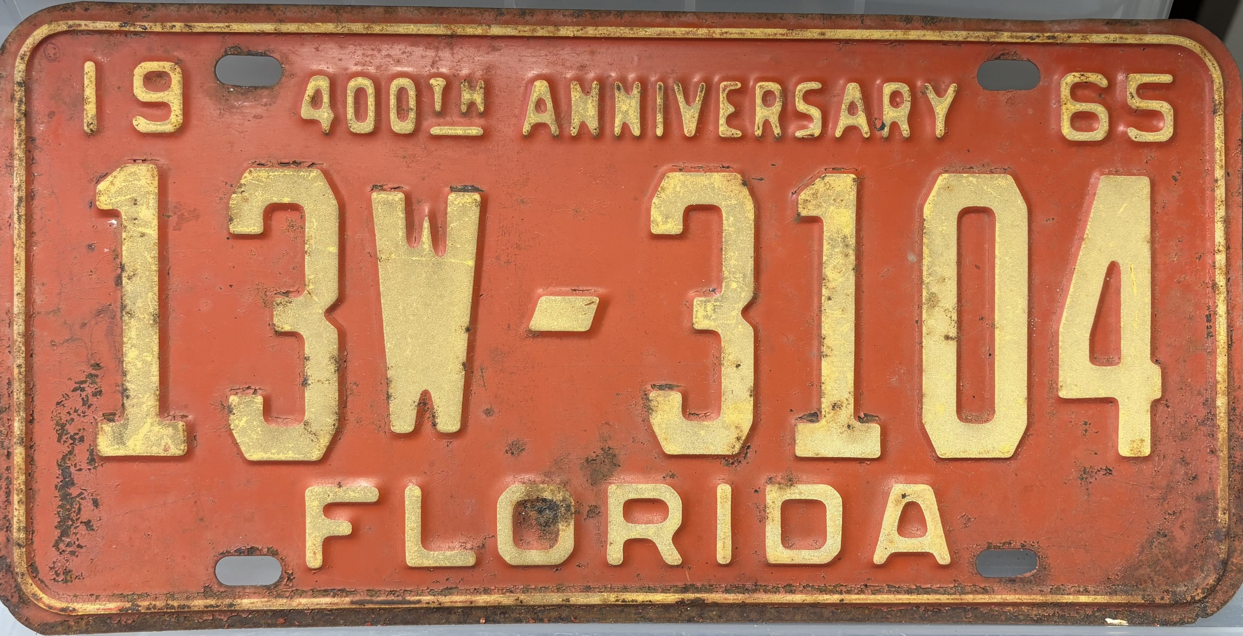 Don’t tell the indigenous inhabitants of Florida, but credit is given to Juan Ponce de Leon for ‘discovering’ Florida in 1565…so in 1965 Florida decided to honor that event by issuing a bright red plate with yellow letters and numbers (think Spanish hues)…as it also happened, I was in high school in 1965, about to sell my 1931 Model A Ford five-window coupe I had restored at our family’s gas station in Cutler, Florida…proceeds were to help fund my first year in college…it had a 1965 Florida plate on it, and I clearly remember focusing on it as the buyer drove it away…so 1965 Florida plates have always been among my favorites…with 67 counties in Florida, our plates for many years always carried the rank by population/registrations, and as you can see, we’re still missing Hamilton (56) and Lafayette (62) Counties…help!
