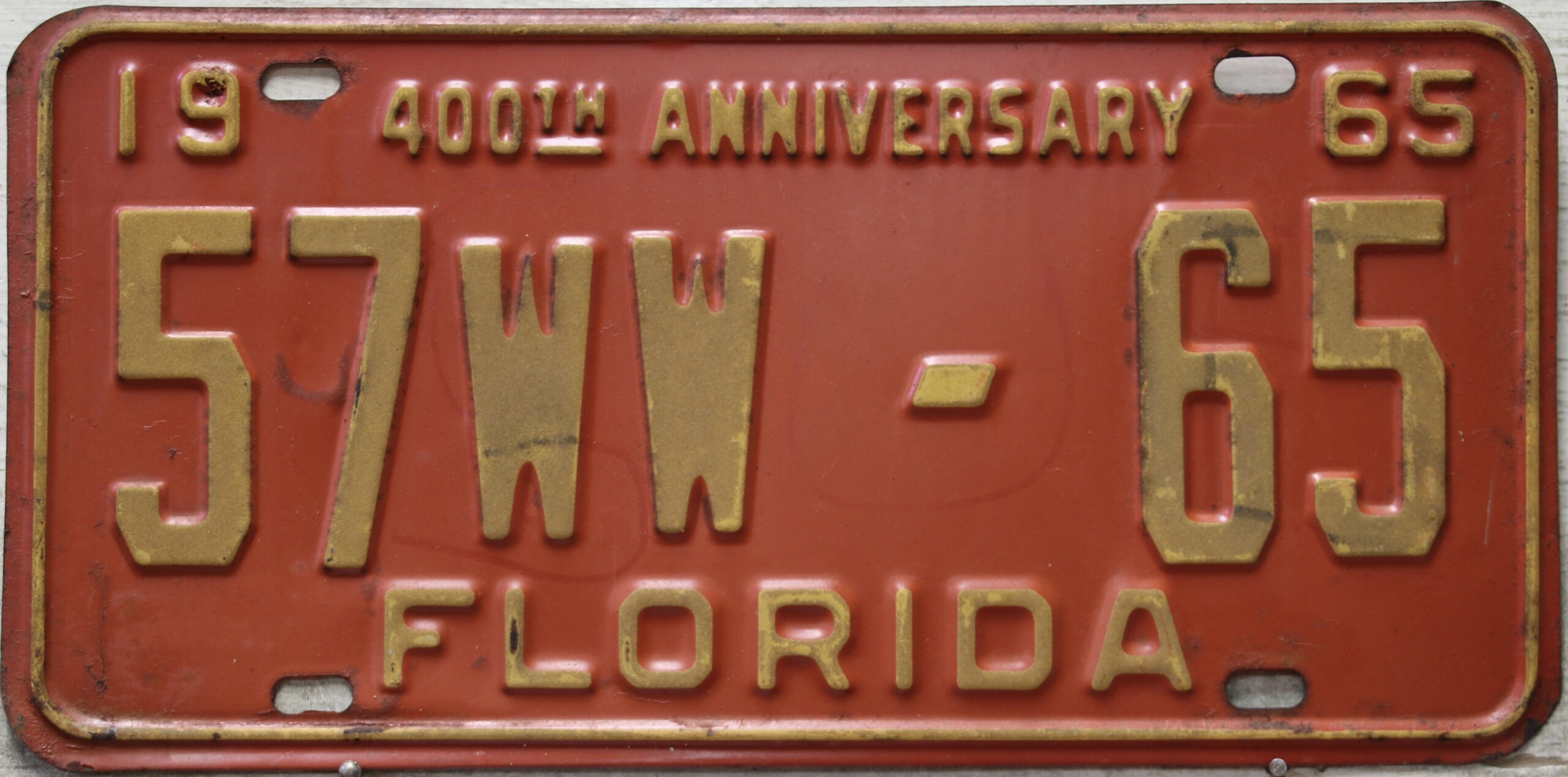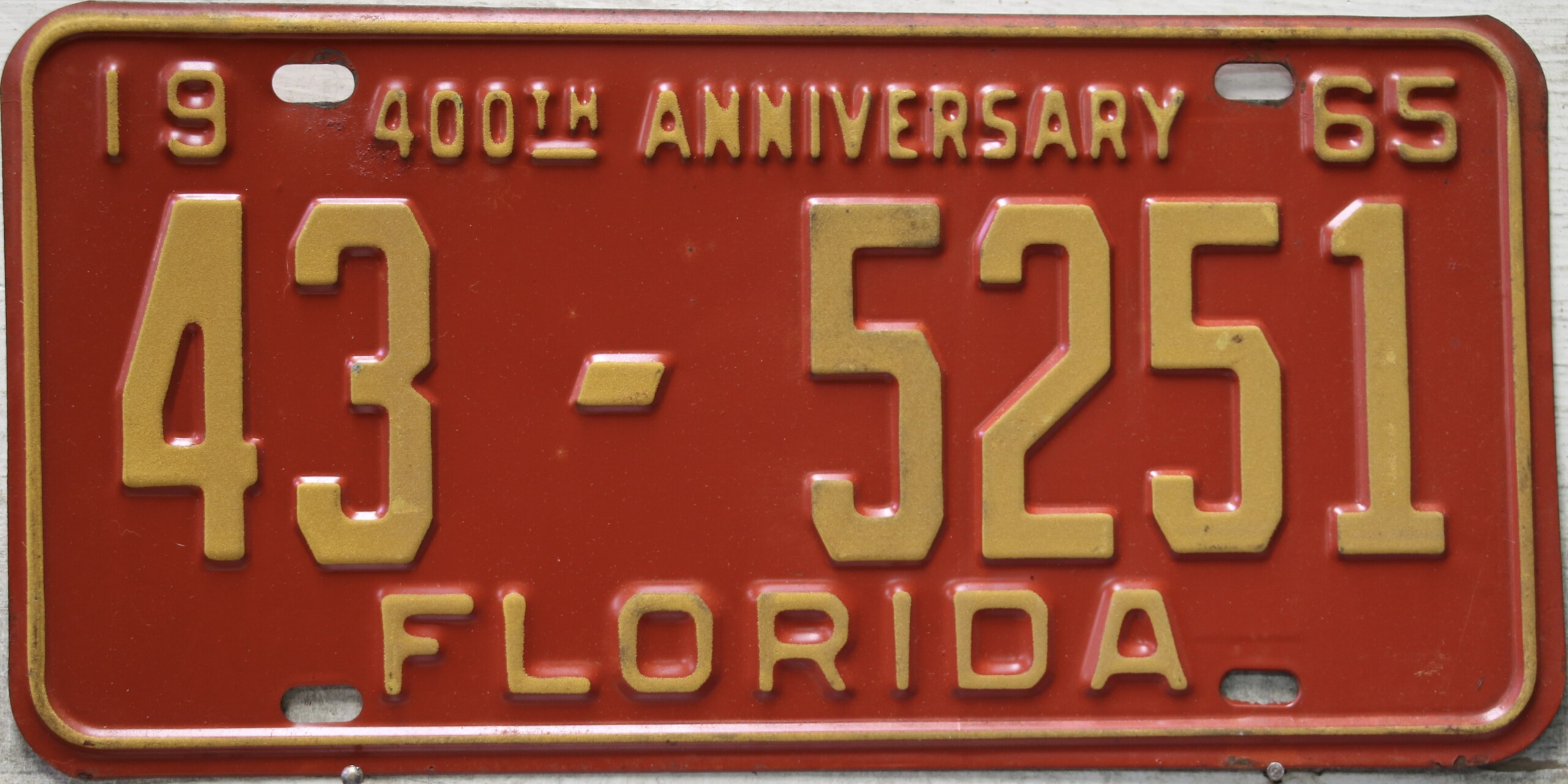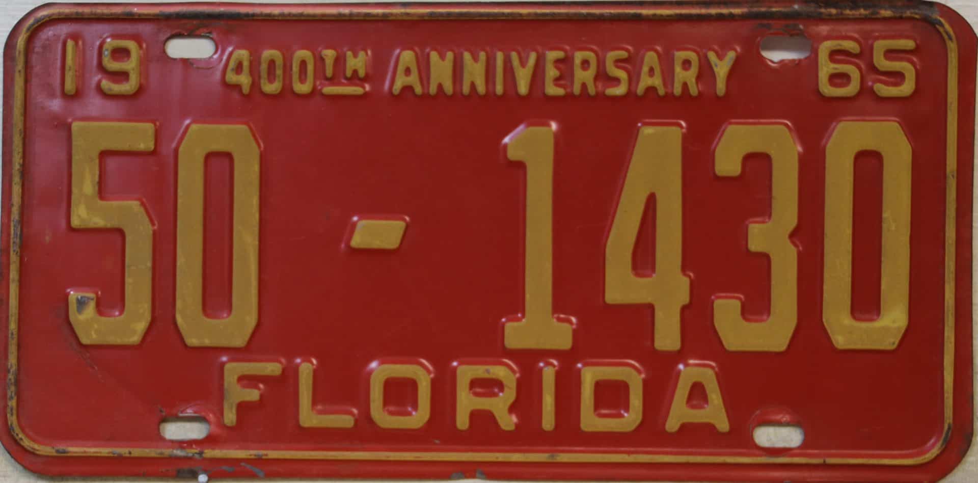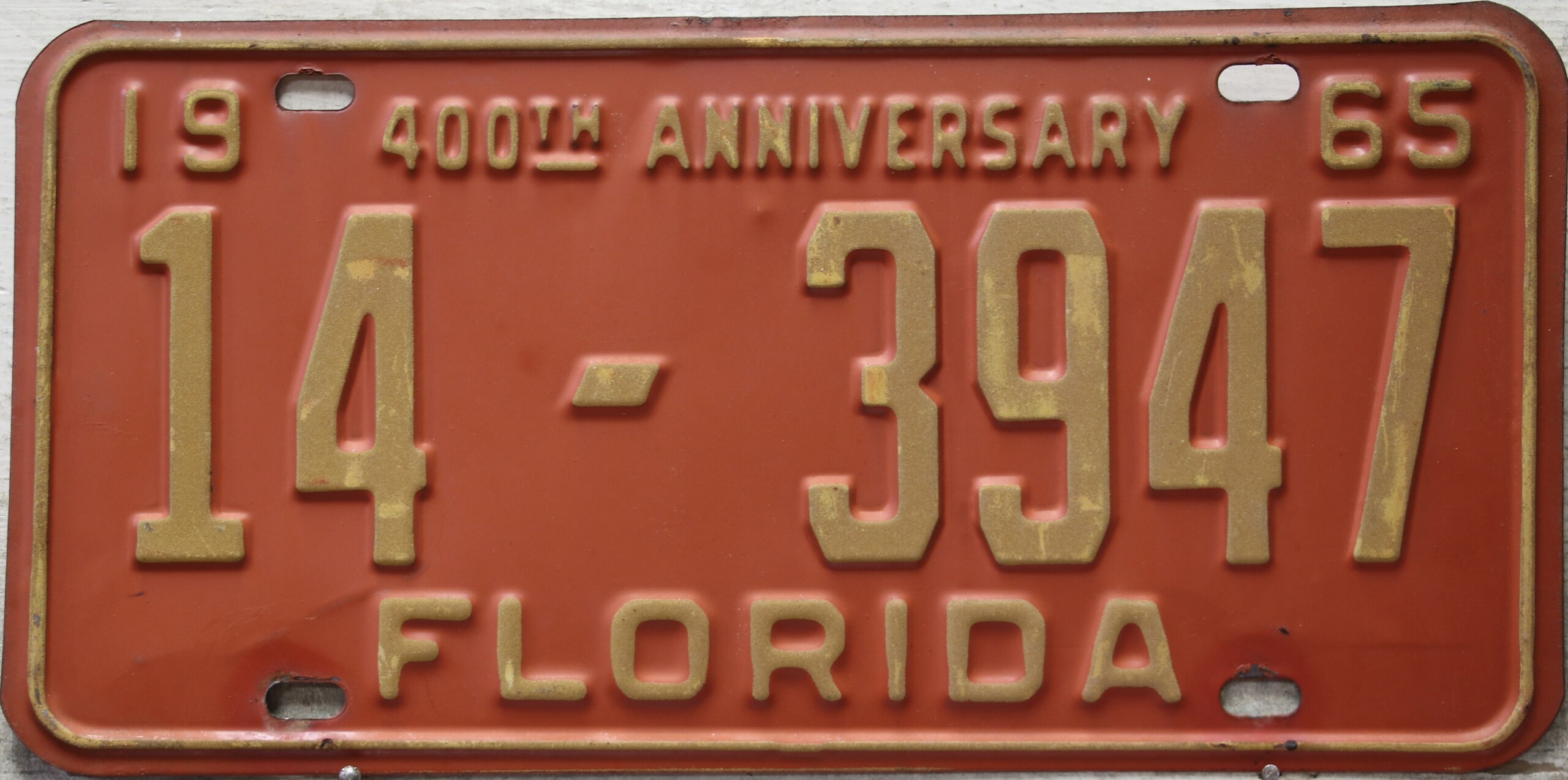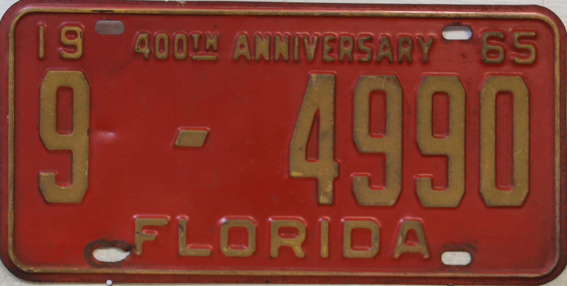 Don’t tell the indigenous inhabitants of Florida, but credit is given to Juan Ponce de Leon for ‘discovering’ Florida in 1565…so in 1965 Florida decided to honor that event by issuing a bright red plate with yellow letters and numbers (think Spanish hues)…as it also happened, I was in high school in 1965, about to sell my 1931 Model A Ford five-window coupe I had restored at our family’s gas station in Cutler, Florida…proceeds were to help fund my first year in college…it had a 1965 Florida plate on it, and I clearly remember focusing on it as the buyer drove it away…so 1965 Florida plates have always been among my favorites…with 67 counties in Florida, our plates for many years always carried the rank by population/registrations, and as you can see, we’re still missing Hamilton (56) and Lafayette (62) Counties…help!