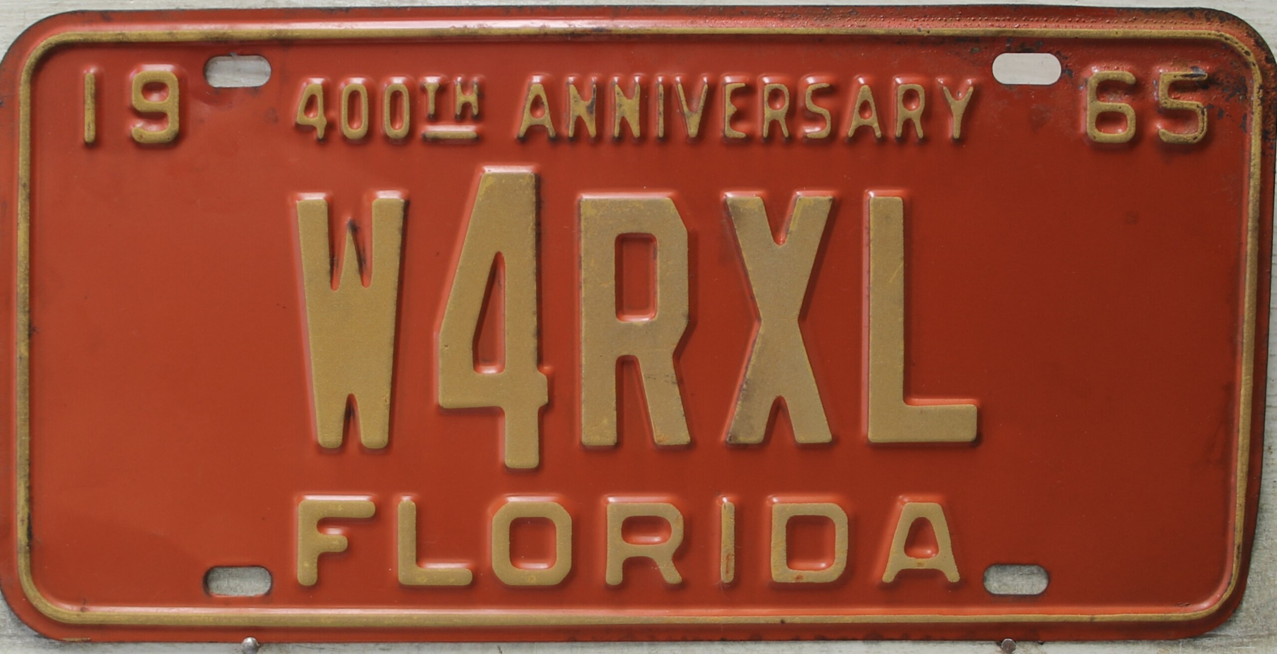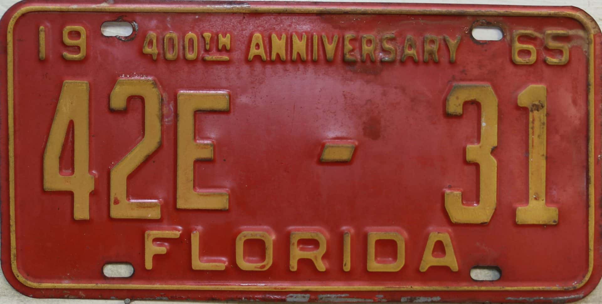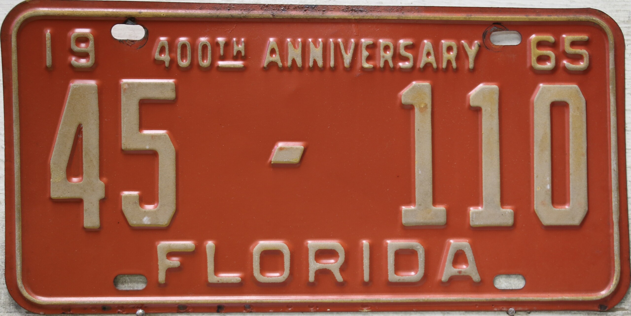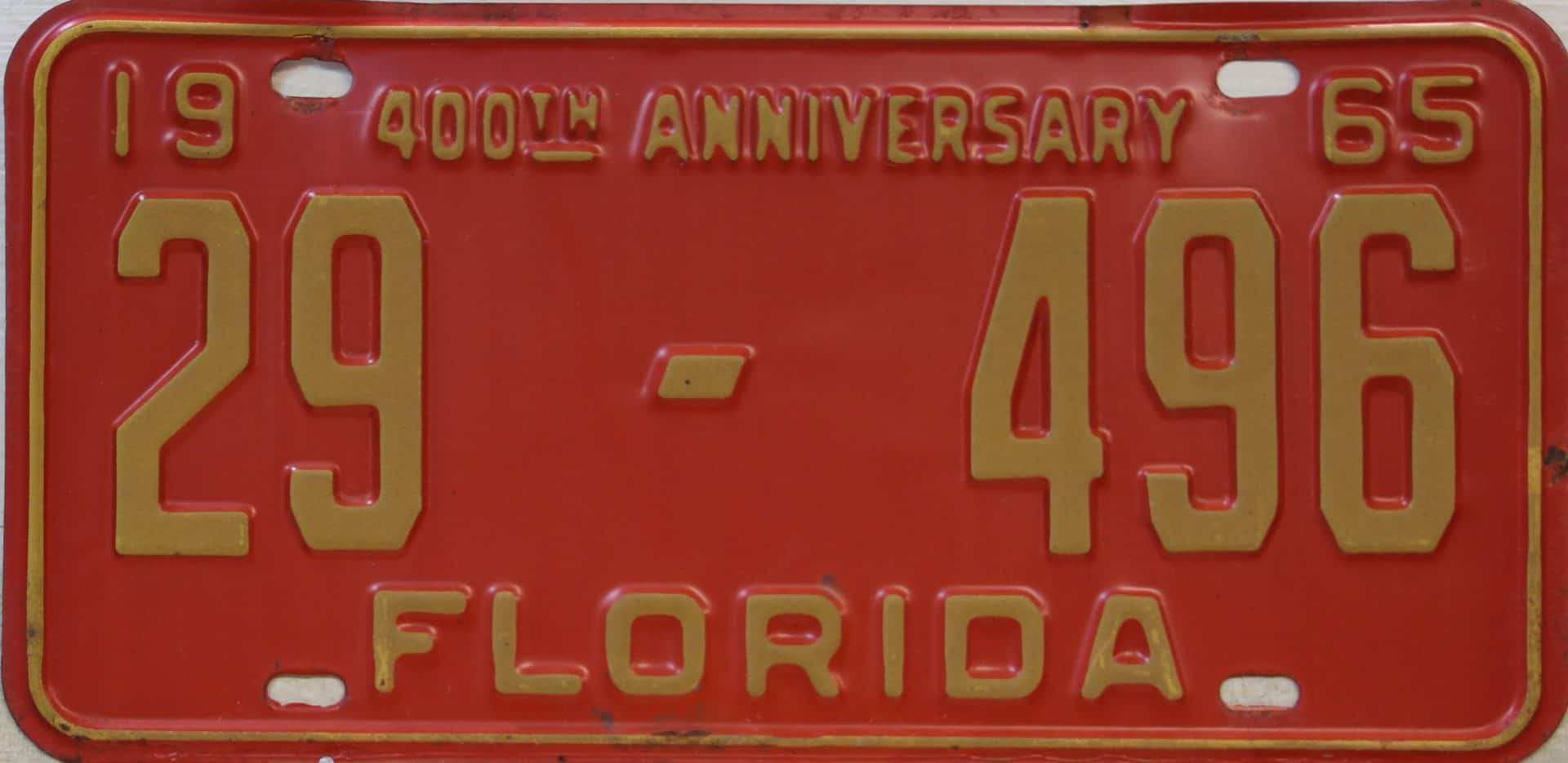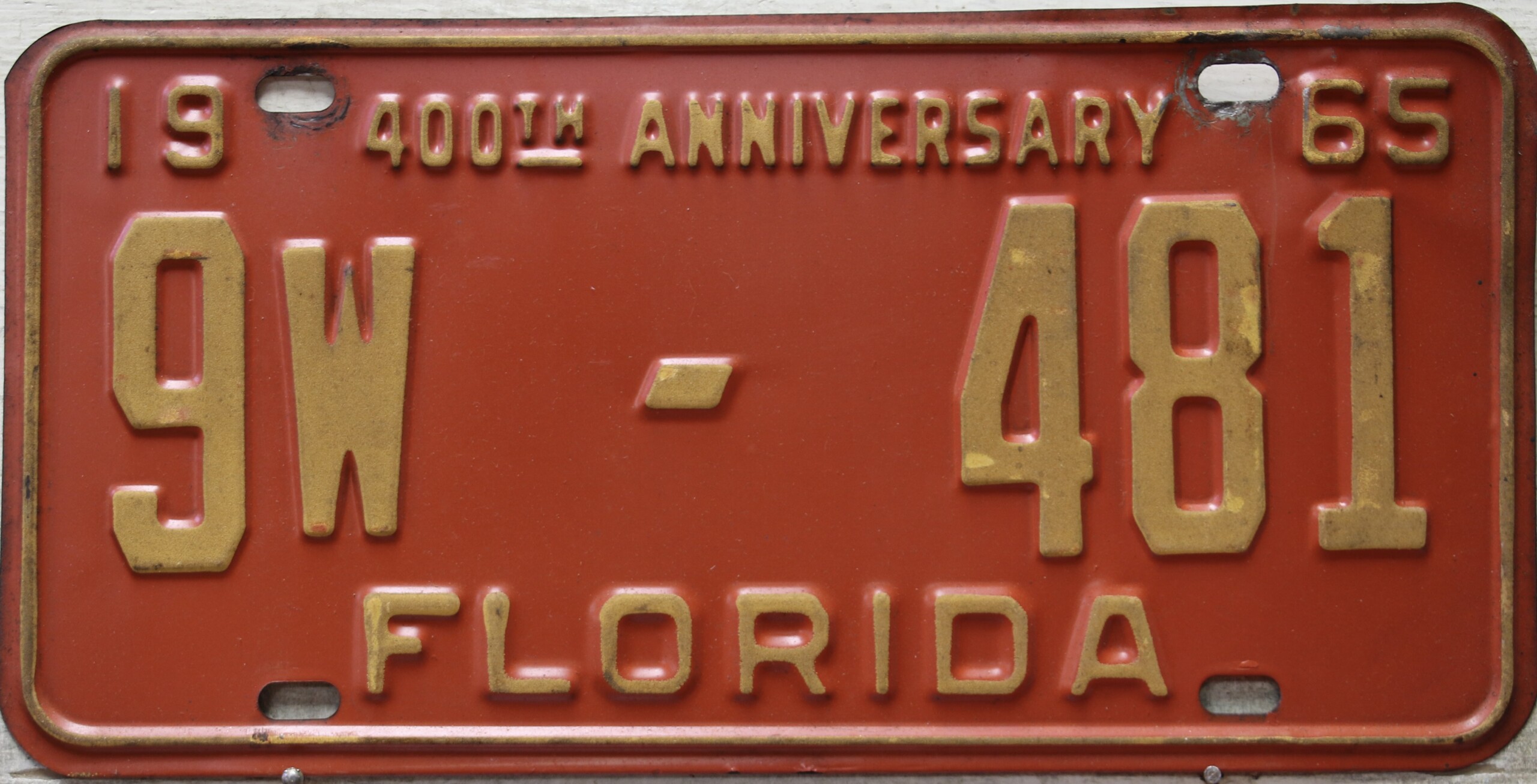 Don’t tell the indigenous inhabitants of Florida, but credit is given to Juan Ponce de Leon for ‘discovering’ Florida in 1565…so in 1965 Florida decided to honor that event by issuing a bright red plate with yellow letters and numbers (think Spanish hues)…as it also happened, I was in high school in 1965, about to sell my 1931 Model A Ford five-window coupe I had restored at our family’s gas station in Cutler, Florida…proceeds were to help fund my first year in college…it had a 1965 Florida plate on it, and I clearly remember focusing on it as the buyer drove it away…so 1965 Florida plates have always been among my favorites…with 67 counties in Florida, our plates for many years always carried the rank by population/registrations, and as you can see, we’re still missing Hamilton (56) and Lafayette (62) Counties…help!