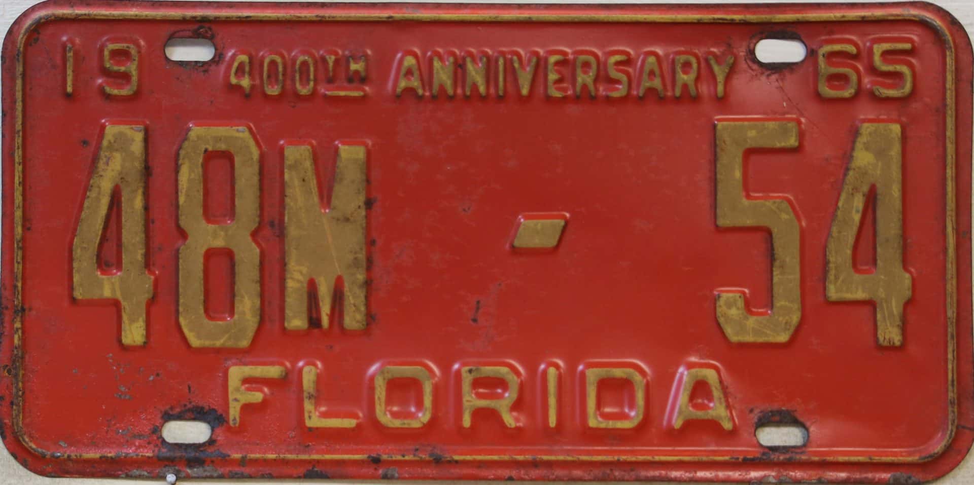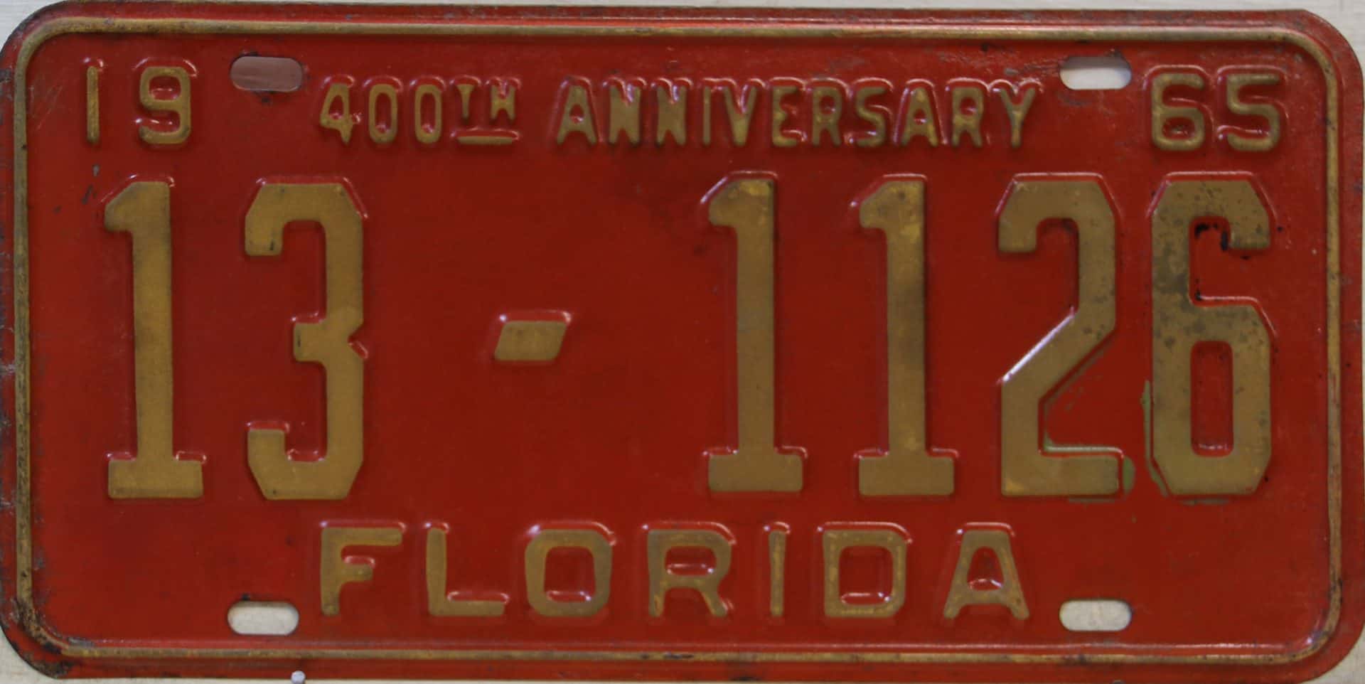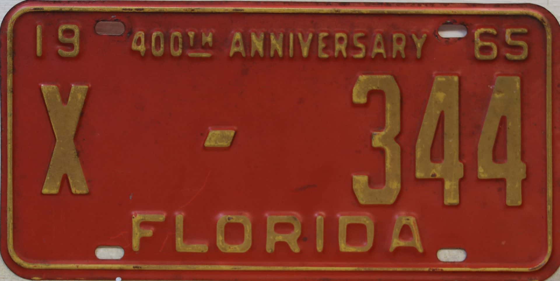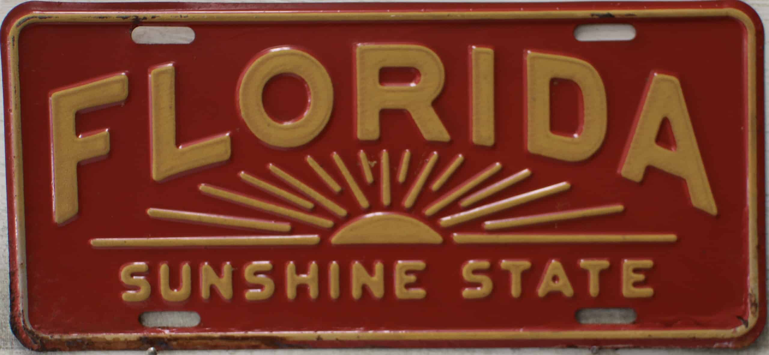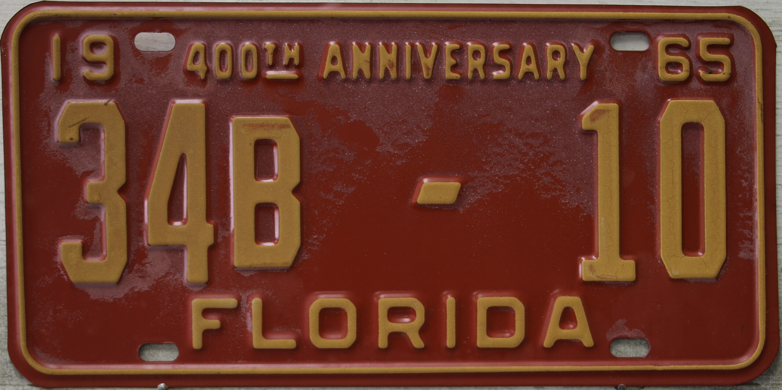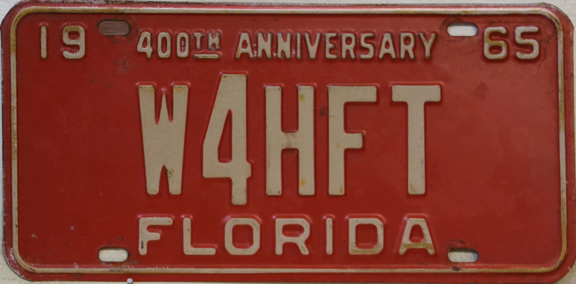 Don’t tell the indigenous inhabitants of Florida, but credit is given to Juan Ponce de Leon for ‘discovering’ Florida in 1565…so in 1965 Florida decided to honor that event by issuing a bright red plate with yellow letters and numbers (think Spanish hues)…as it also happened, I was in high school in 1965, about to sell my 1931 Model A Ford five-window coupe I had restored at our family’s gas station in Cutler, Florida…proceeds were to help fund my first year in college…it had a 1965 Florida plate on it, and I clearly remember focusing on it as the buyer drove it away…so 1965 Florida plates have always been among my favorites…with 67 counties in Florida, our plates for many years always carried the rank by population/registrations, and as you can see, we’re still missing Hamilton (56) and Lafayette (62) Counties…help!