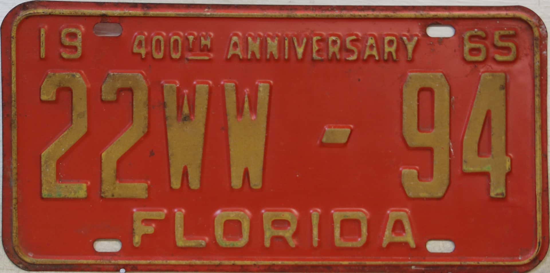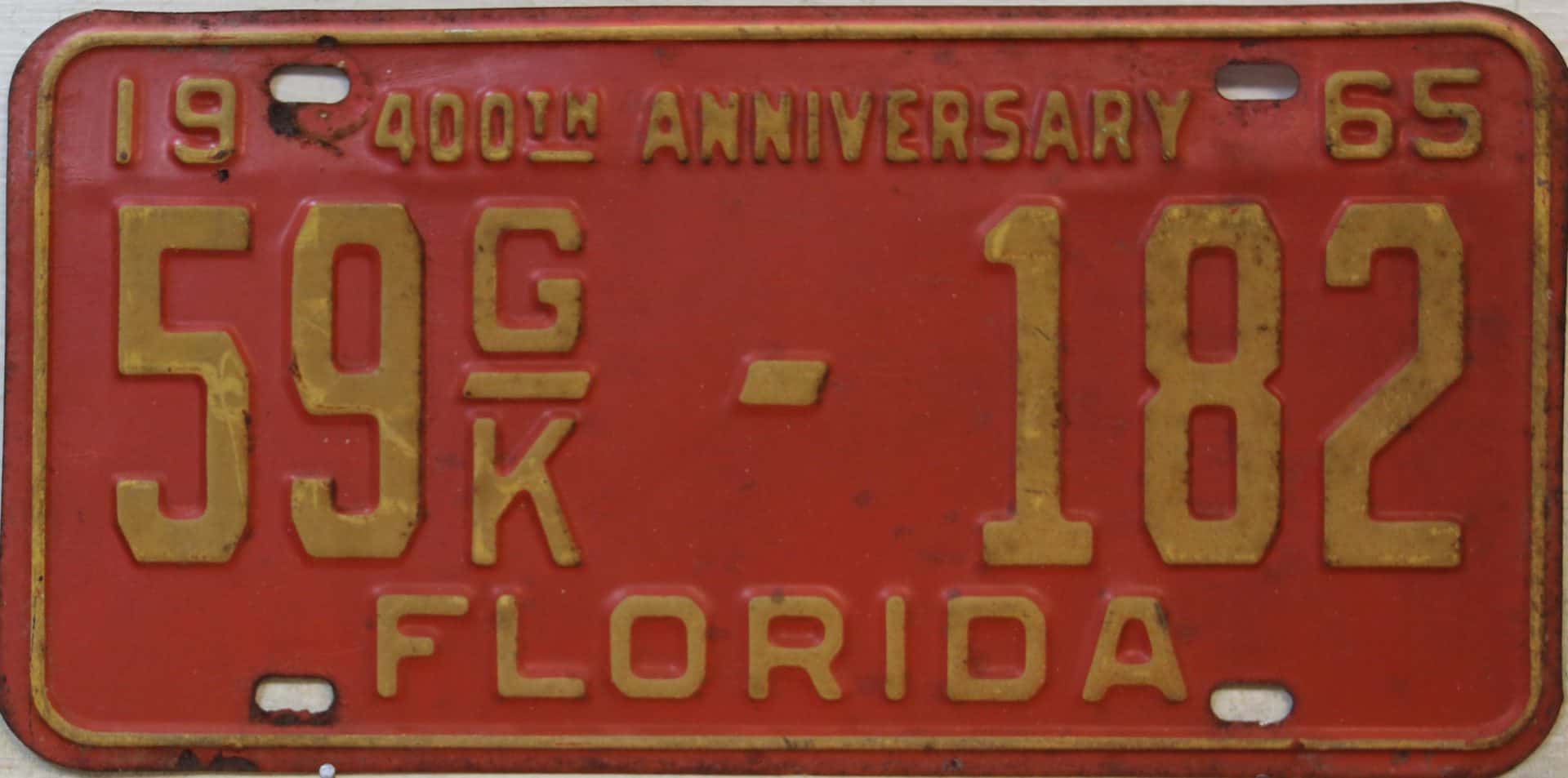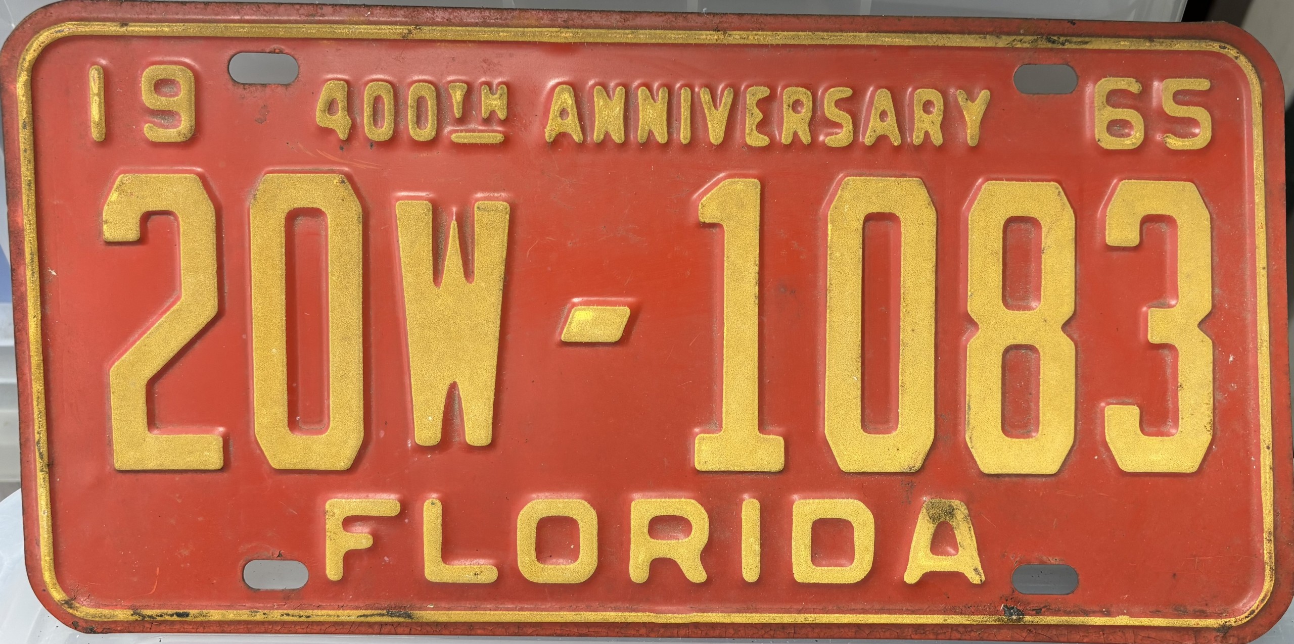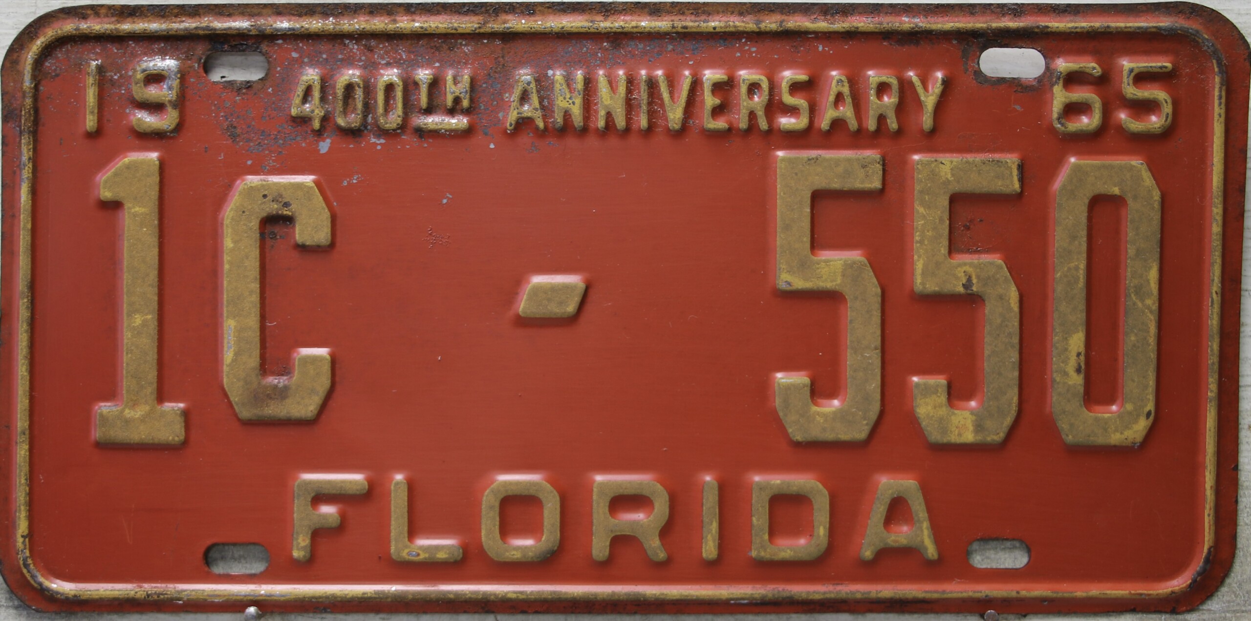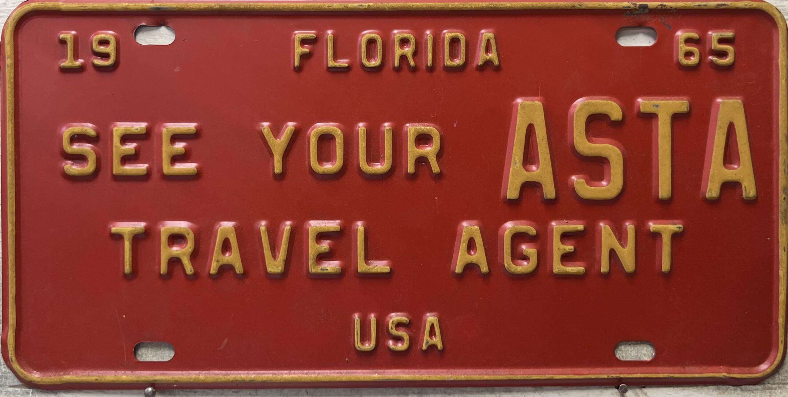 Don’t tell the indigenous inhabitants of Florida, but credit is given to Juan Ponce de Leon for ‘discovering’ Florida in 1565…so in 1965 Florida decided to honor that event by issuing a bright red plate with yellow letters and numbers (think Spanish hues)…as it also happened, I was in high school in 1965, about to sell my 1931 Model A Ford five-window coupe I had restored at our family’s gas station in Cutler, Florida…proceeds were to help fund my first year in college…it had a 1965 Florida plate on it, and I clearly remember focusing on it as the buyer drove it away…so 1965 Florida plates have always been among my favorites…with 67 counties in Florida, our plates for many years always carried the rank by population/registrations, and as you can see, we’re still missing Hamilton (56) and Lafayette (62) Counties…help!